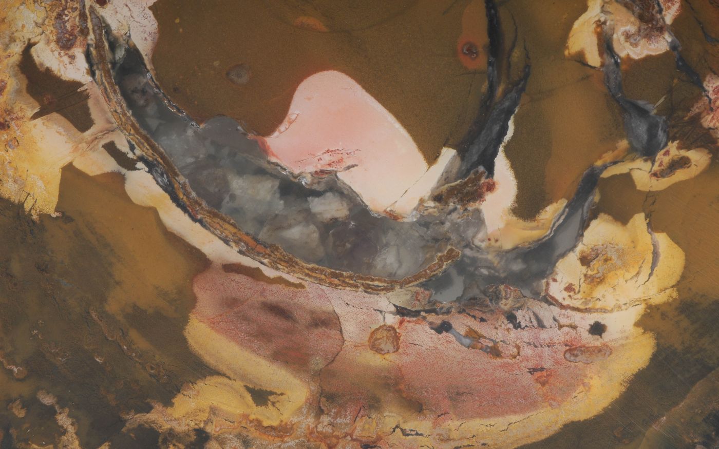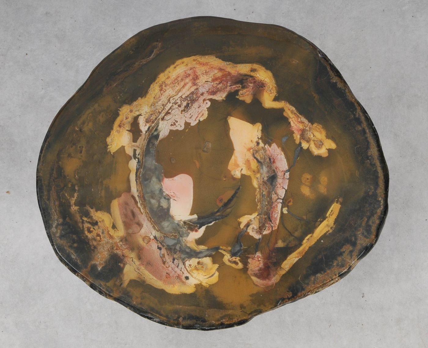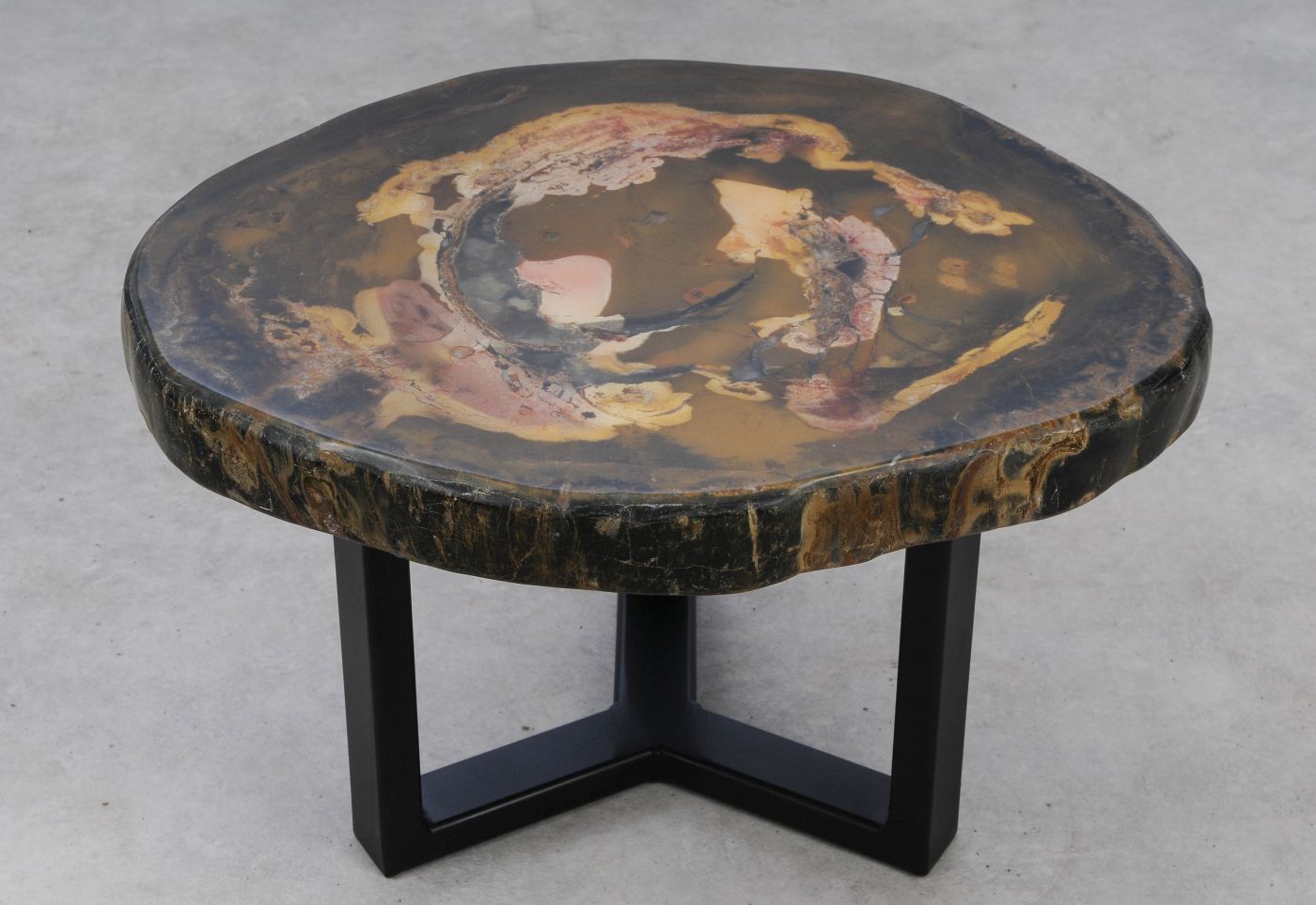 Deze unieke salontafel van versteend hout past in ieder interieur. Het tafelblad is gezaagd uit een grote versteende boom, die ongeveer 20 miljoen jaar geleden geleefd heeft. De kleuren zijn bepaald door de mineralen die het hout van deze boom vervangen hebben.