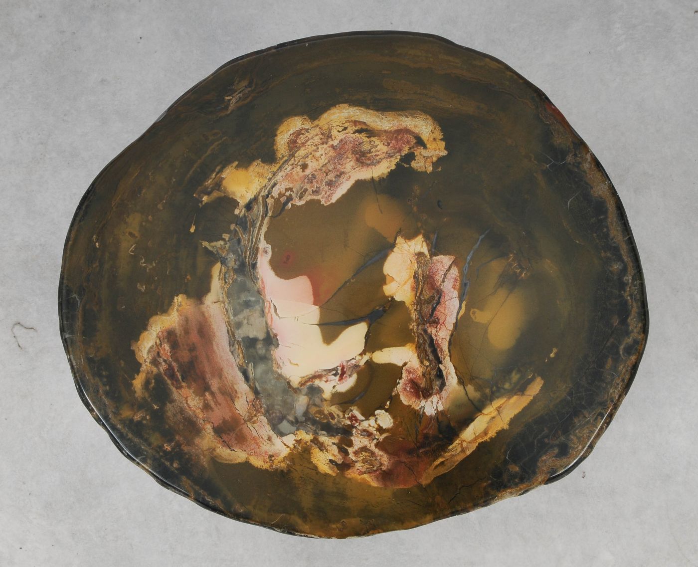 Deze unieke salontafel van versteend hout past in ieder interieur. Het tafelblad is gezaagd uit een grote versteende boom, die ongeveer 20 miljoen jaar geleden geleefd heeft. De kleuren zijn bepaald door de mineralen die het hout van deze boom vervangen hebben.