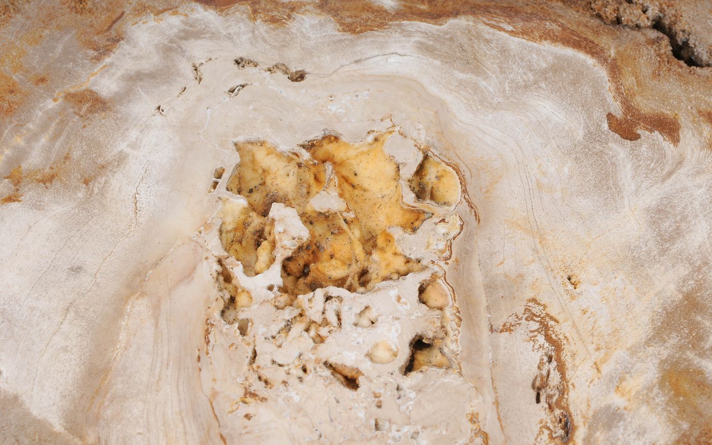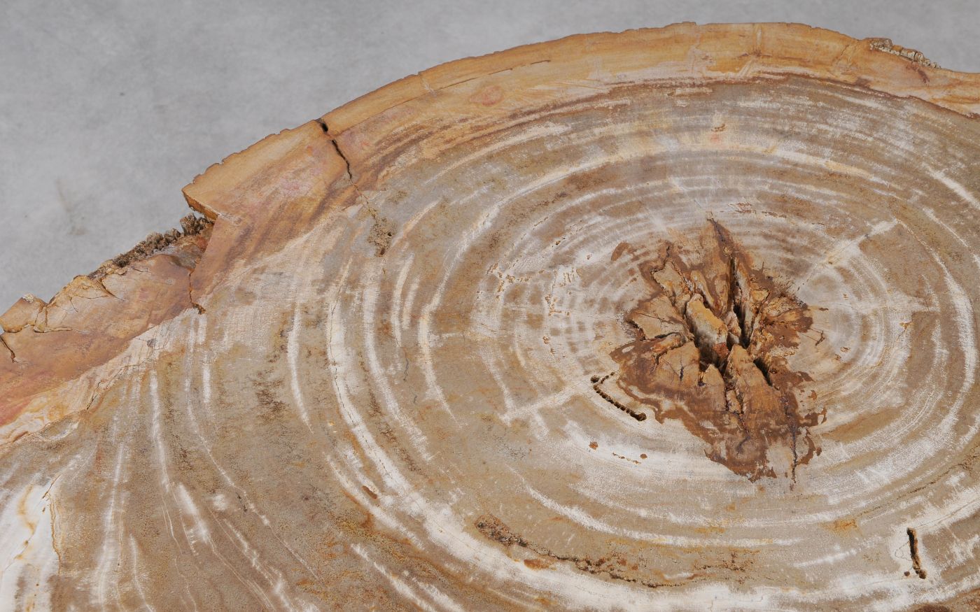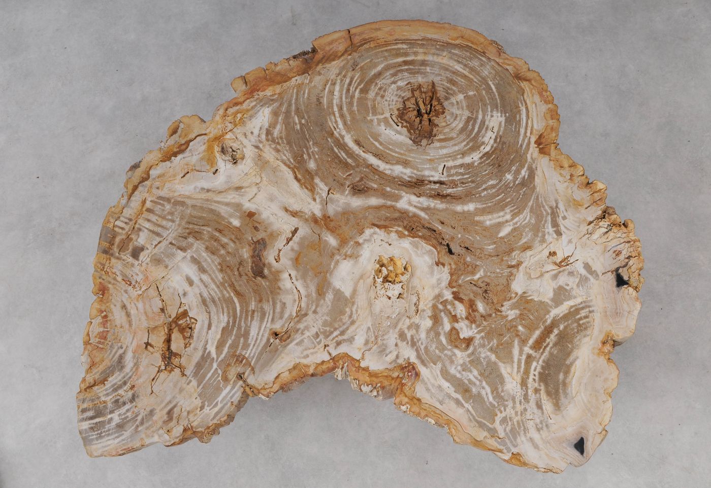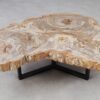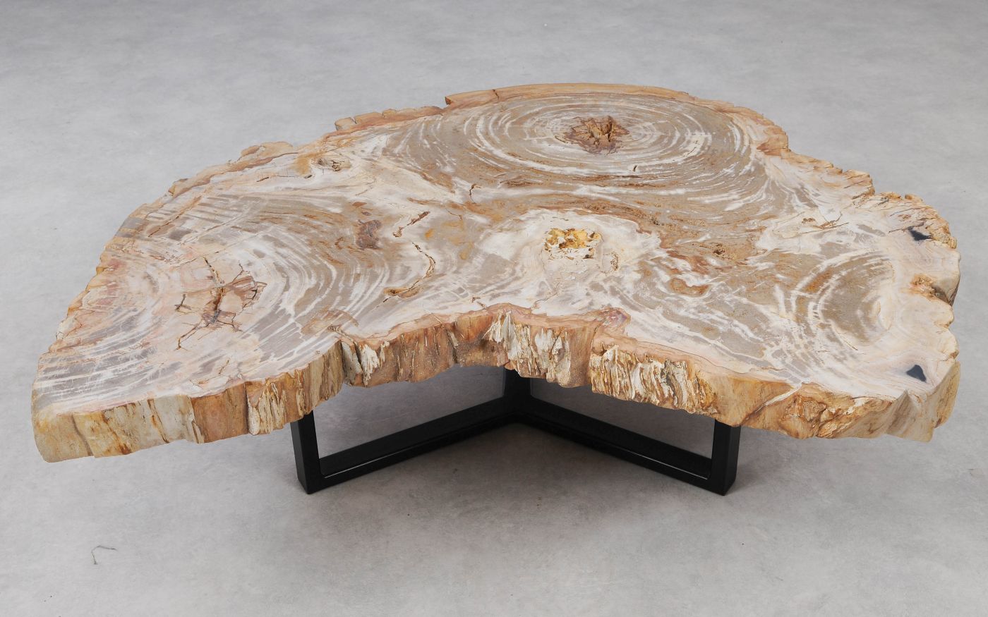 Deze unieke salontafel van versteend hout past in ieder interieur. Het tafelblad is gezaagd uit een grote versteende boom, die ongeveer 20 miljoen jaar geleden geleefd heeft. De kleuren zijn bepaald door de mineralen die het hout van deze boom vervangen hebben.