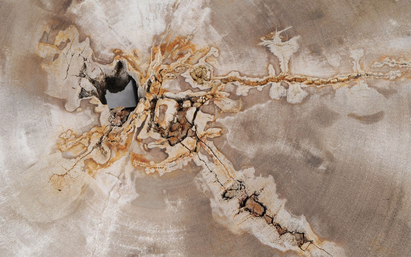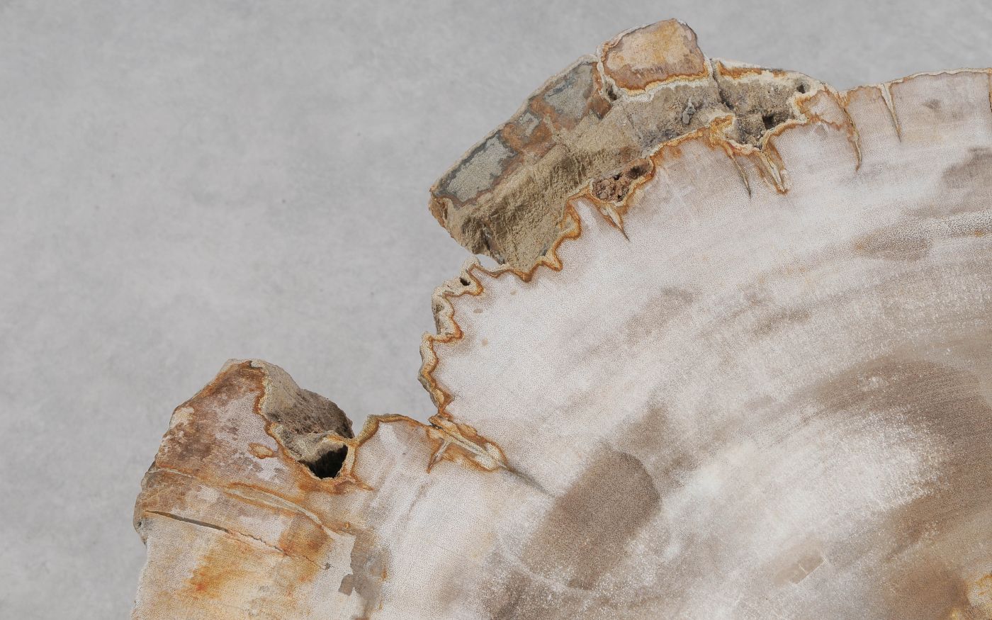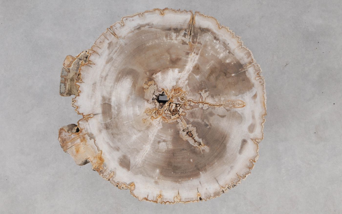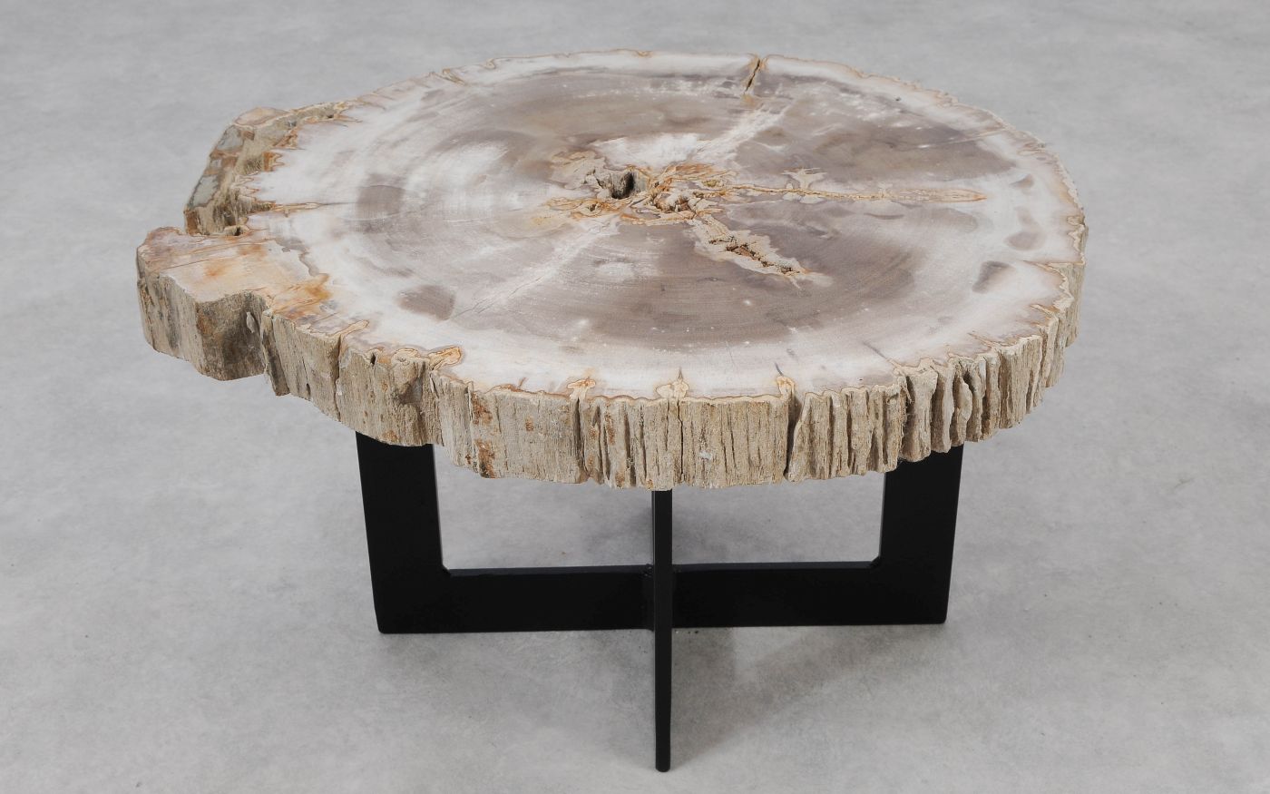 Deze unieke salontafel van versteend hout past in ieder interieur. Het tafelblad is gezaagd uit een grote versteende boom, die ongeveer 20 miljoen jaar geleden geleefd heeft. De kleuren zijn bepaald door de mineralen die het hout van deze boom vervangen hebben.