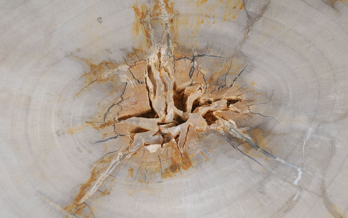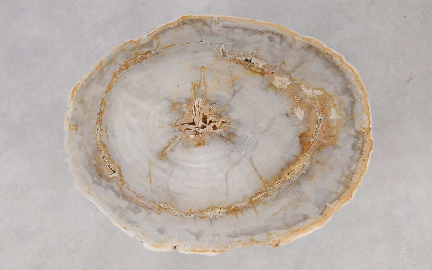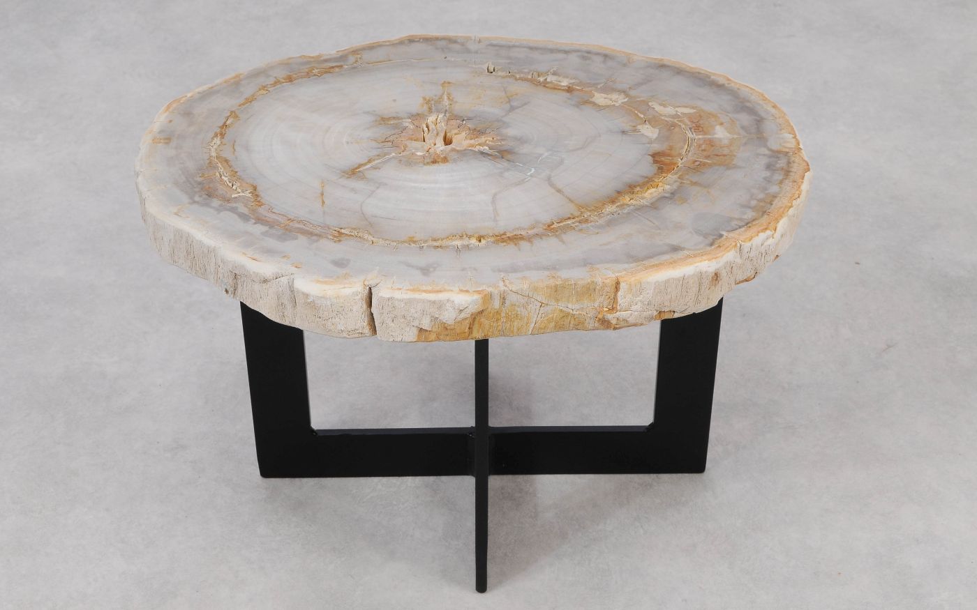 Deze unieke salontafel van versteend hout past in ieder interieur. Het tafelblad is gezaagd uit een grote versteende boom, die ongeveer 20 miljoen jaar geleden geleefd heeft. De kleuren zijn bepaald door de mineralen die het hout van deze boom vervangen hebben.