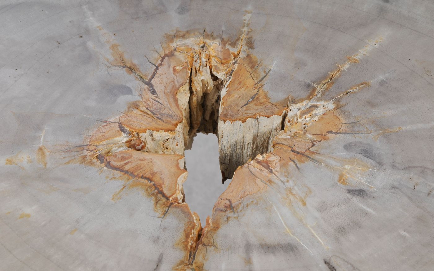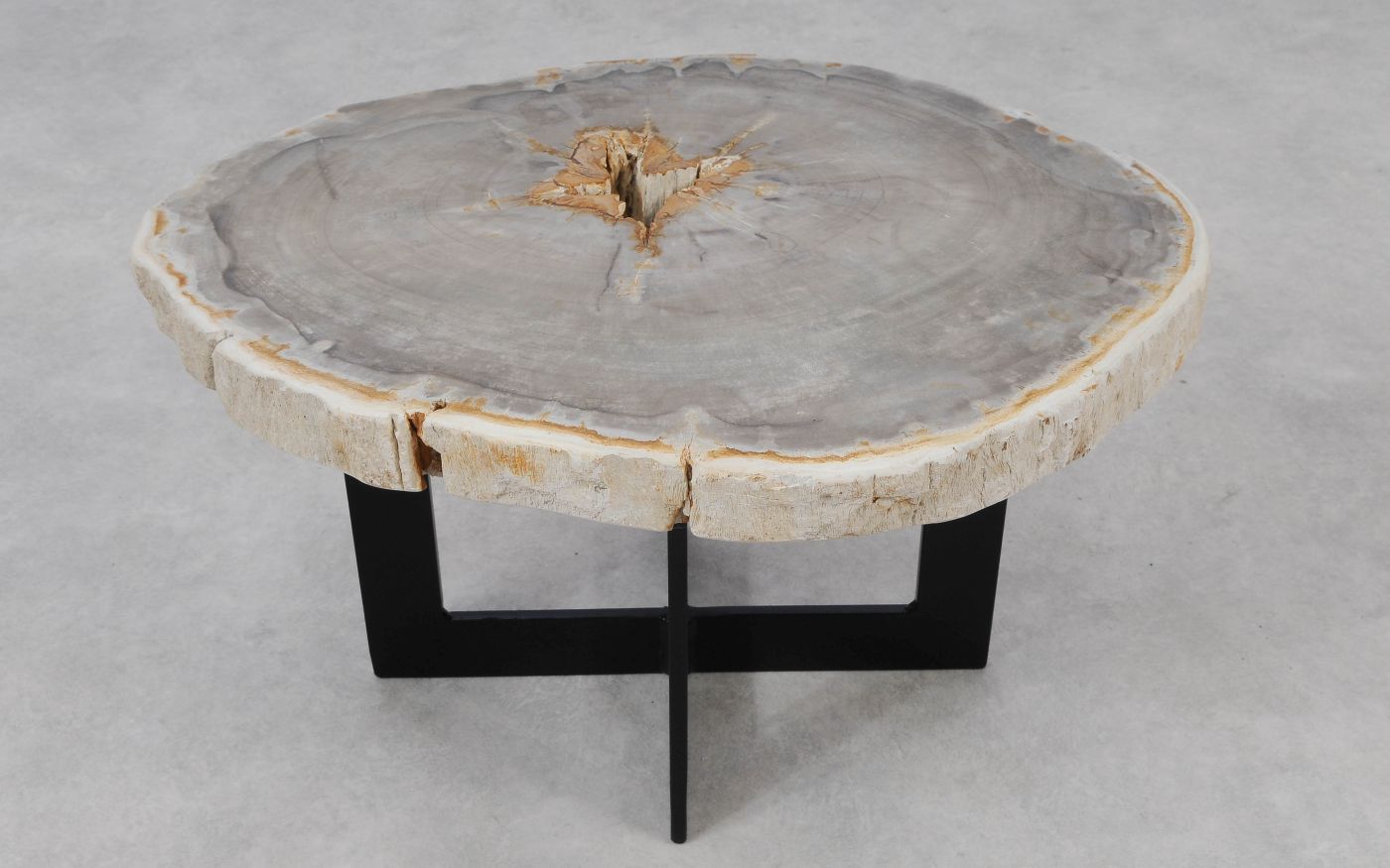 Deze unieke salontafel van versteend hout past in ieder interieur. Het tafelblad is gezaagd uit een grote versteende boom, die ongeveer 20 miljoen jaar geleden geleefd heeft. De kleuren zijn bepaald door de mineralen die het hout van deze boom vervangen hebben.
