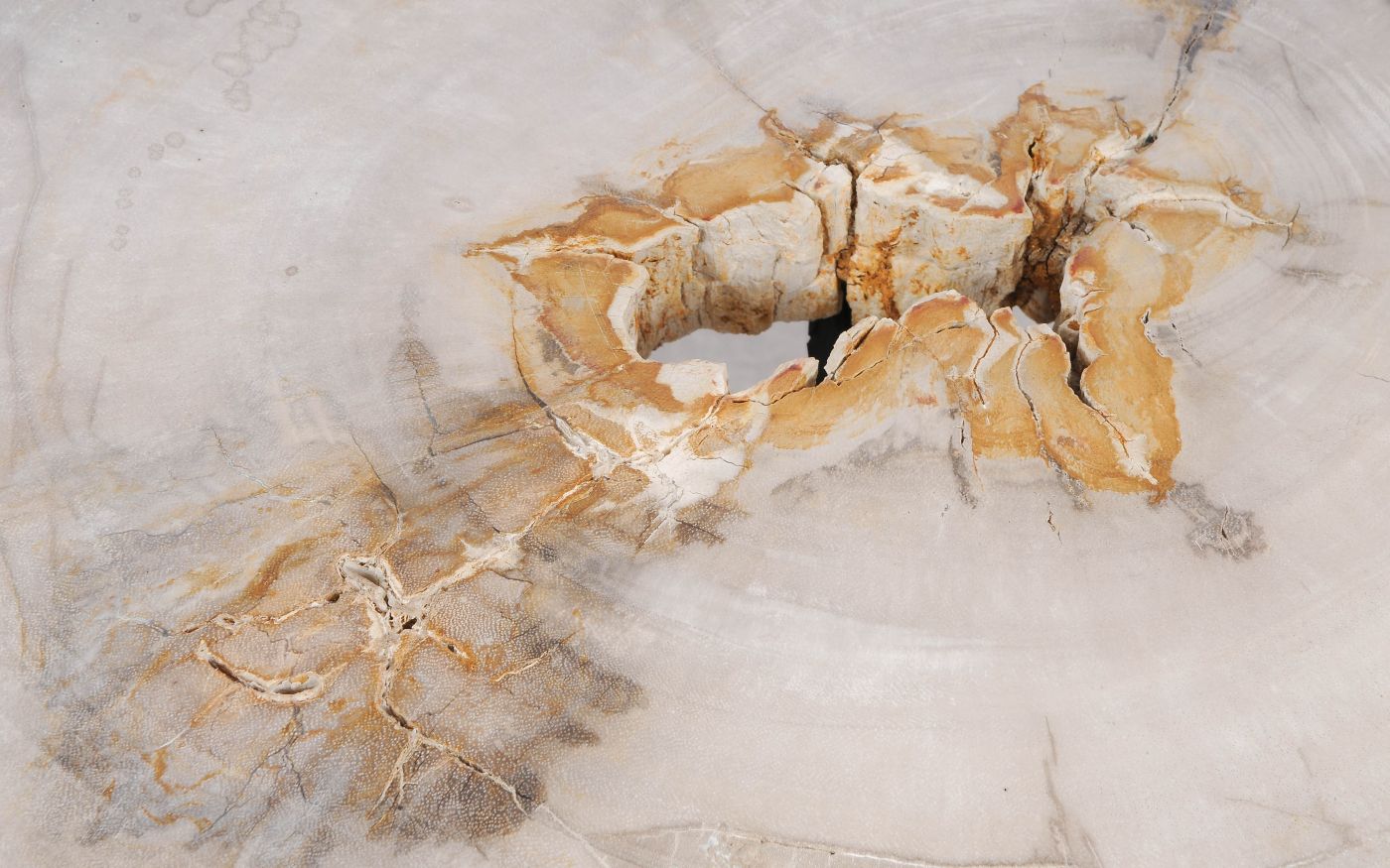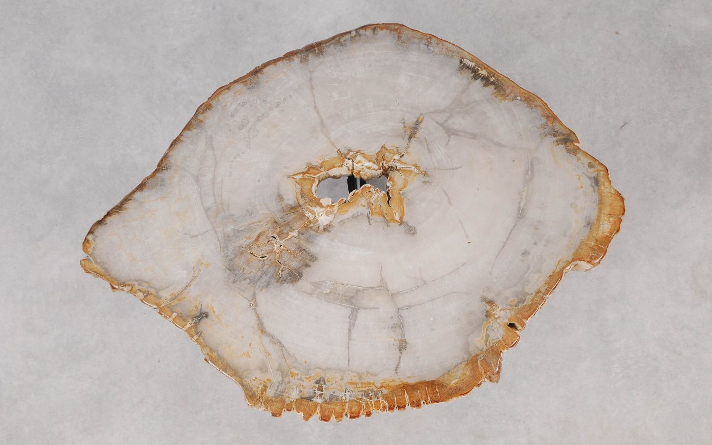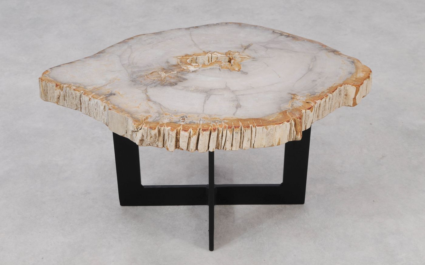 Deze unieke salontafel van versteend hout past in ieder interieur. Het tafelblad is gezaagd uit een grote versteende boom, die ongeveer 20 miljoen jaar geleden geleefd heeft. De kleuren zijn bepaald door de mineralen die het hout van deze boom vervangen hebben.