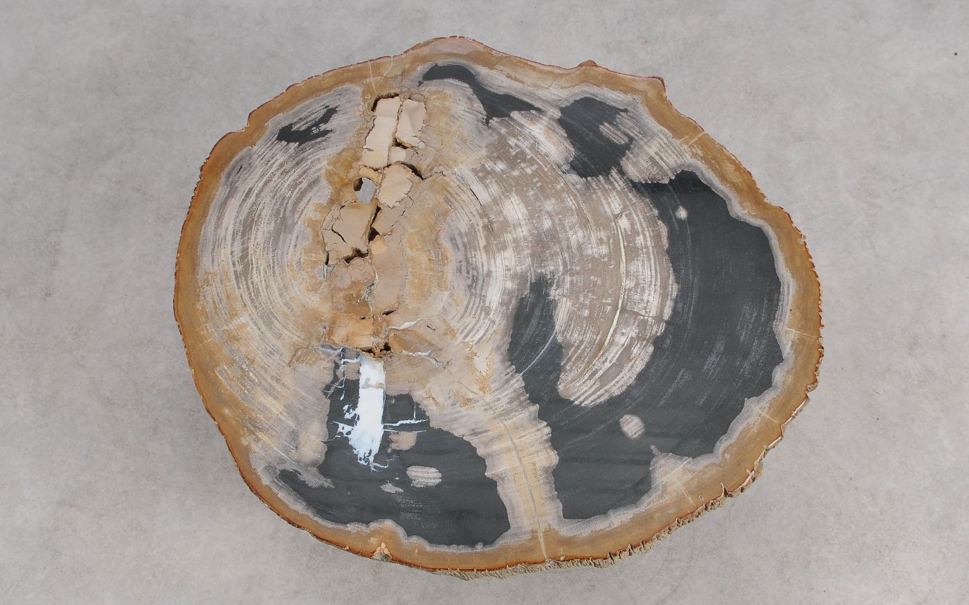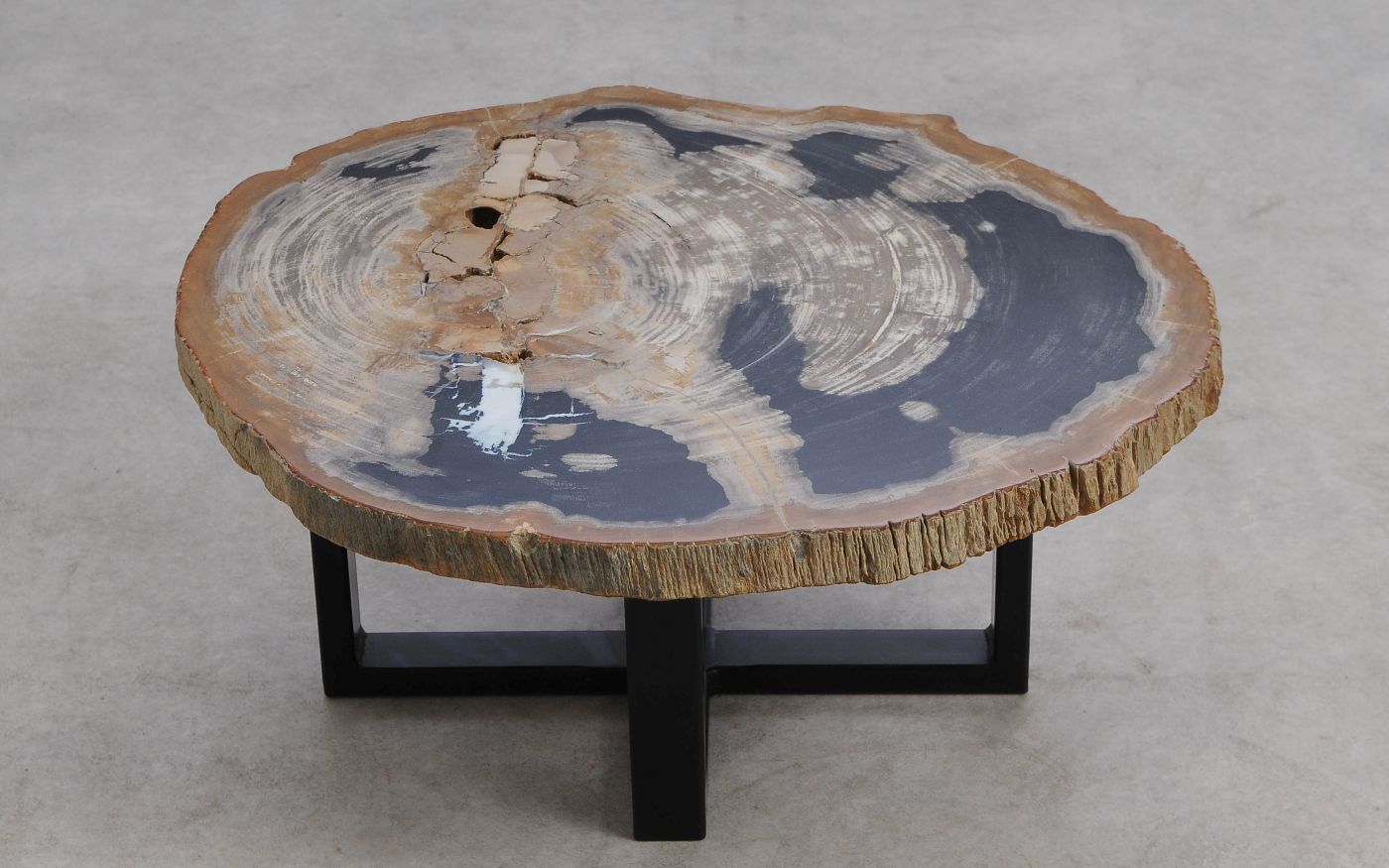 Deze unieke salontafel van versteend hout past in ieder interieur. Het tafelblad is gezaagd uit een grote versteende boom, die ongeveer 20 miljoen jaar geleden geleefd heeft. De kleuren zijn bepaald door de mineralen die het hout van deze boom vervangen hebben.