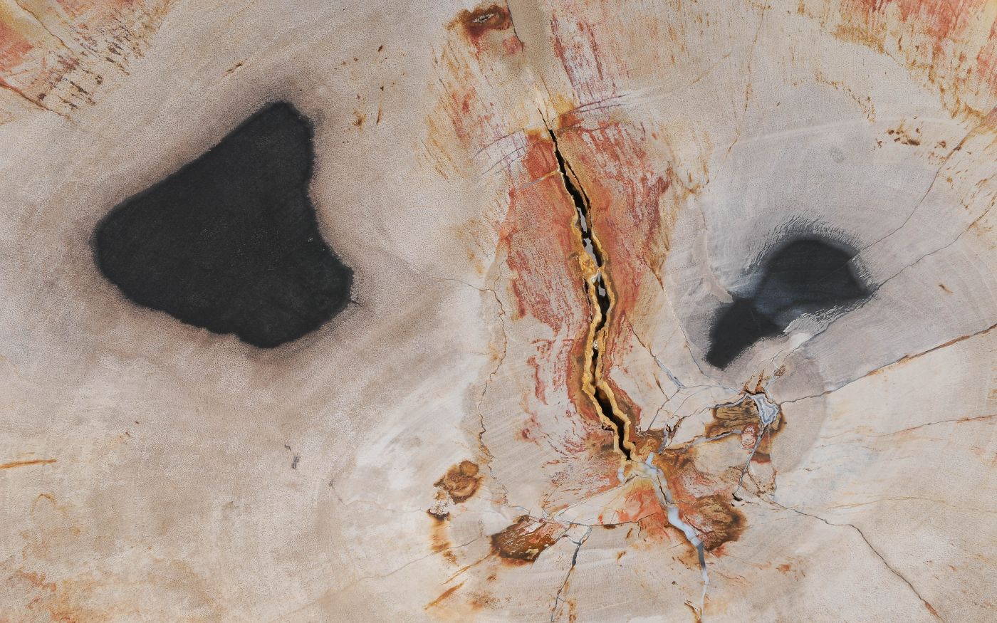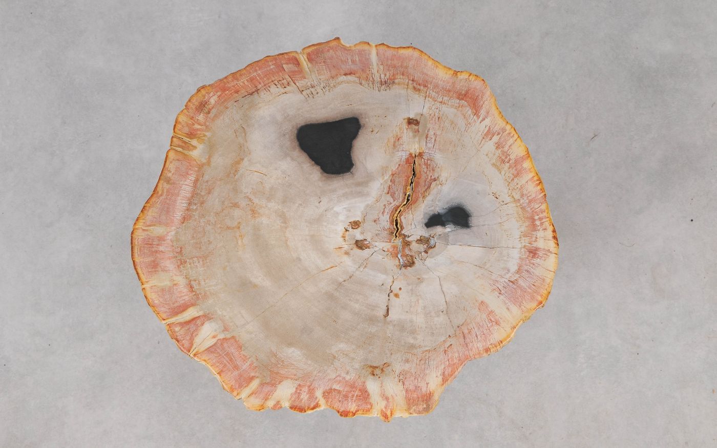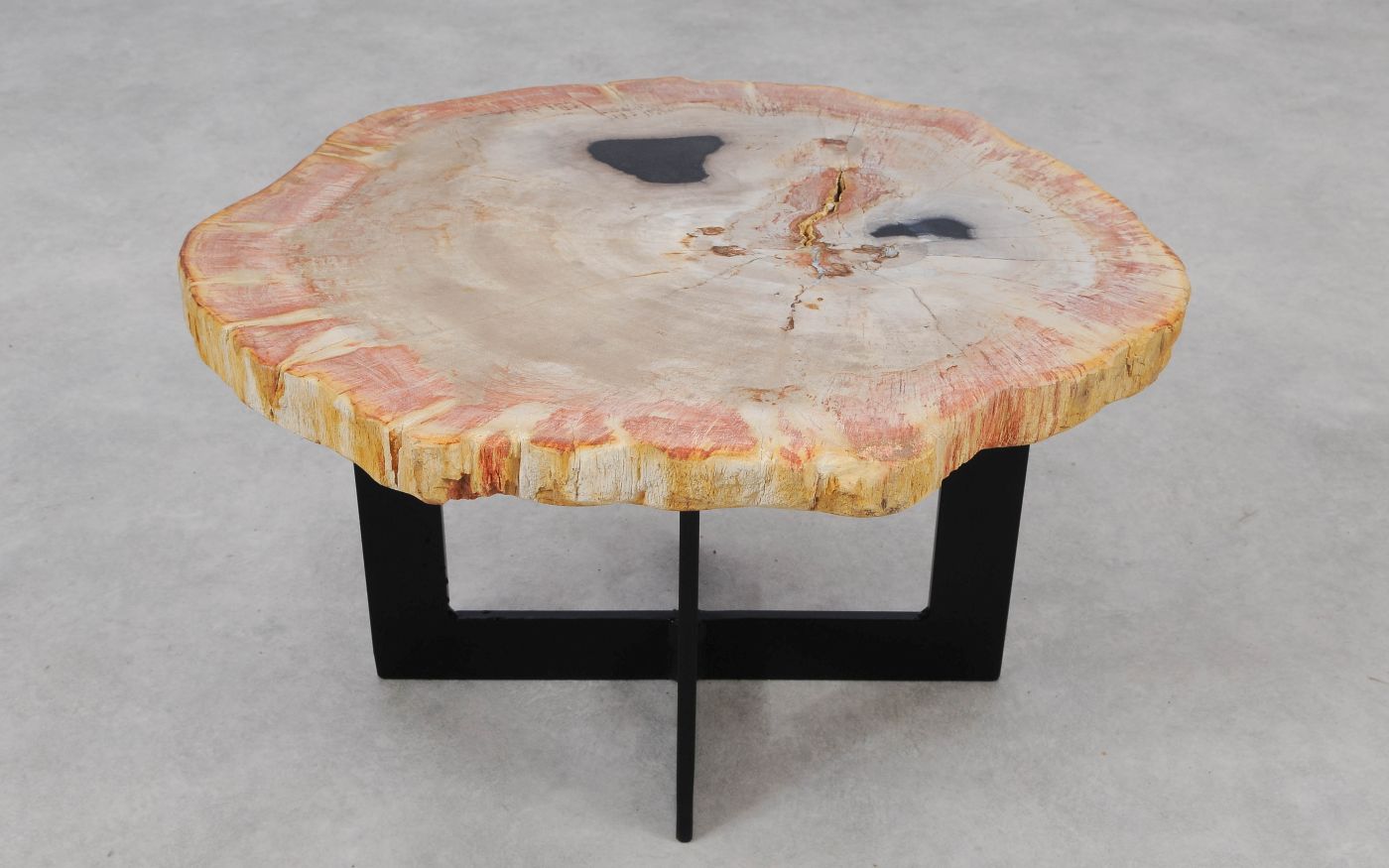 Deze unieke salontafel van versteend hout past in ieder interieur. Het tafelblad is gezaagd uit een grote versteende boom, die ongeveer 20 miljoen jaar geleden geleefd heeft. De kleuren zijn bepaald door de mineralen die het hout van deze boom vervangen hebben.