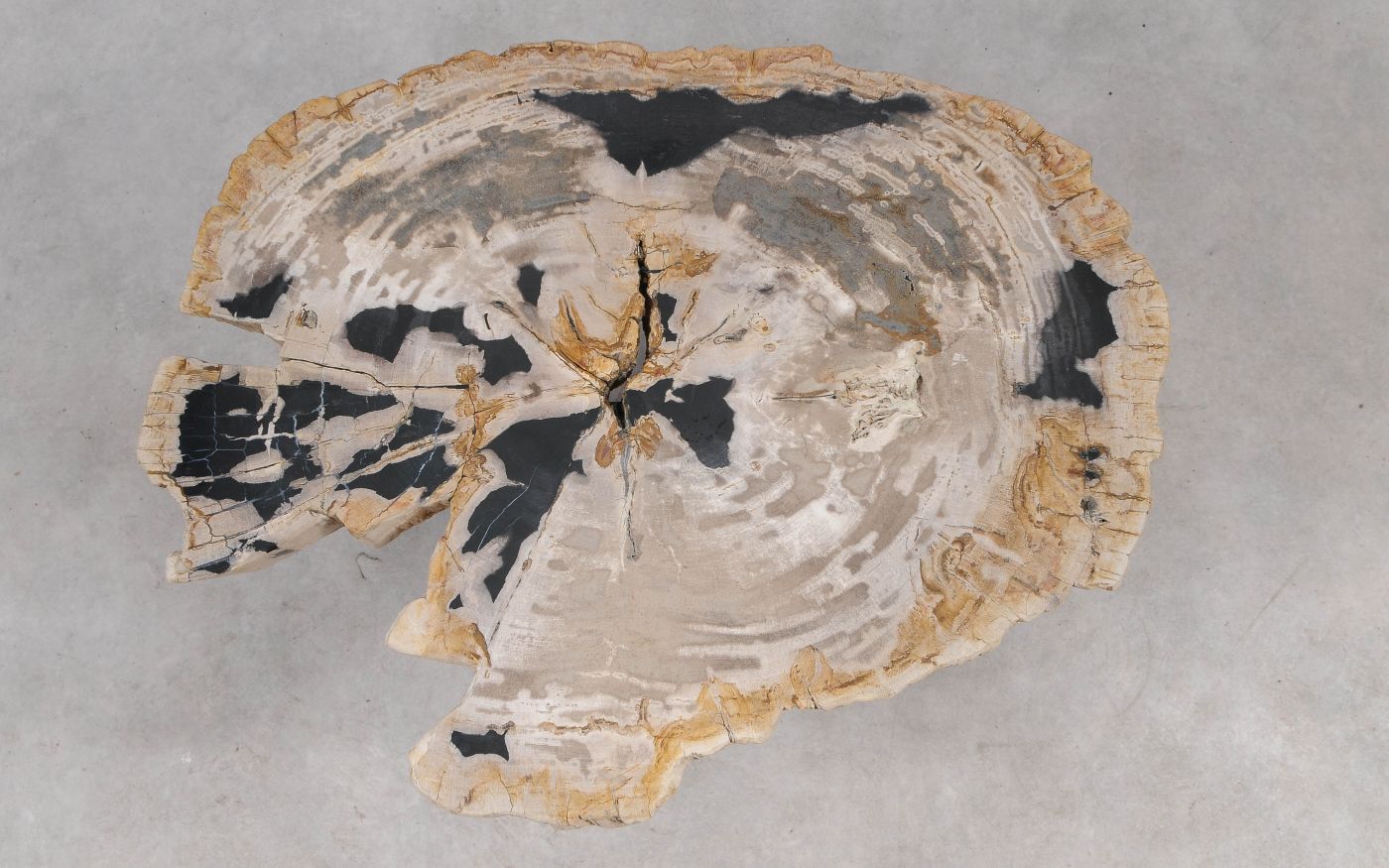 Deze unieke salontafel van versteend hout past in ieder interieur. Het tafelblad is gezaagd uit een grote versteende boom, die ongeveer 20 miljoen jaar geleden geleefd heeft. De kleuren zijn bepaald door de mineralen die het hout van deze boom vervangen hebben.
