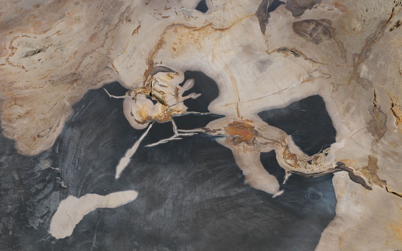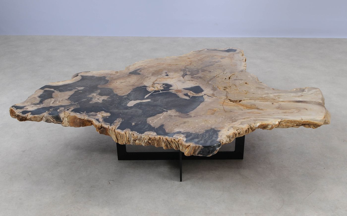 Deze unieke salontafel van versteend hout past in ieder interieur. Het tafelblad is gezaagd uit een grote versteende boom, die ongeveer 20 miljoen jaar geleden geleefd heeft. De kleuren zijn bepaald door de mineralen die het hout van deze boom vervangen hebben.