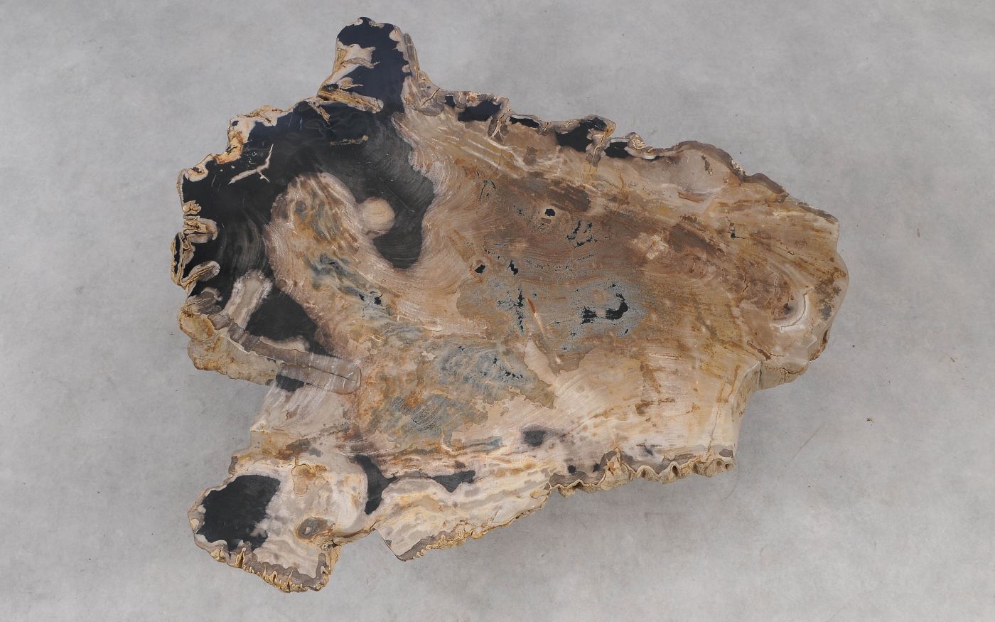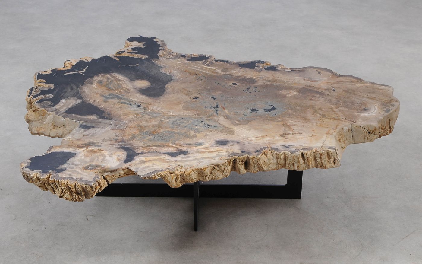 Deze unieke salontafel van versteend hout past in ieder interieur. Het tafelblad is gezaagd uit een grote versteende boom, die ongeveer 20 miljoen jaar geleden geleefd heeft. De kleuren zijn bepaald door de mineralen die het hout van deze boom vervangen hebben.