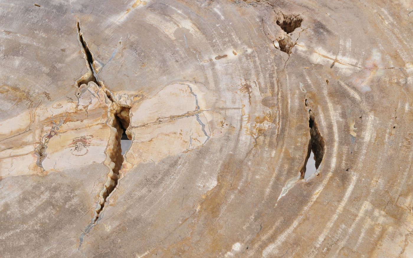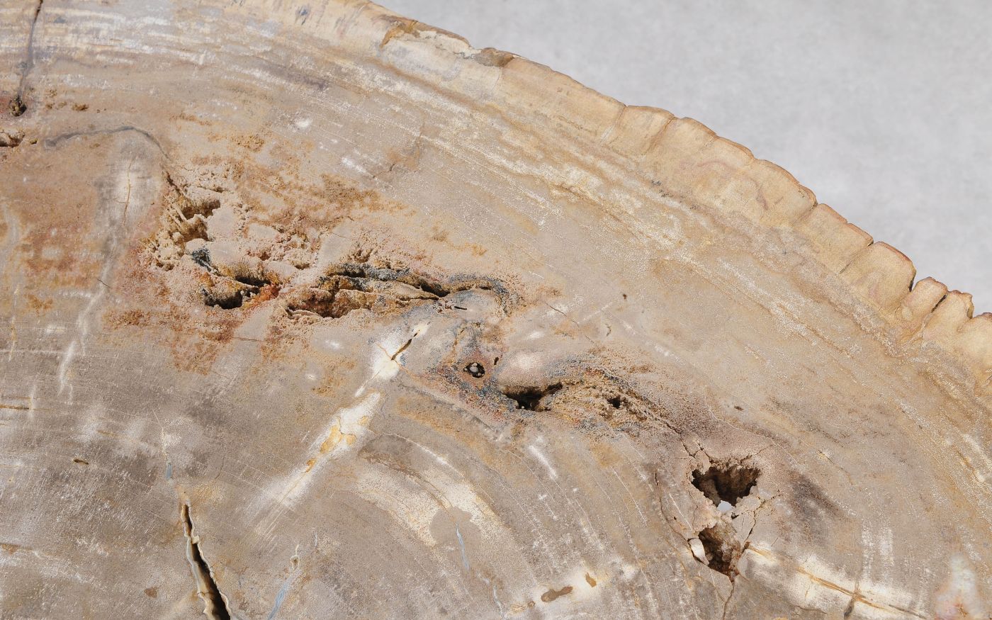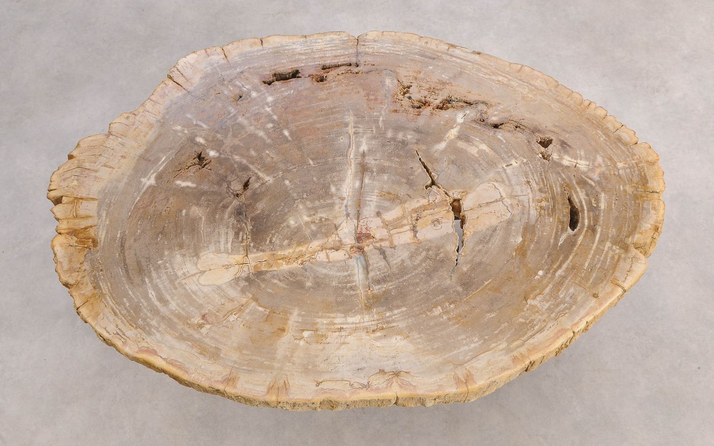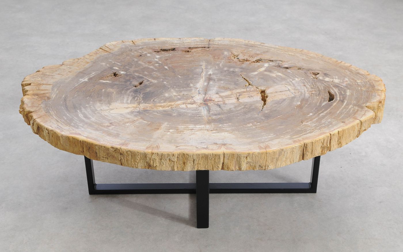 Deze unieke salontafel van versteend hout past in ieder interieur. Het tafelblad is gezaagd uit een grote versteende boom, die ongeveer 20 miljoen jaar geleden geleefd heeft. De kleuren zijn bepaald door de mineralen die het hout van deze boom vervangen hebben.