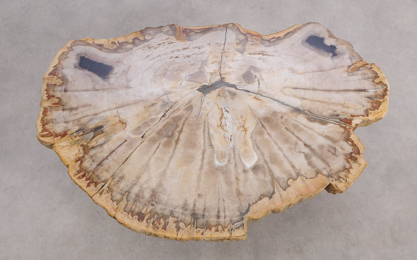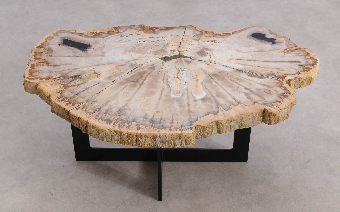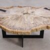 Deze unieke salontafel van versteend hout past in ieder interieur. Het tafelblad is gezaagd uit een grote versteende boom, die ongeveer 20 miljoen jaar geleden geleefd heeft. De kleuren zijn bepaald door de mineralen die het hout van deze boom vervangen hebben.