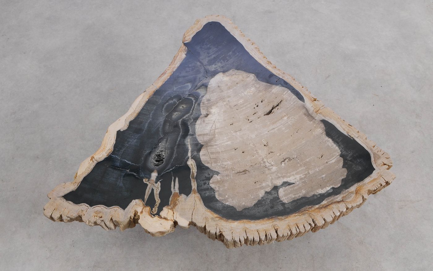 Deze unieke salontafel van versteend hout past in ieder interieur. Het tafelblad is gezaagd uit een grote versteende boom, die ongeveer 20 miljoen jaar geleden geleefd heeft. De kleuren zijn bepaald door de mineralen die het hout van deze boom vervangen hebben.