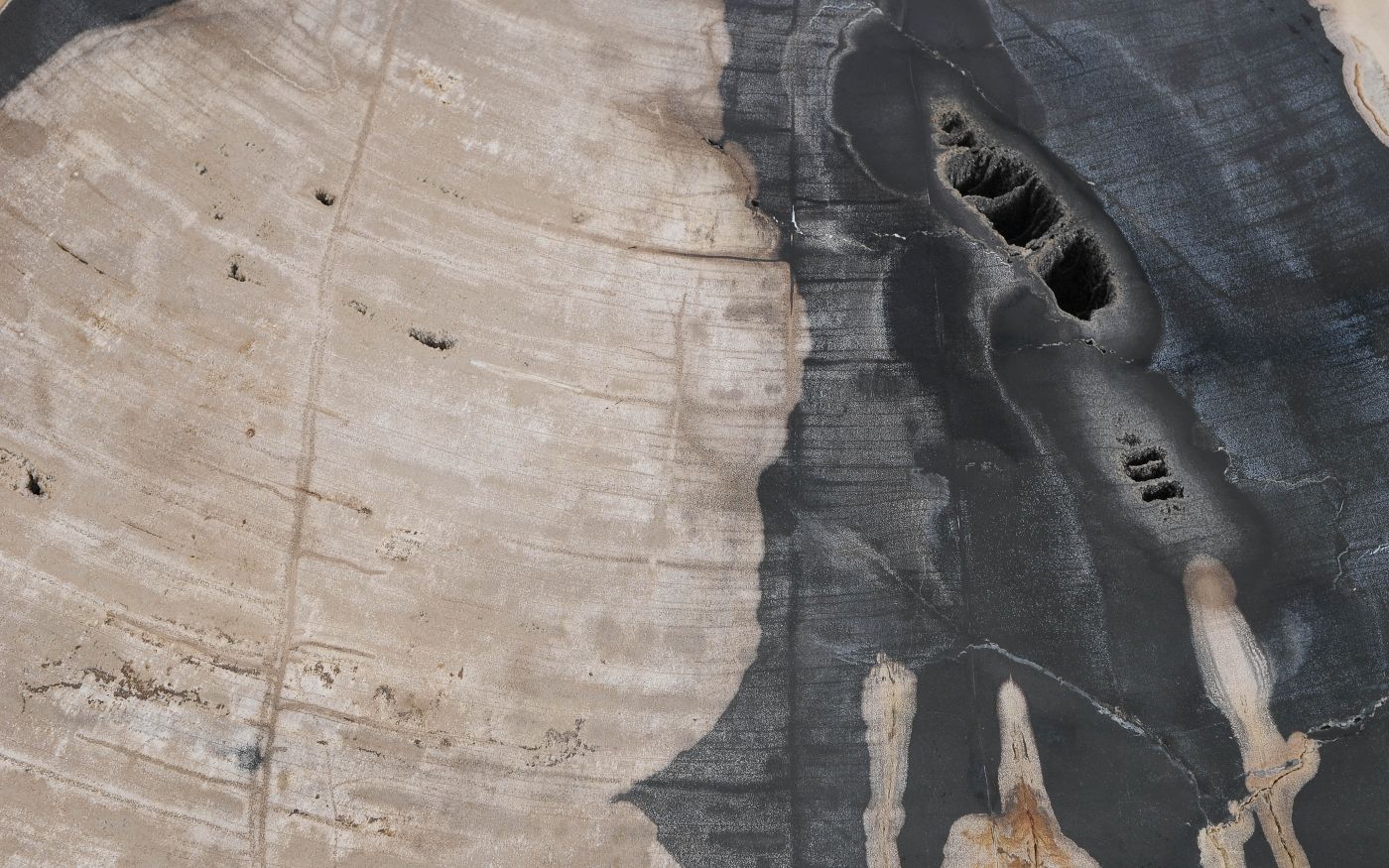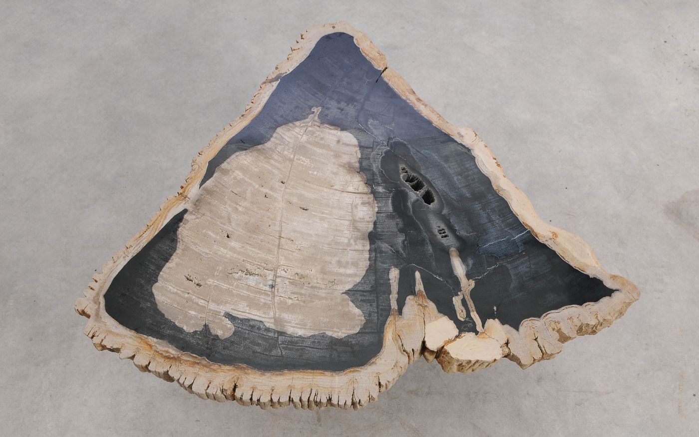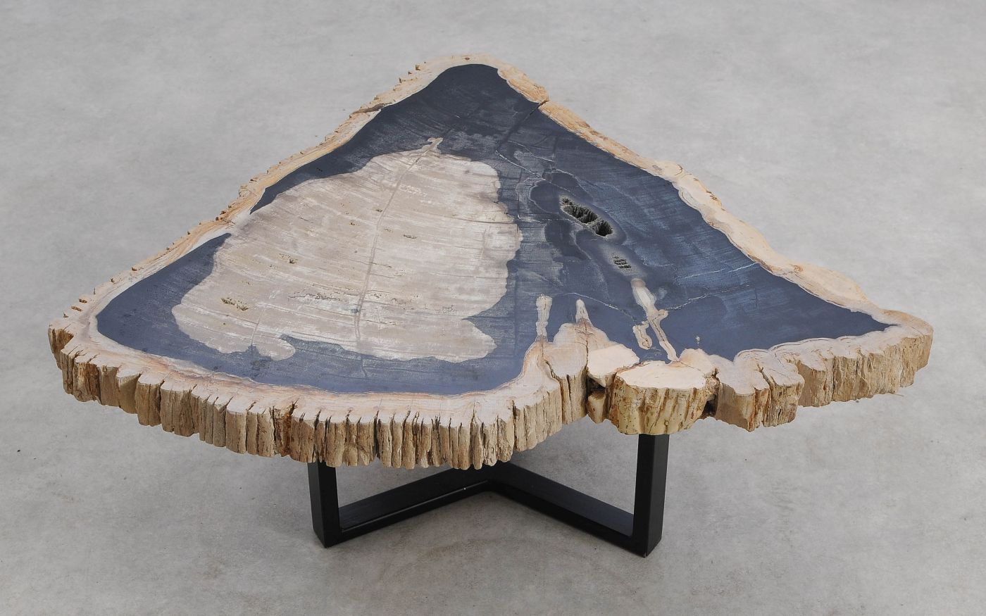 Deze unieke salontafel van versteend hout past in ieder interieur. Het tafelblad is gezaagd uit een grote versteende boom, die ongeveer 20 miljoen jaar geleden geleefd heeft. De kleuren zijn bepaald door de mineralen die het hout van deze boom vervangen hebben.