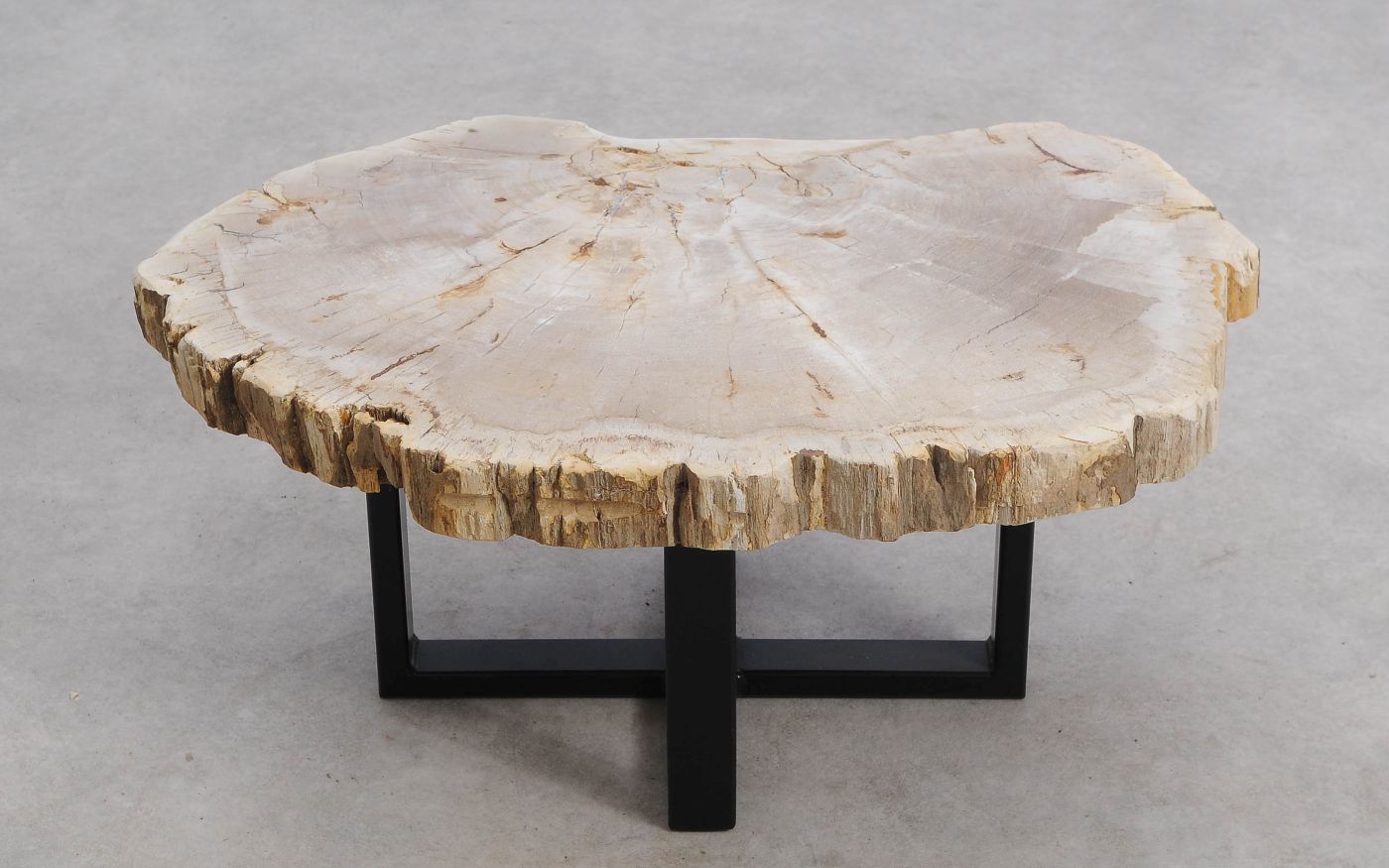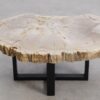 Deze unieke salontafel van versteend hout past in ieder interieur. Het tafelblad is gezaagd uit een grote versteende boom, die ongeveer 20 miljoen jaar geleden geleefd heeft. De kleuren zijn bepaald door de mineralen die het hout van deze boom vervangen hebben.