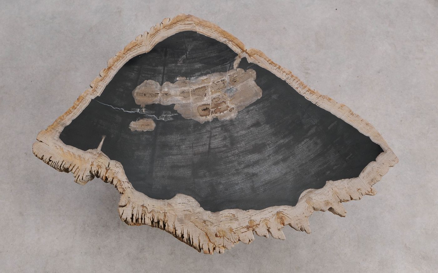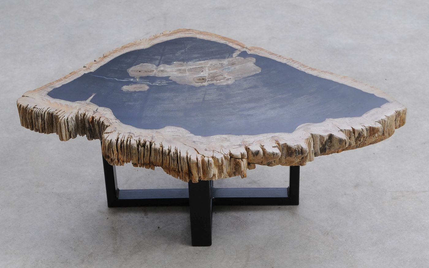 Deze unieke salontafel van versteend hout past in ieder interieur. Het tafelblad is gezaagd uit een grote versteende boom, die ongeveer 20 miljoen jaar geleden geleefd heeft. De kleuren zijn bepaald door de mineralen die het hout van deze boom vervangen hebben.