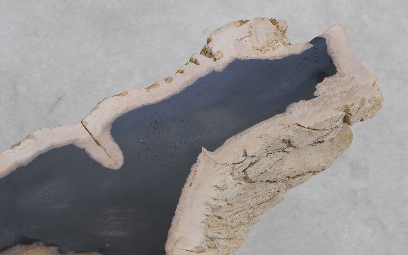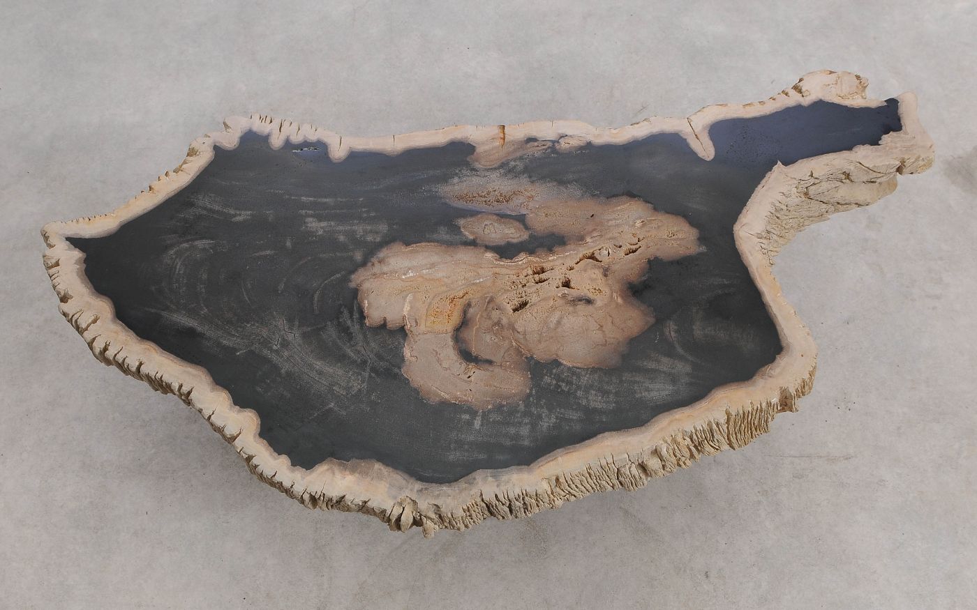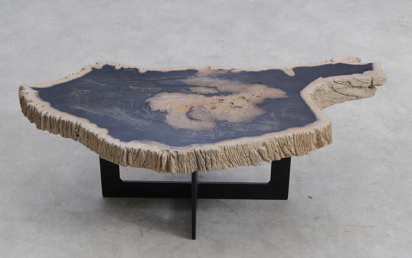 Deze unieke salontafel van versteend hout past in ieder interieur. Het tafelblad is gezaagd uit een grote versteende boom, die ongeveer 20 miljoen jaar geleden geleefd heeft. De kleuren zijn bepaald door de mineralen die het hout van deze boom vervangen hebben.