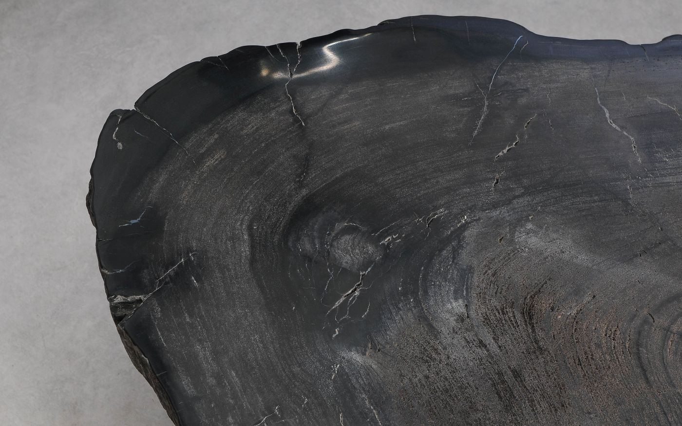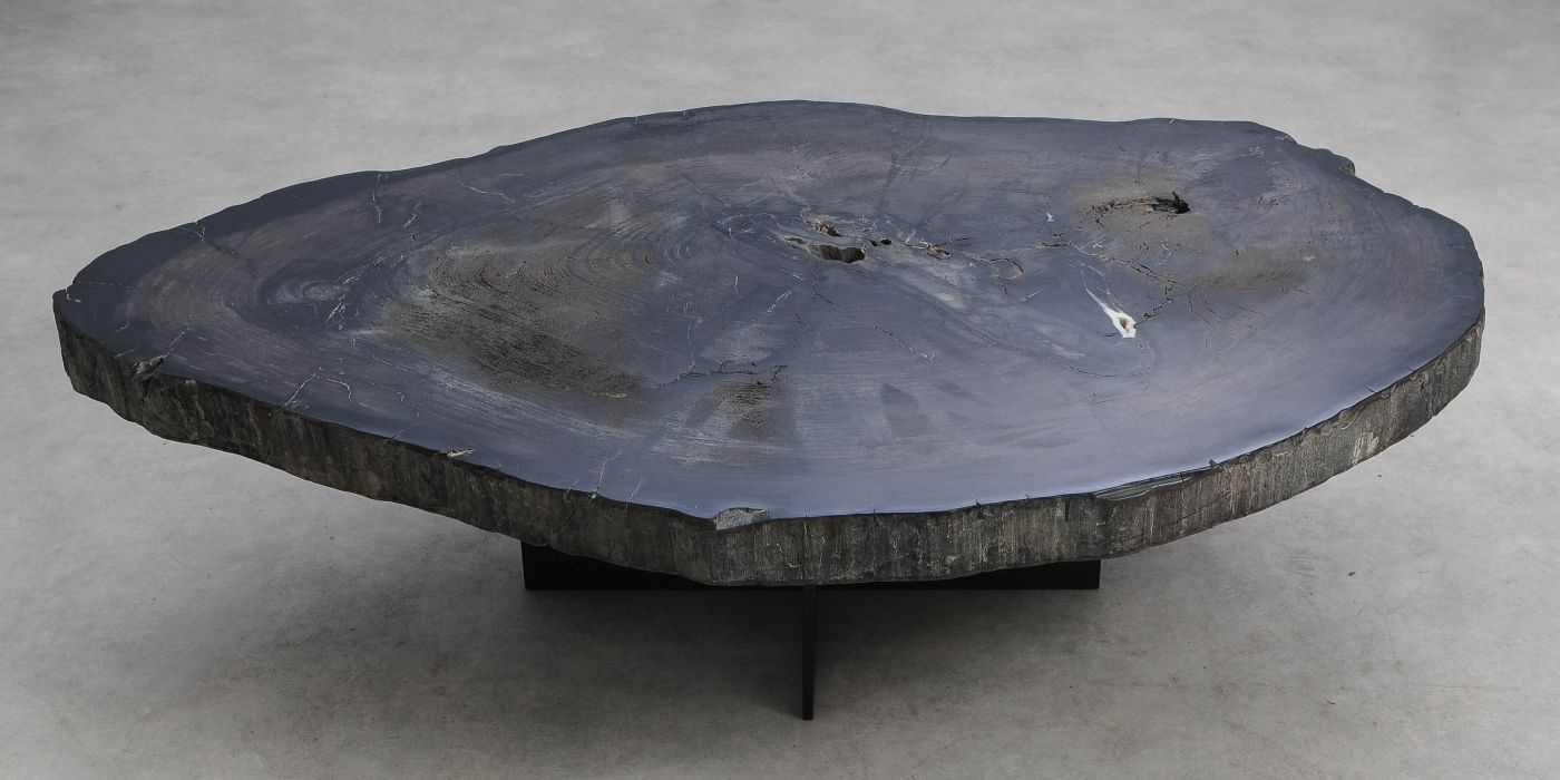 Deze unieke salontafel van versteend hout past in ieder interieur. Het tafelblad is gezaagd uit een grote versteende boom, die ongeveer 20 miljoen jaar geleden geleefd heeft. De kleuren zijn bepaald door de mineralen die het hout van deze boom vervangen hebben.