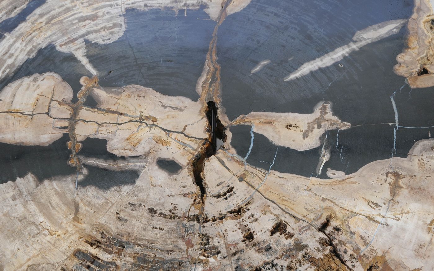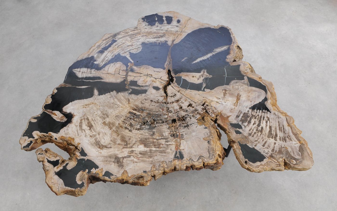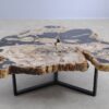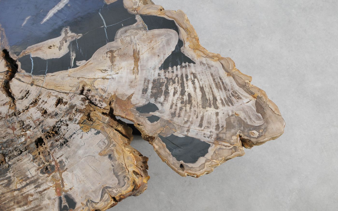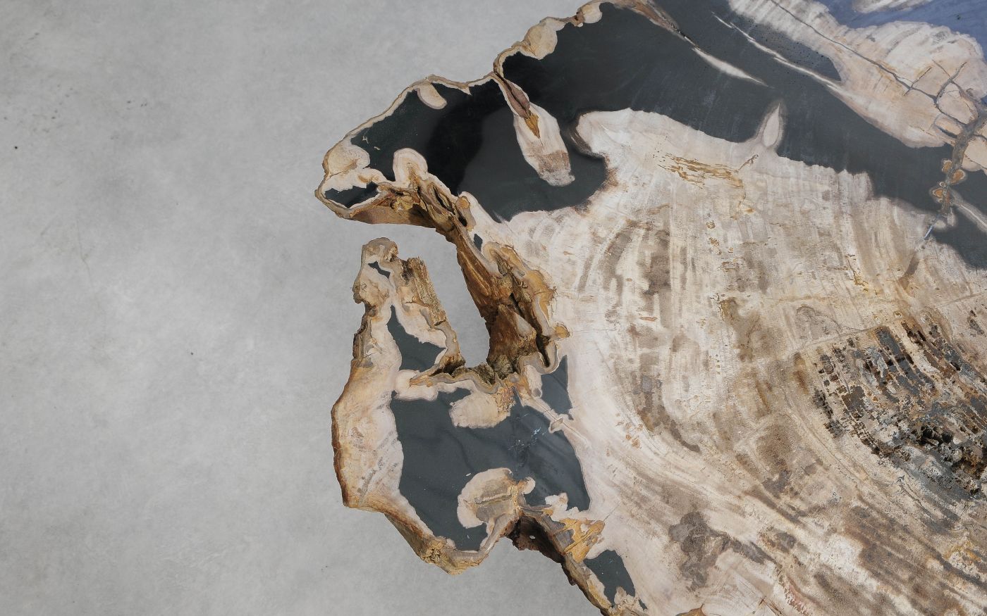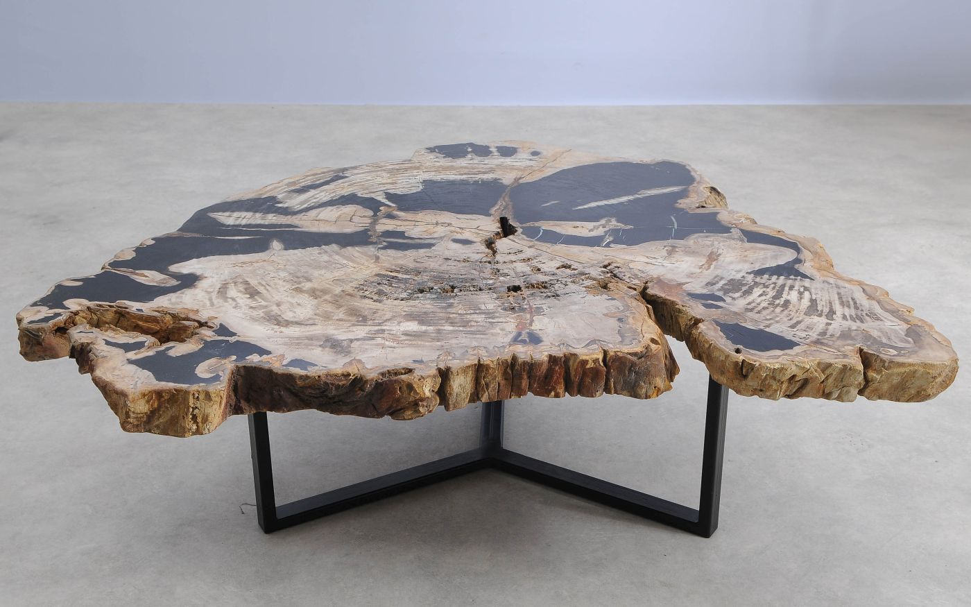 Deze unieke salontafel van versteend hout past in ieder interieur. Het tafelblad is gezaagd uit een grote versteende boom, die ongeveer 20 miljoen jaar geleden geleefd heeft. De kleuren zijn bepaald door de mineralen die het hout van deze boom vervangen hebben.