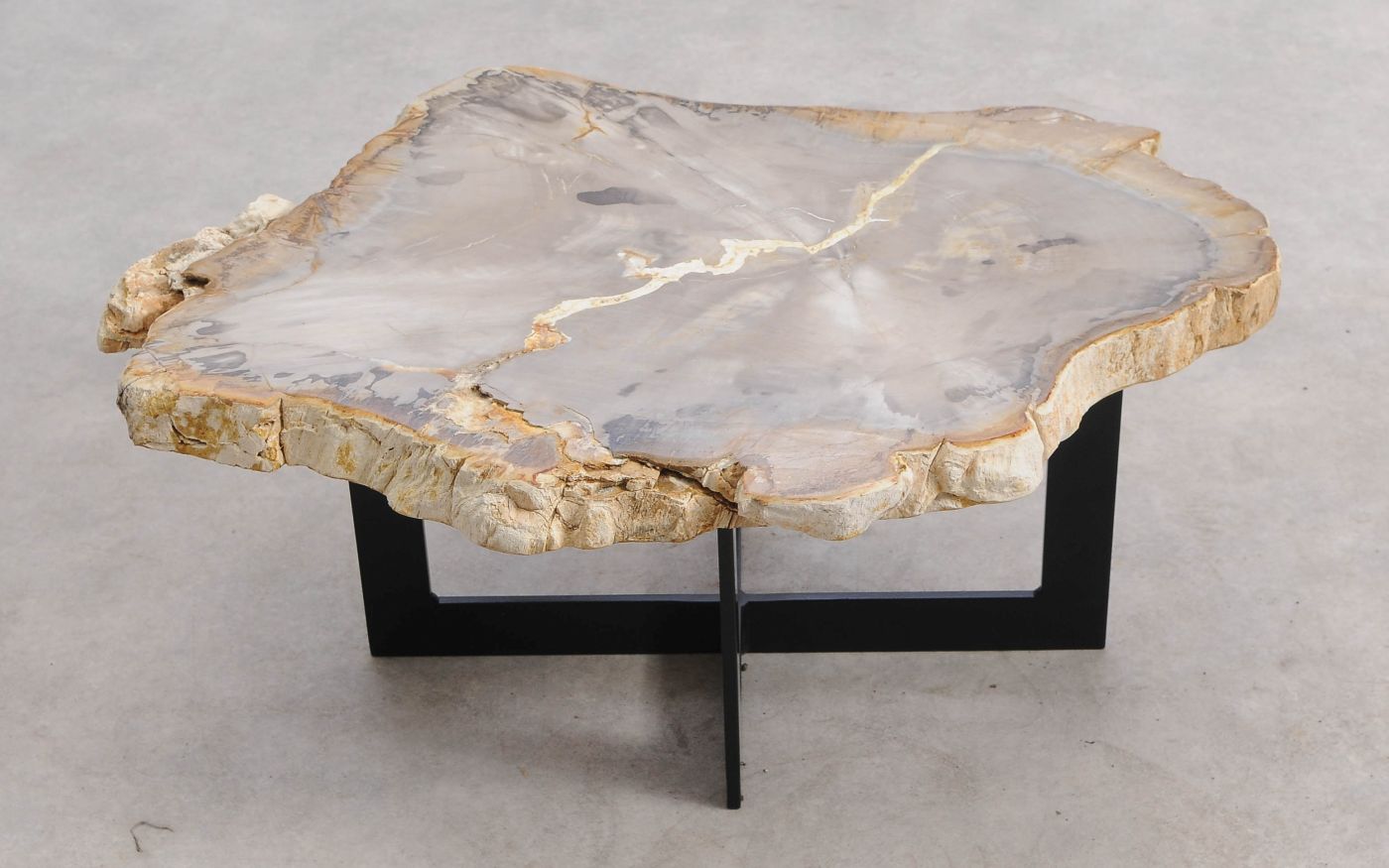 Deze unieke salontafel van versteend hout past in ieder interieur. Het tafelblad is gezaagd uit een grote versteende boom, die ongeveer 20 miljoen jaar geleden geleefd heeft. De kleuren zijn bepaald door de mineralen die het hout van deze boom vervangen hebben.