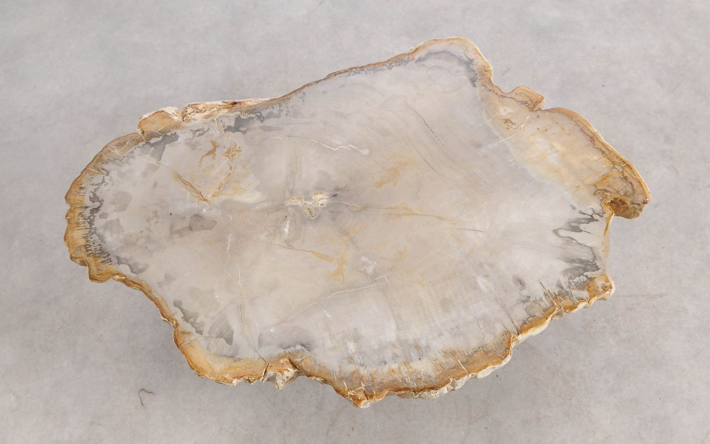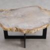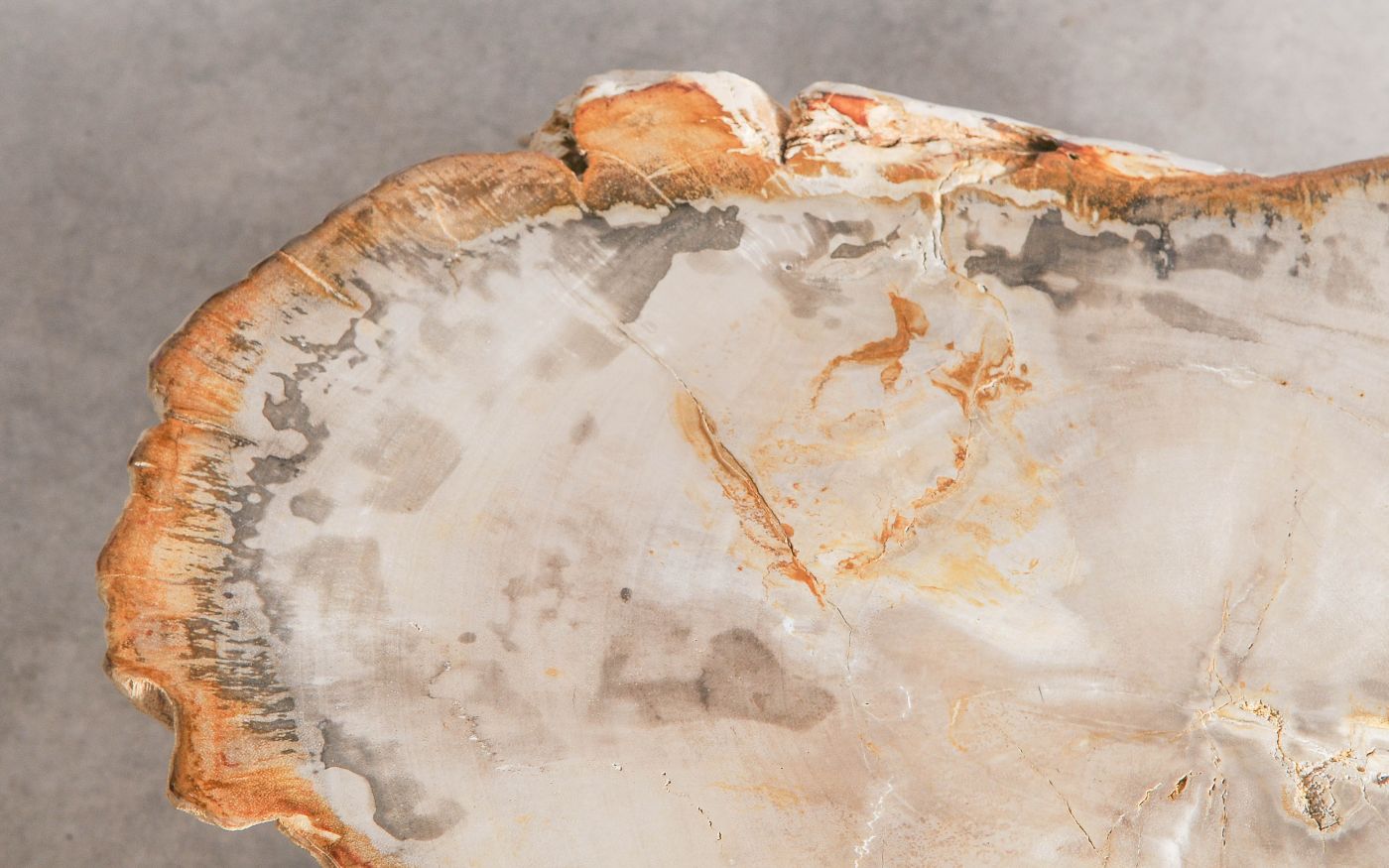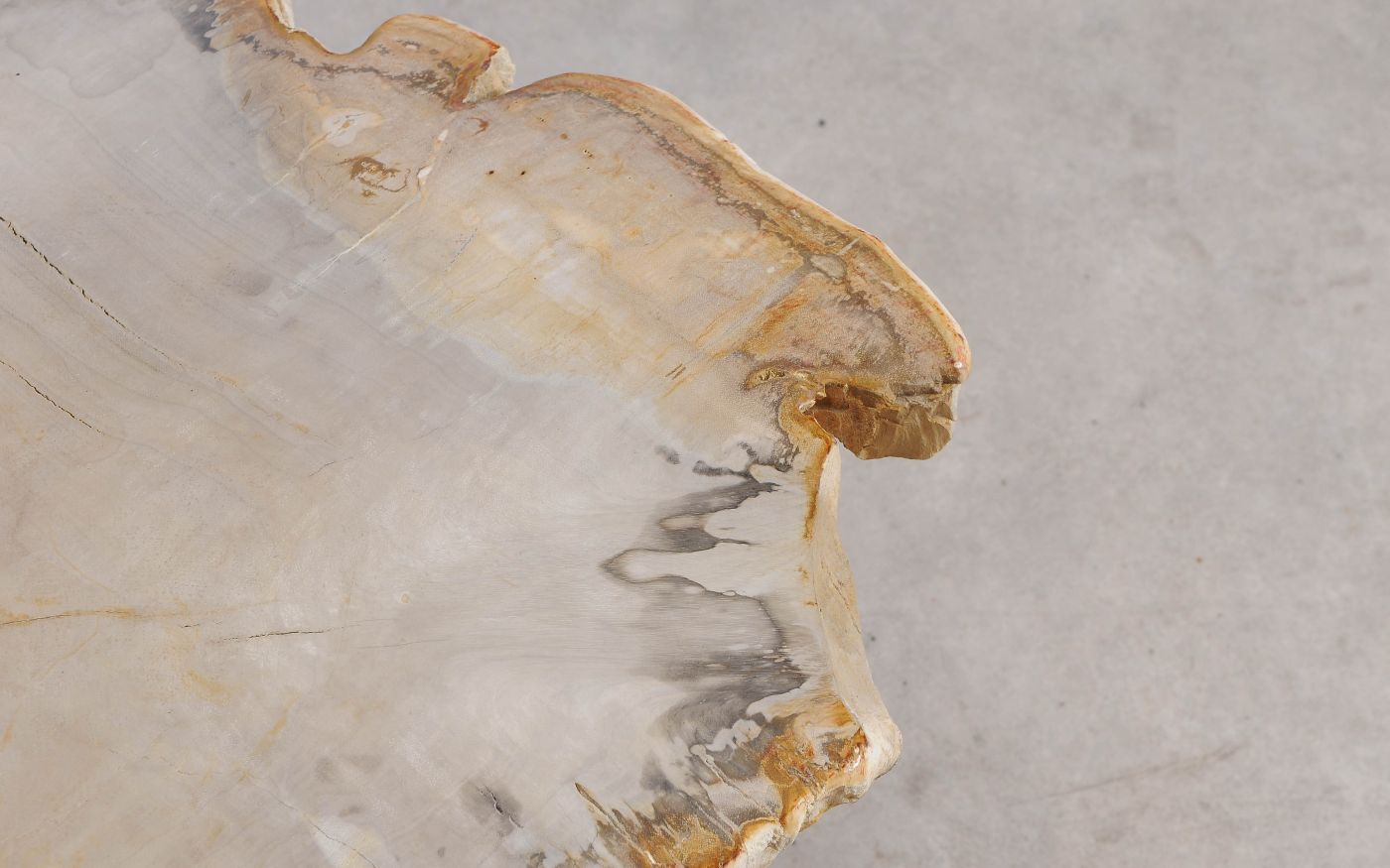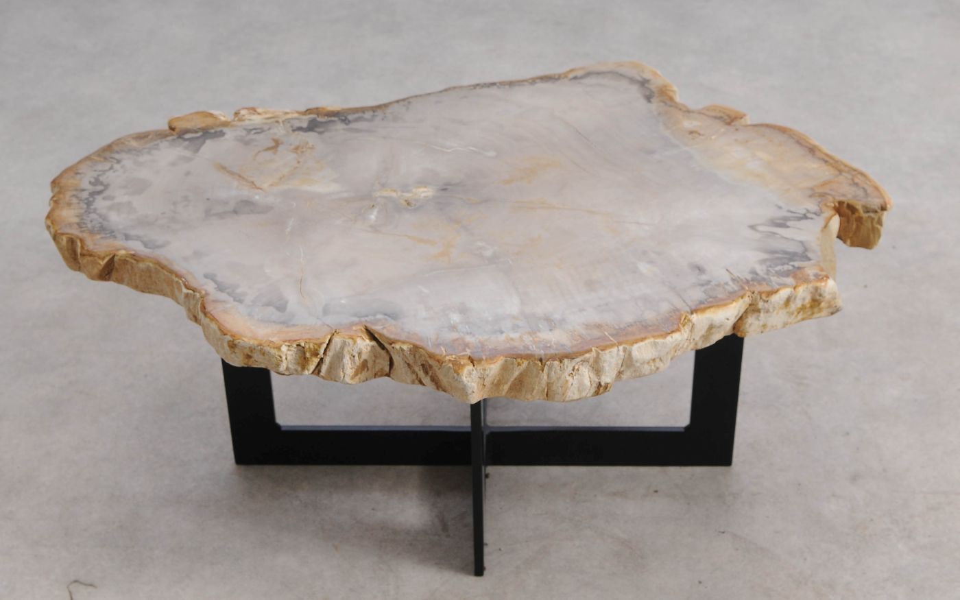 Deze unieke salontafel van versteend hout past in ieder interieur. Het tafelblad is gezaagd uit een grote versteende boom, die ongeveer 20 miljoen jaar geleden geleefd heeft. De kleuren zijn bepaald door de mineralen die het hout van deze boom vervangen hebben.