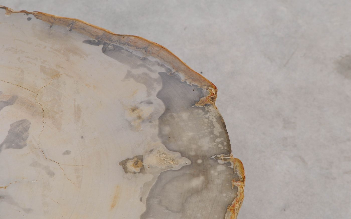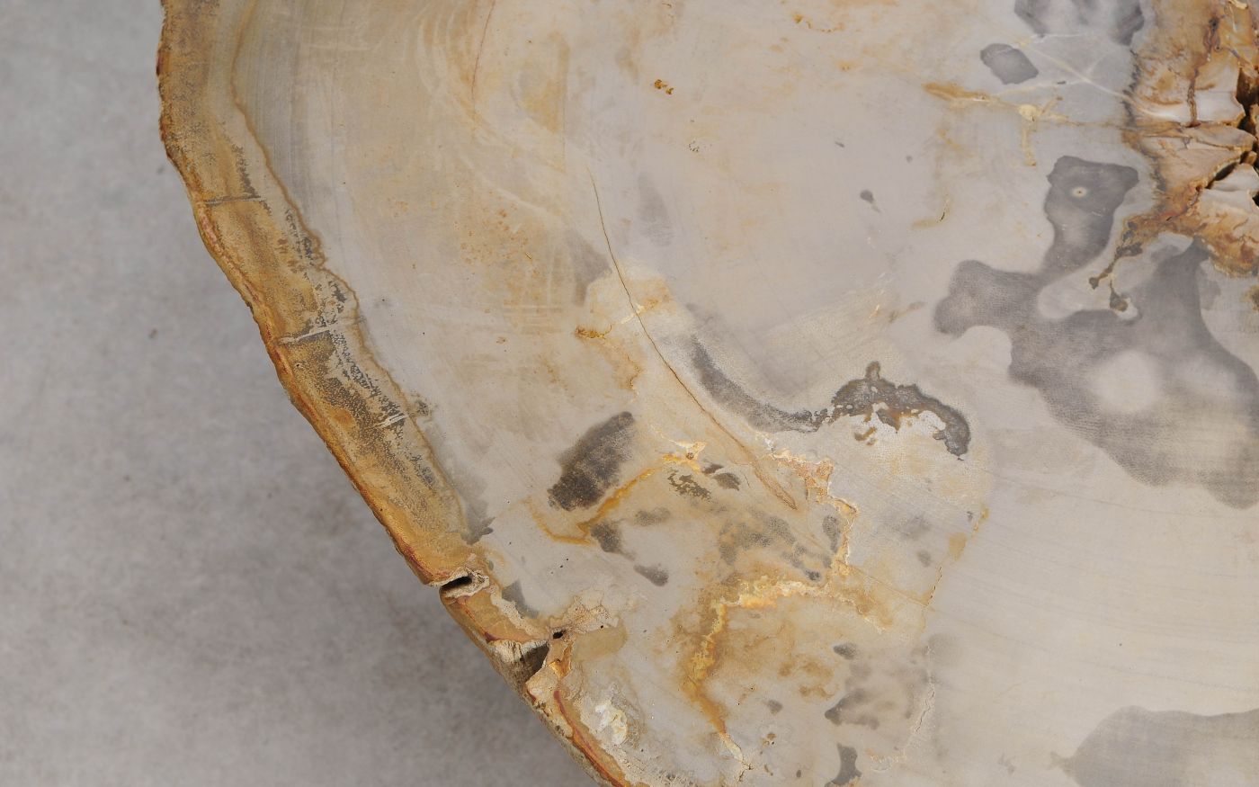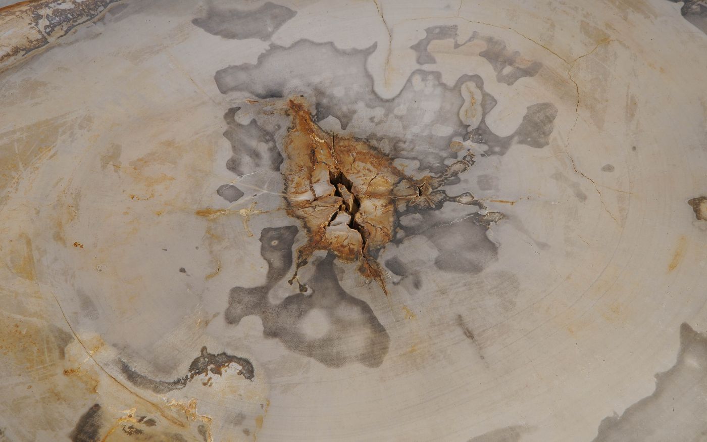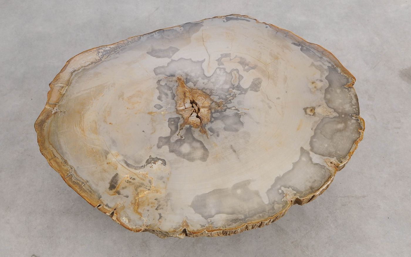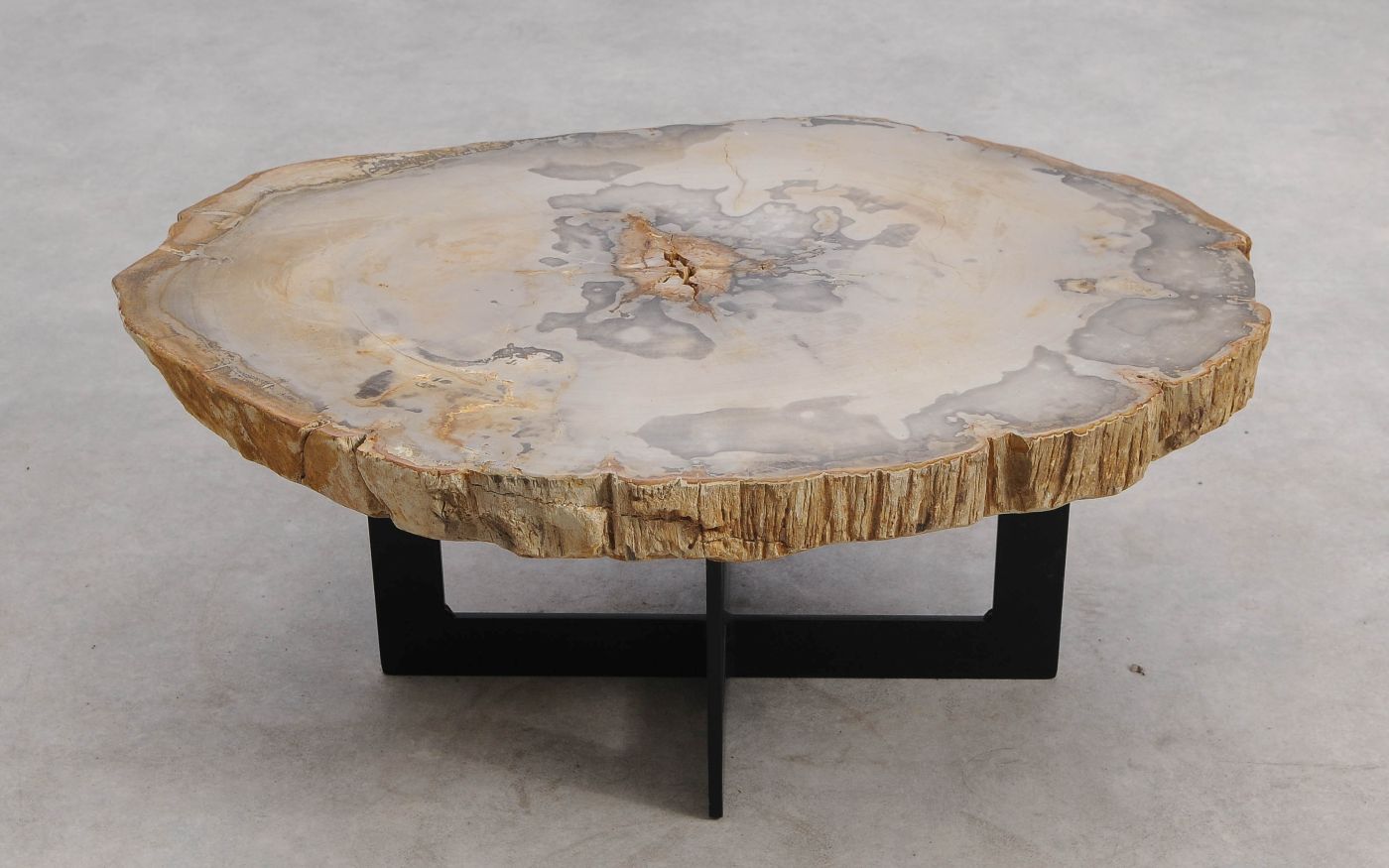 Deze unieke salontafel van versteend hout past in ieder interieur. Het tafelblad is gezaagd uit een grote versteende boom, die ongeveer 20 miljoen jaar geleden geleefd heeft. De kleuren zijn bepaald door de mineralen die het hout van deze boom vervangen hebben.