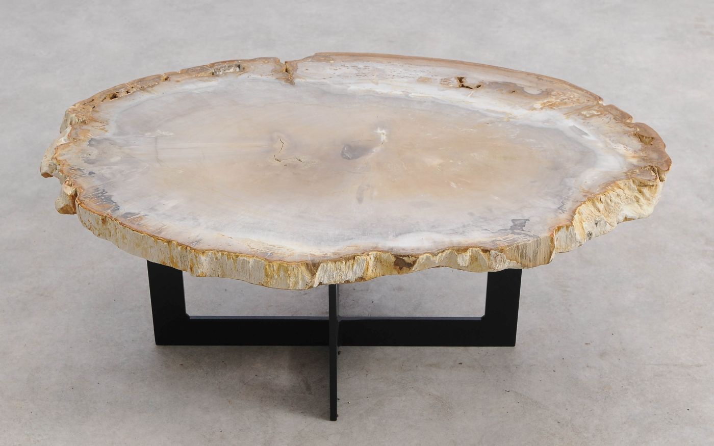 Deze unieke salontafel van versteend hout past in ieder interieur. Het tafelblad is gezaagd uit een grote versteende boom, die ongeveer 20 miljoen jaar geleden geleefd heeft. De kleuren zijn bepaald door de mineralen die het hout van deze boom vervangen hebben.
