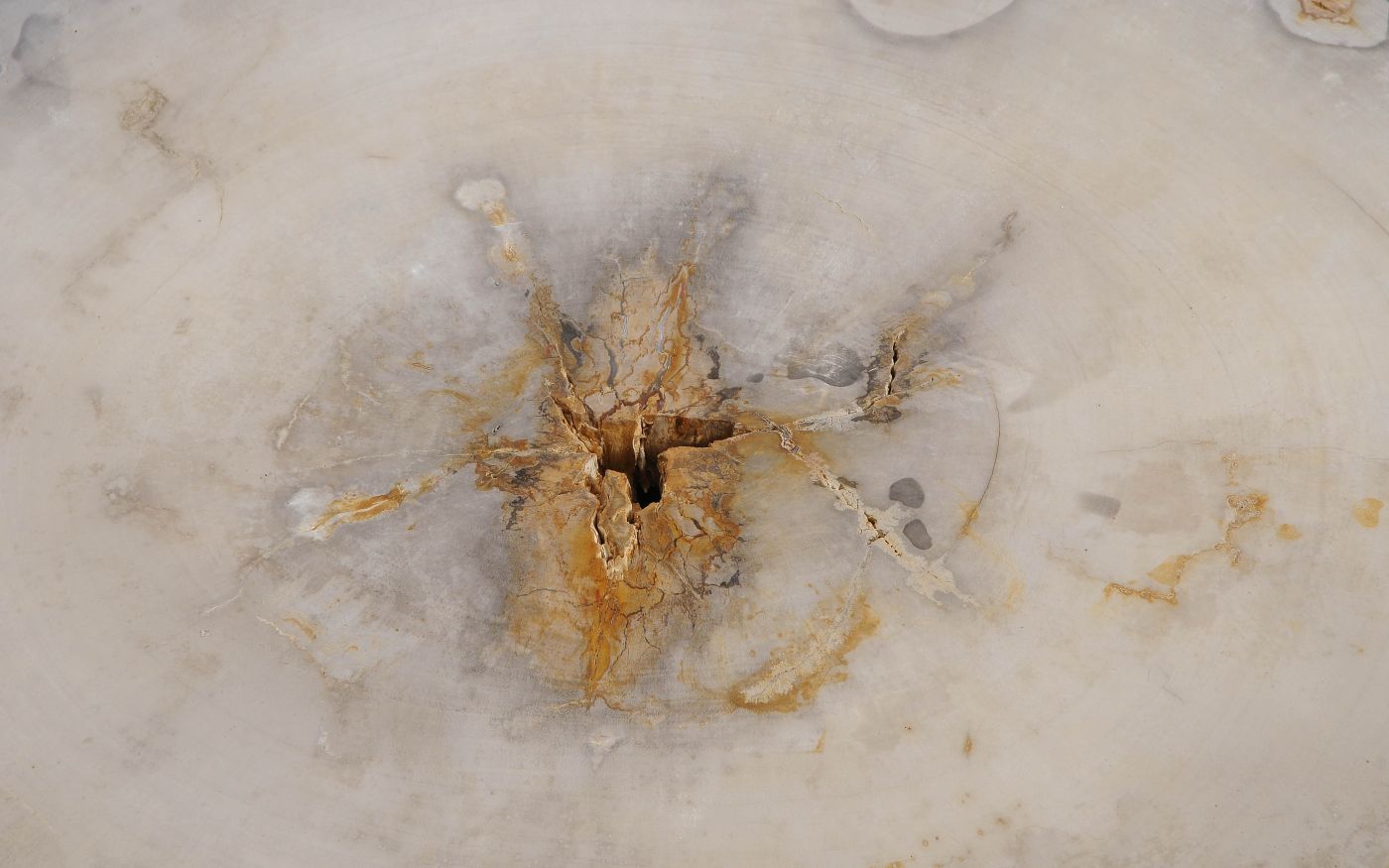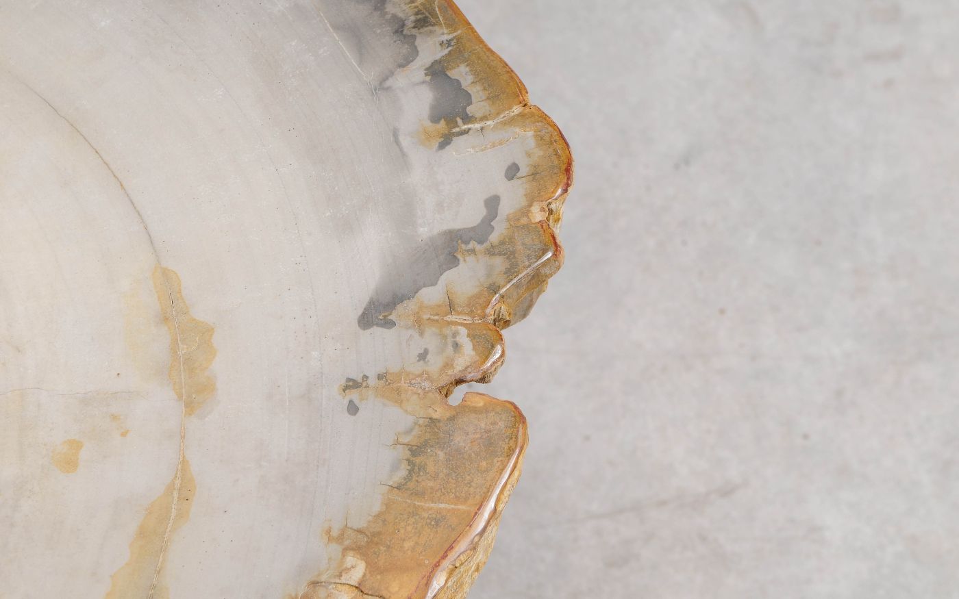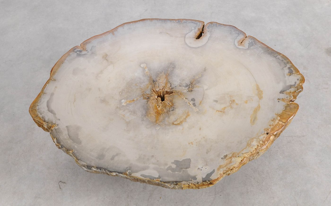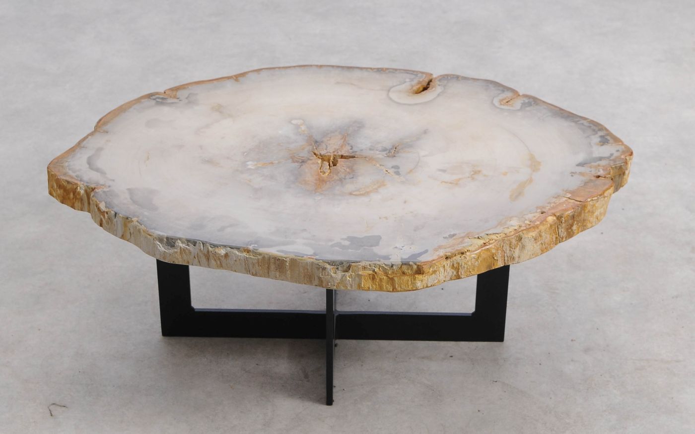 Deze unieke salontafel van versteend hout past in ieder interieur. Het tafelblad is gezaagd uit een grote versteende boom, die ongeveer 20 miljoen jaar geleden geleefd heeft. De kleuren zijn bepaald door de mineralen die het hout van deze boom vervangen hebben.