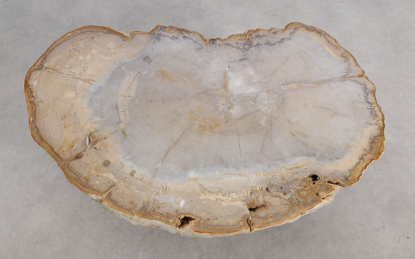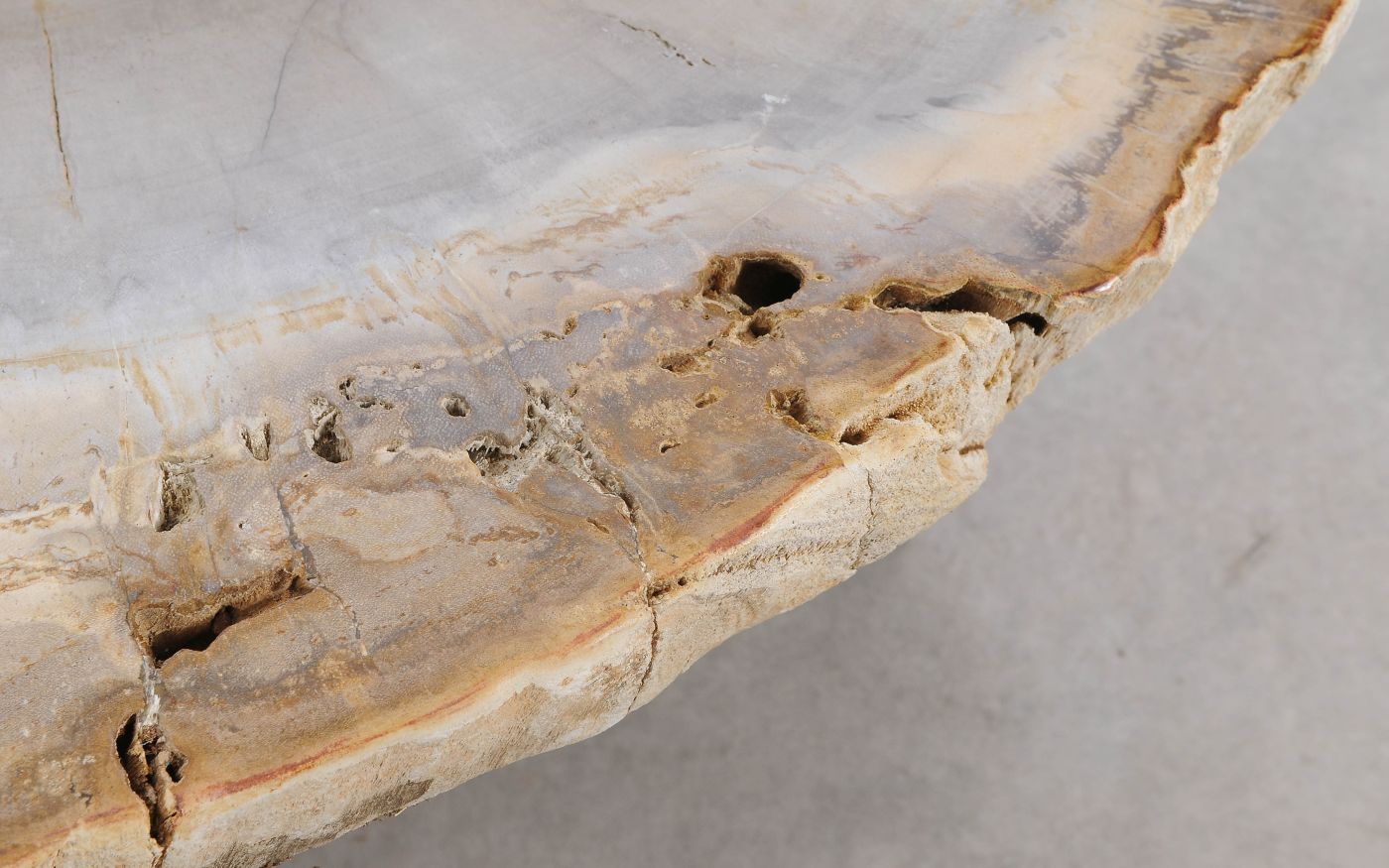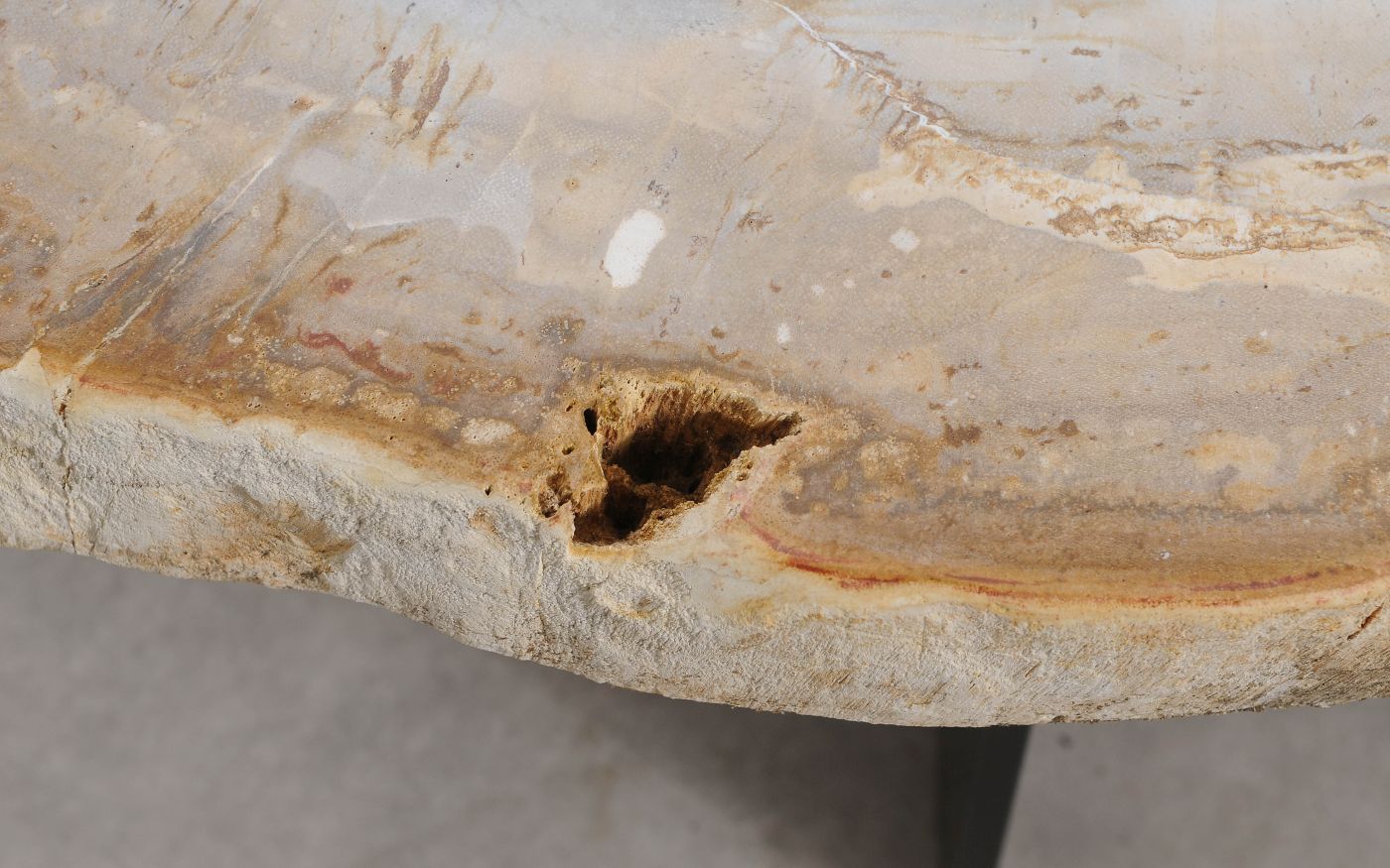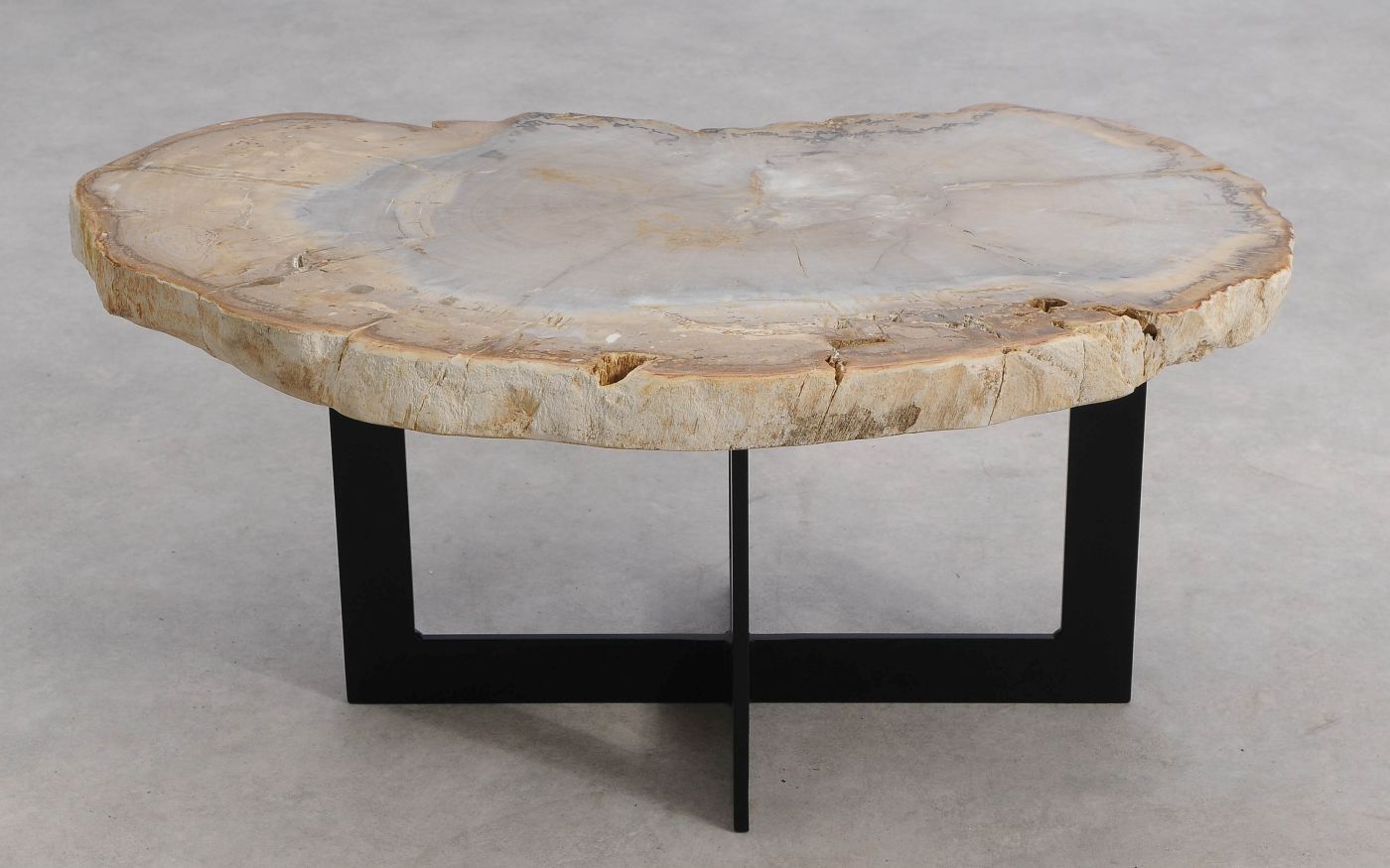 Deze unieke salontafel van versteend hout past in ieder interieur. Het tafelblad is gezaagd uit een grote versteende boom, die ongeveer 20 miljoen jaar geleden geleefd heeft. De kleuren zijn bepaald door de mineralen die het hout van deze boom vervangen hebben.