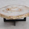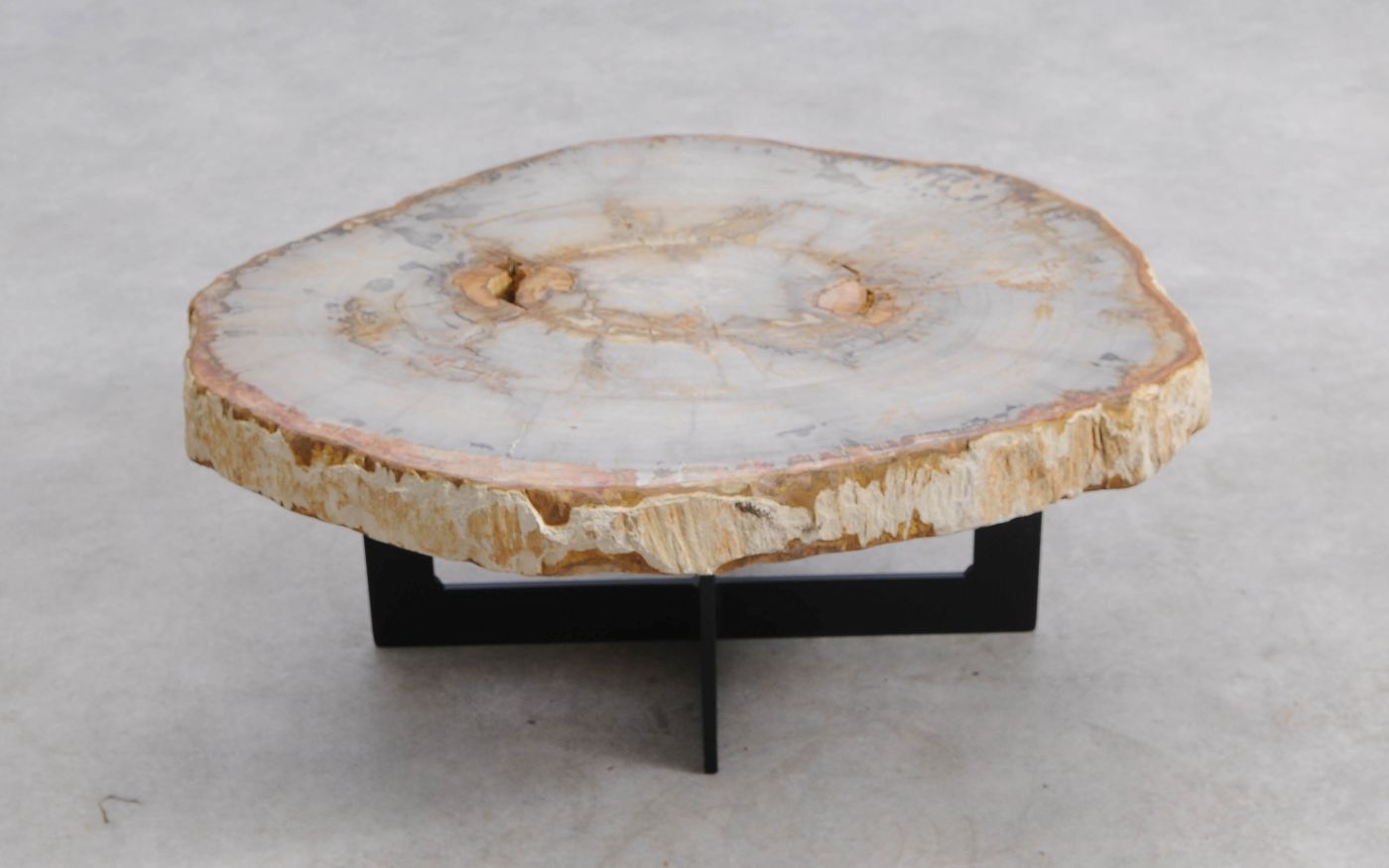 Deze unieke salontafel van versteend hout past in ieder interieur. Het tafelblad is gezaagd uit een grote versteende boom, die ongeveer 20 miljoen jaar geleden geleefd heeft. De kleuren zijn bepaald door de mineralen die het hout van deze boom vervangen hebben.