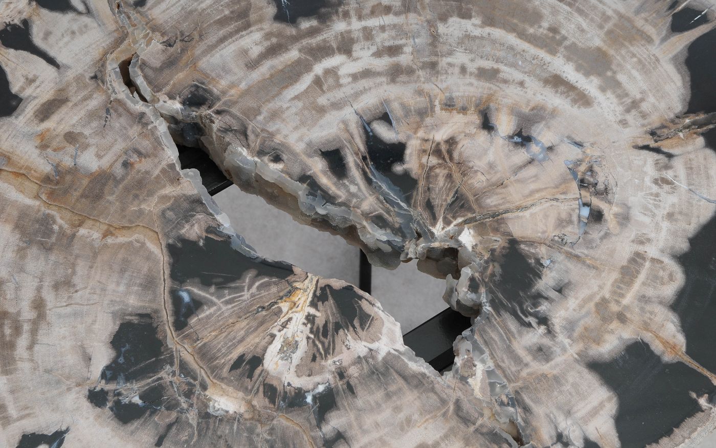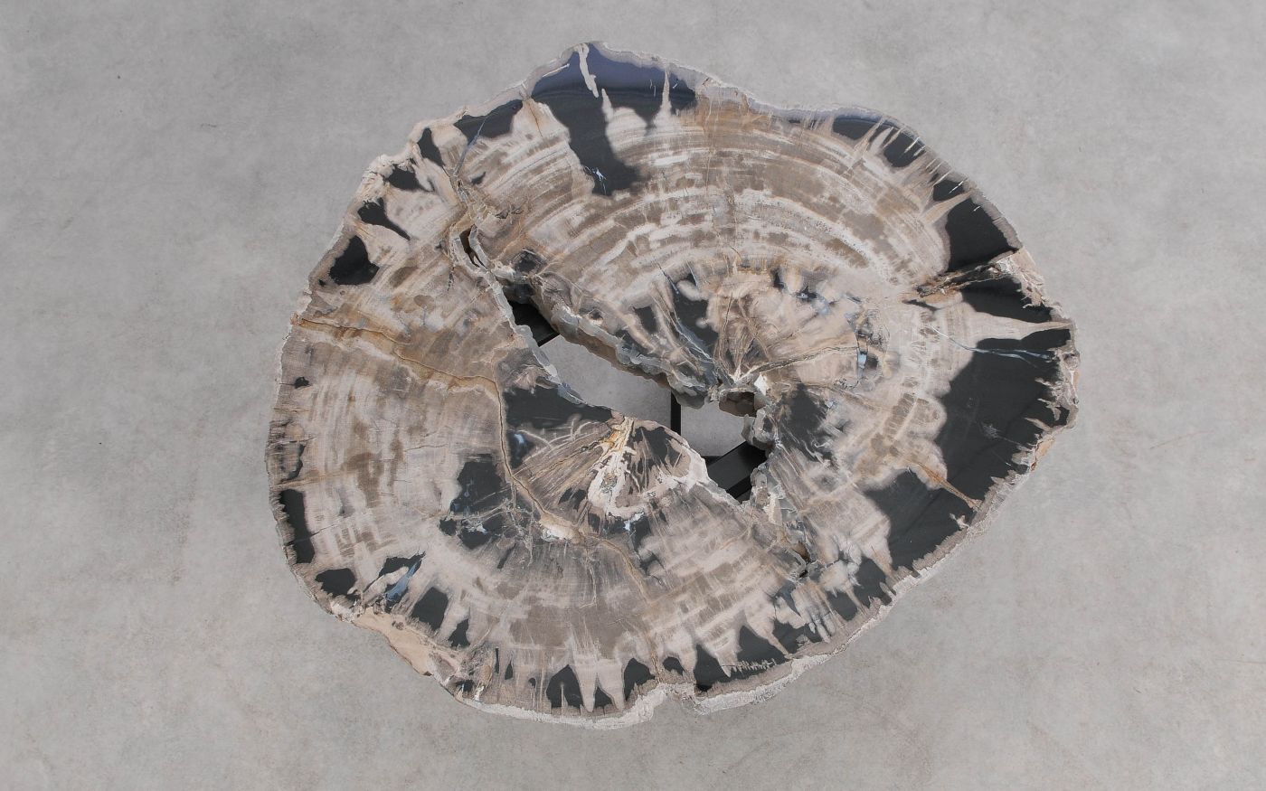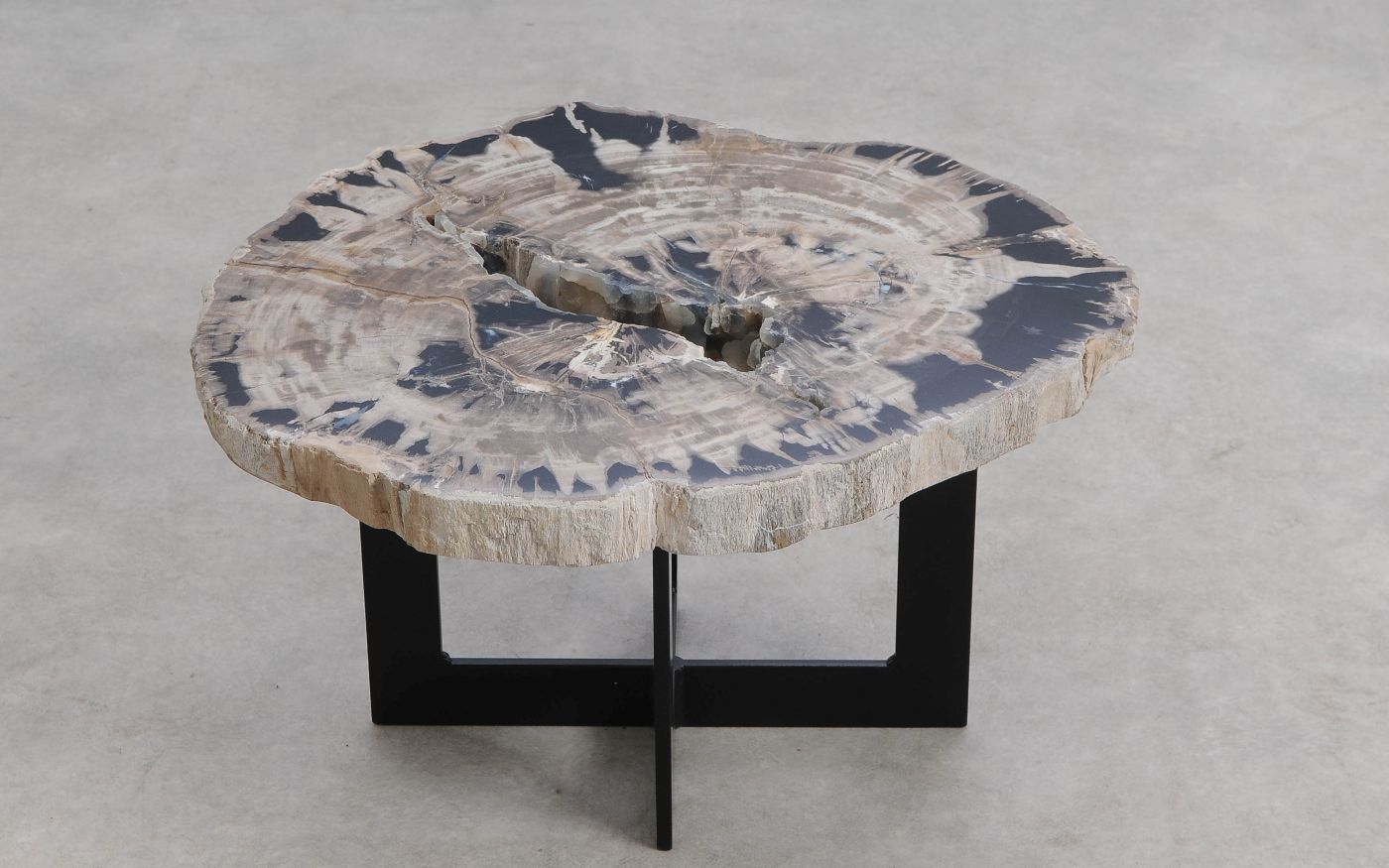 Deze unieke salontafel van versteend hout past in ieder interieur. Het tafelblad is gezaagd uit een grote versteende boom, die ongeveer 20 miljoen jaar geleden geleefd heeft. De kleuren zijn bepaald door de mineralen die het hout van deze boom vervangen hebben.