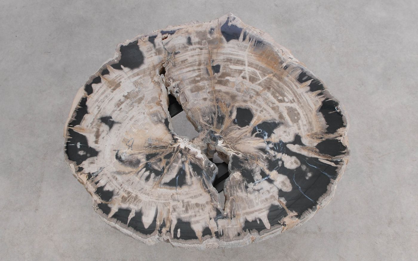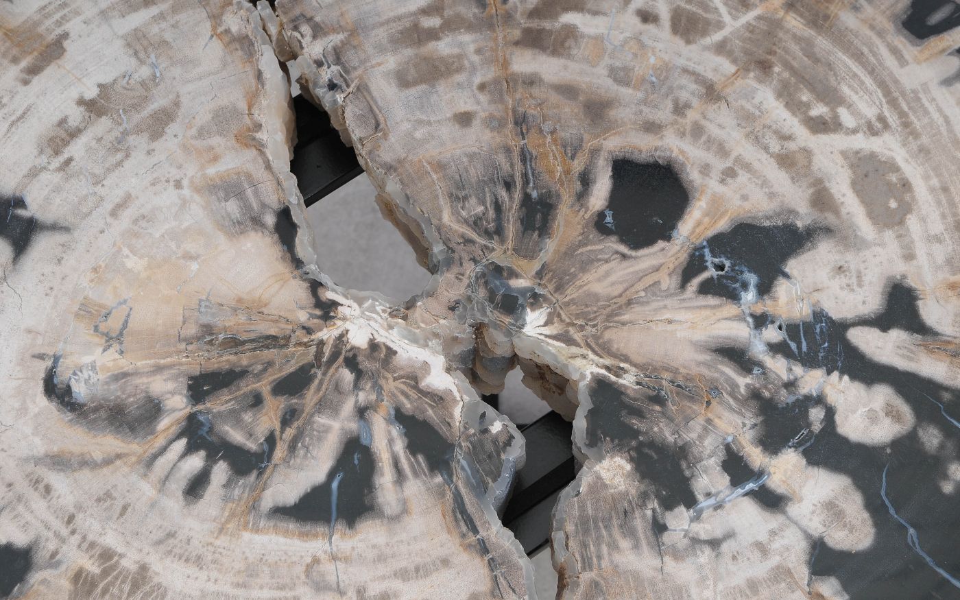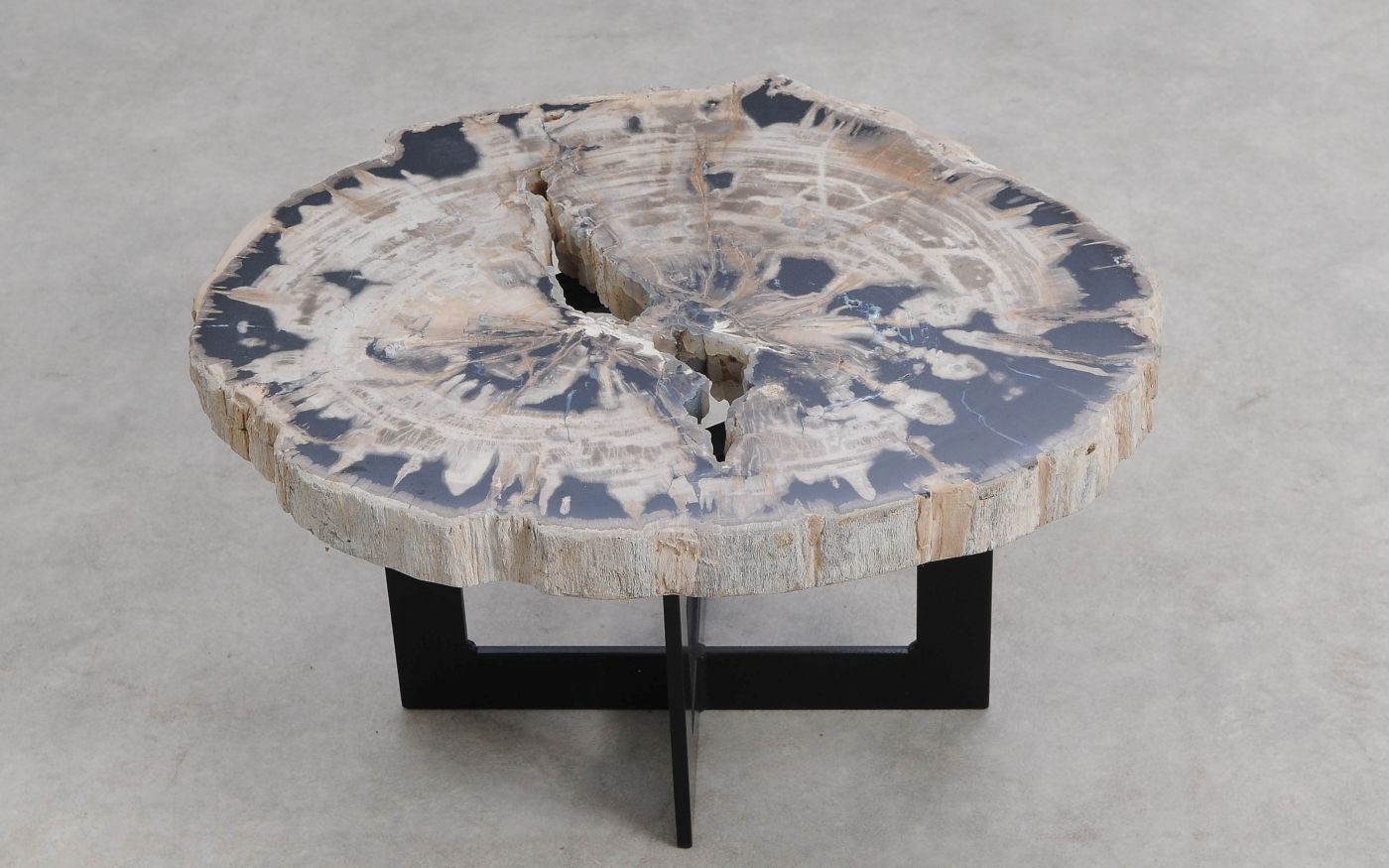 Deze unieke salontafel van versteend hout past in ieder interieur. Het tafelblad is gezaagd uit een grote versteende boom, die ongeveer 20 miljoen jaar geleden geleefd heeft. De kleuren zijn bepaald door de mineralen die het hout van deze boom vervangen hebben.