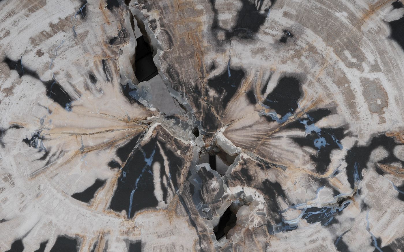 Deze unieke salontafel van versteend hout past in ieder interieur. Het tafelblad is gezaagd uit een grote versteende boom, die ongeveer 20 miljoen jaar geleden geleefd heeft. De kleuren zijn bepaald door de mineralen die het hout van deze boom vervangen hebben.
