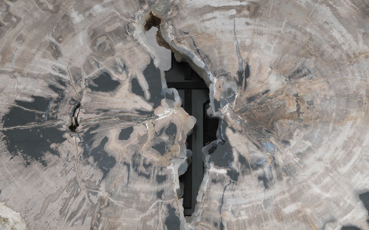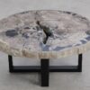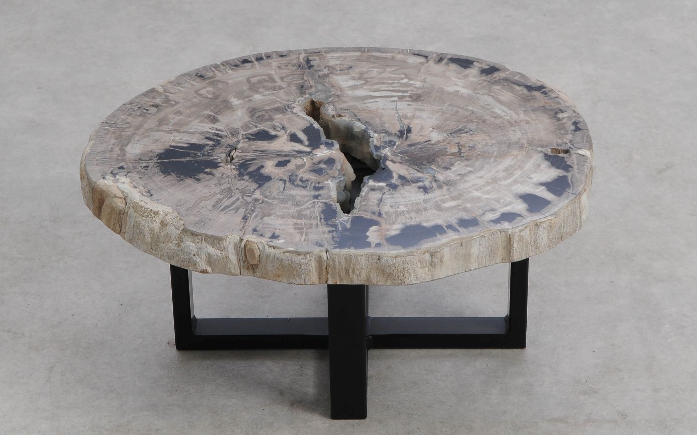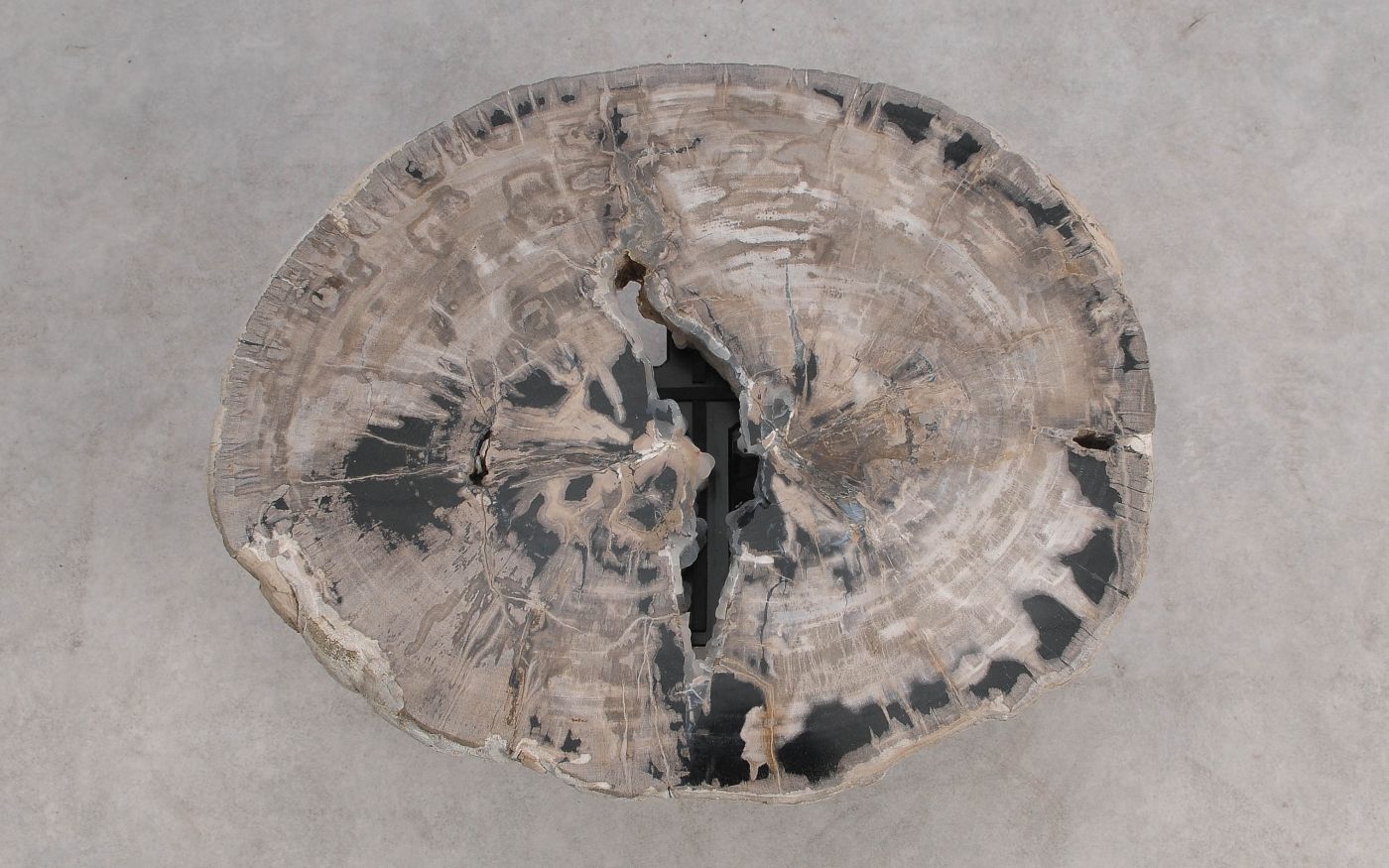 Deze unieke salontafel van versteend hout past in ieder interieur. Het tafelblad is gezaagd uit een grote versteende boom, die ongeveer 20 miljoen jaar geleden geleefd heeft. De kleuren zijn bepaald door de mineralen die het hout van deze boom vervangen hebben.