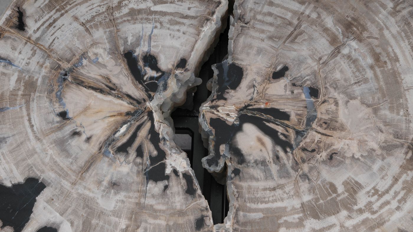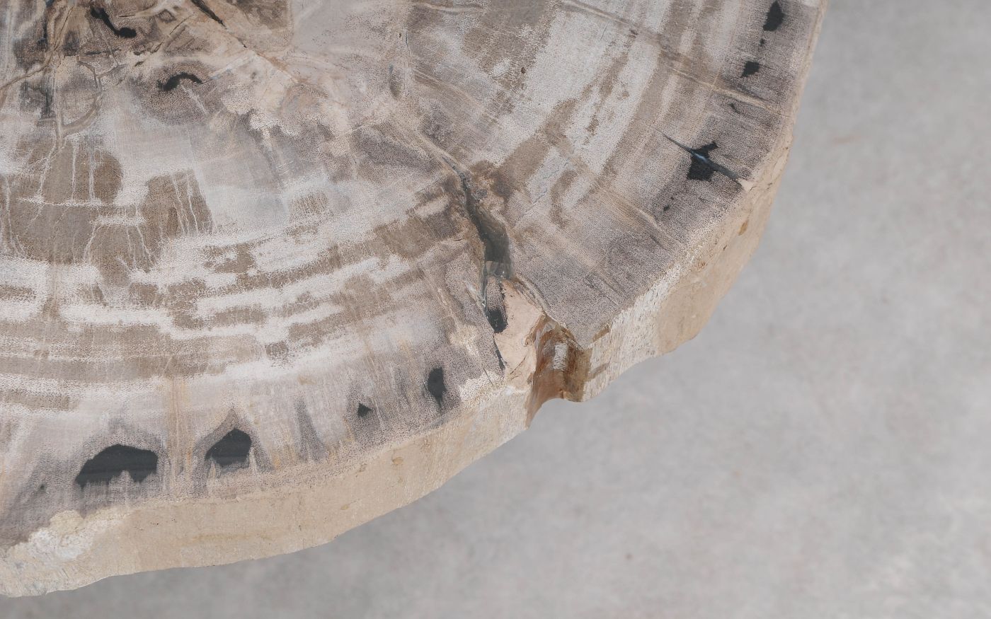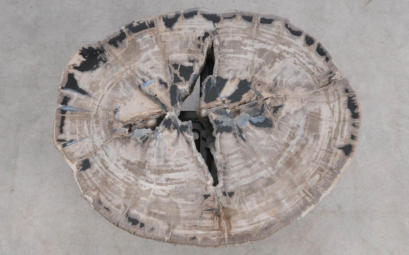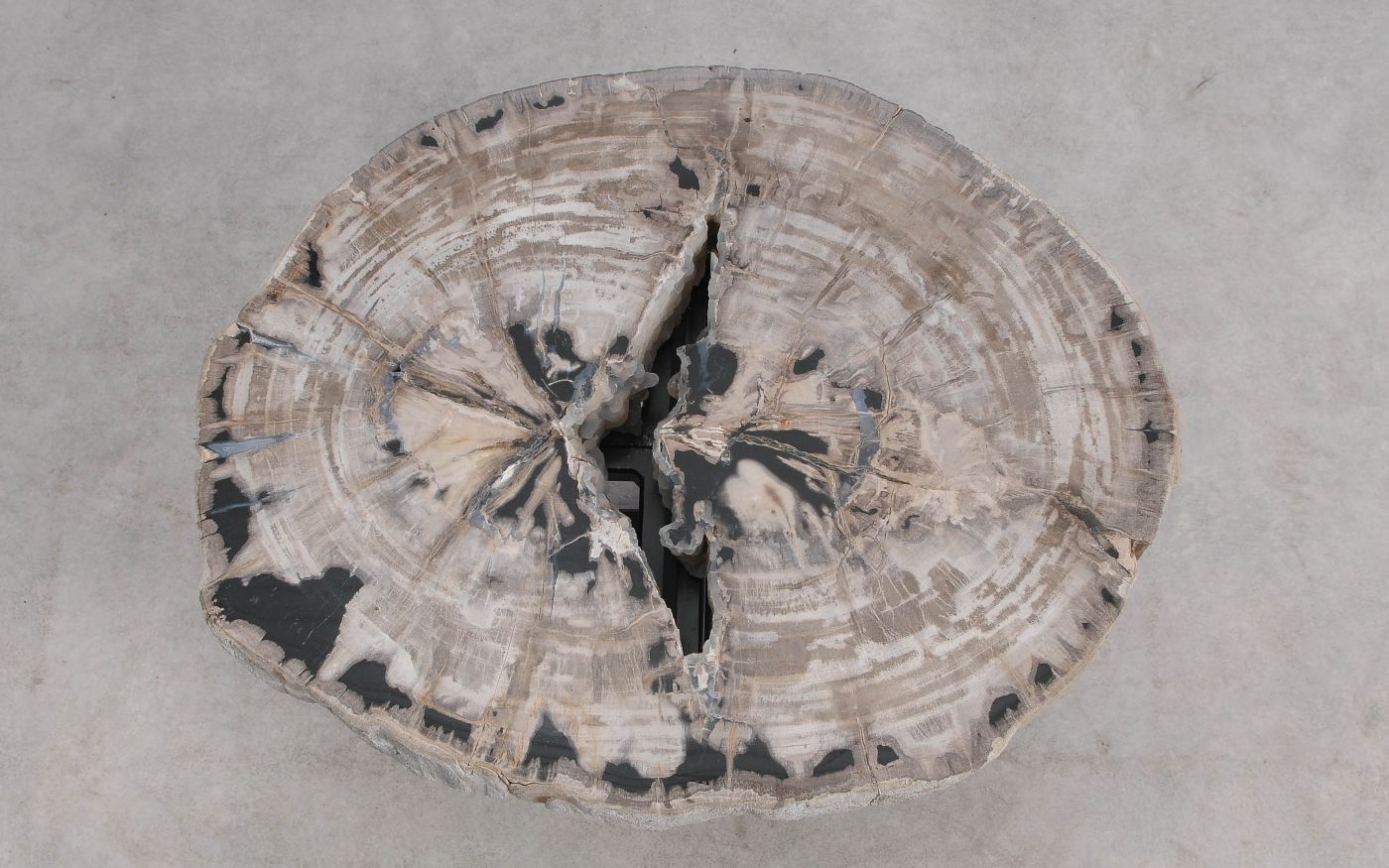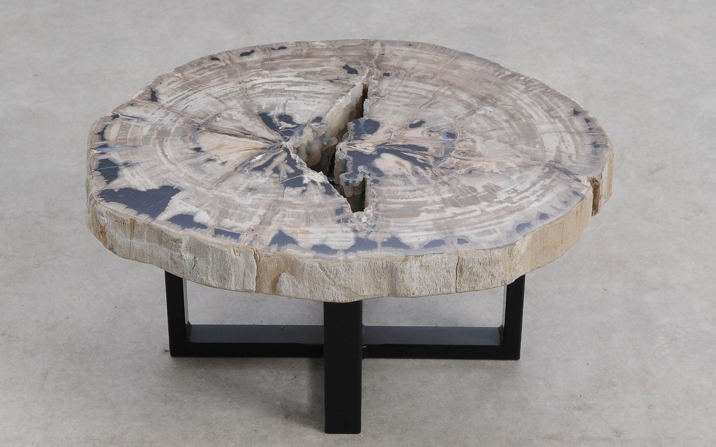 Deze unieke salontafel van versteend hout past in ieder interieur. Het tafelblad is gezaagd uit een grote versteende boom, die ongeveer 20 miljoen jaar geleden geleefd heeft. De kleuren zijn bepaald door de mineralen die het hout van deze boom vervangen hebben.