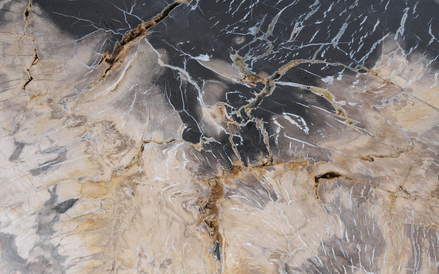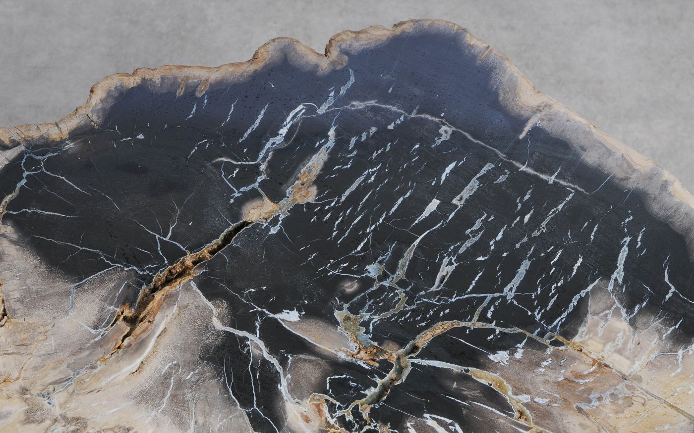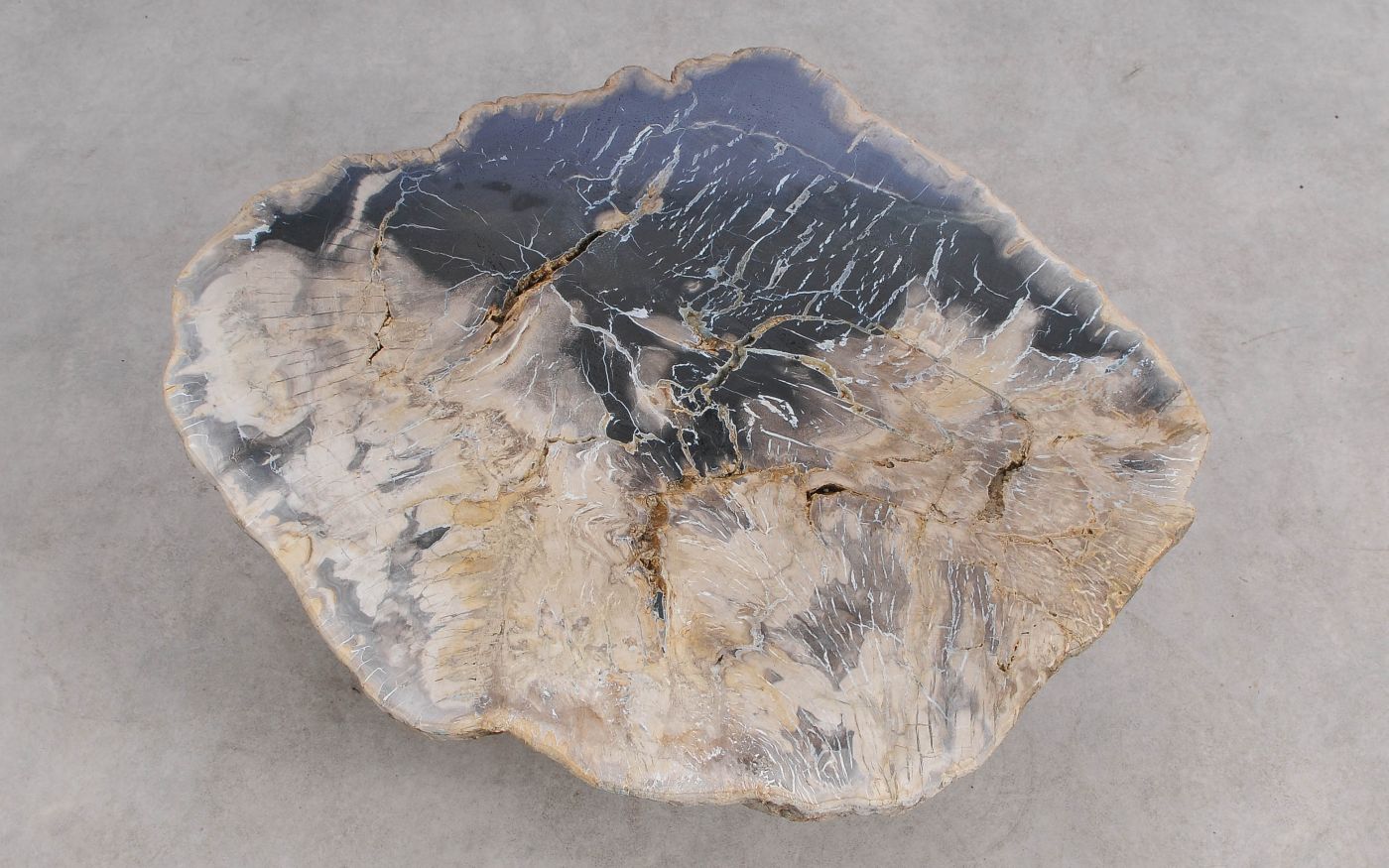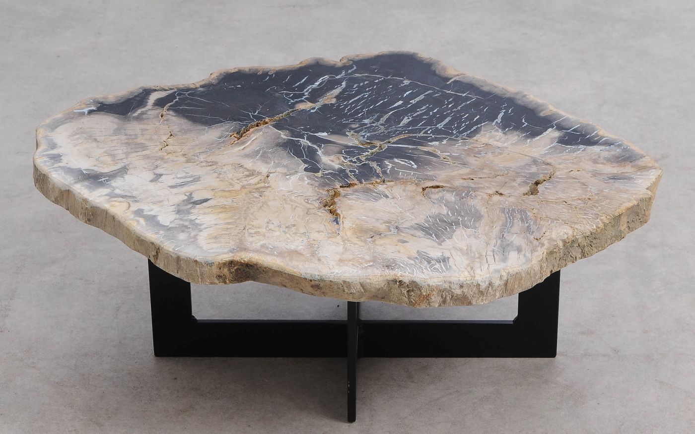 Deze unieke salontafel van versteend hout past in ieder interieur. Het tafelblad is gezaagd uit een grote versteende boom, die ongeveer 20 miljoen jaar geleden geleefd heeft. De kleuren zijn bepaald door de mineralen die het hout van deze boom vervangen hebben.