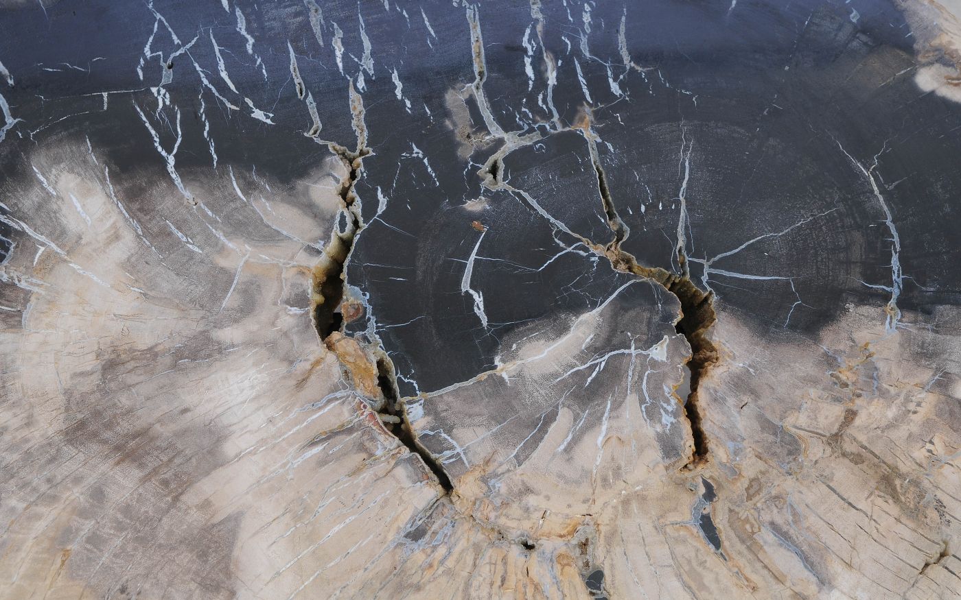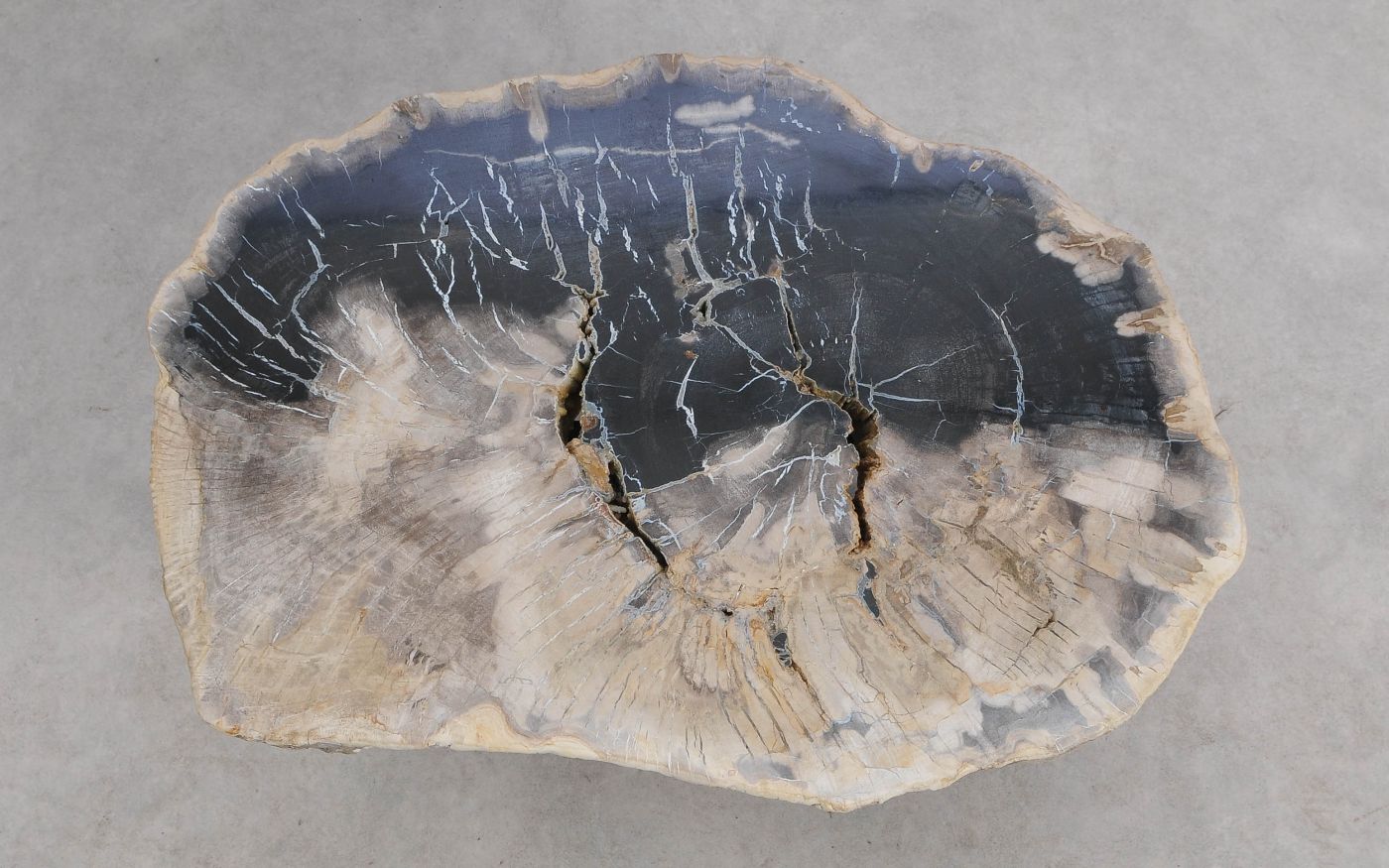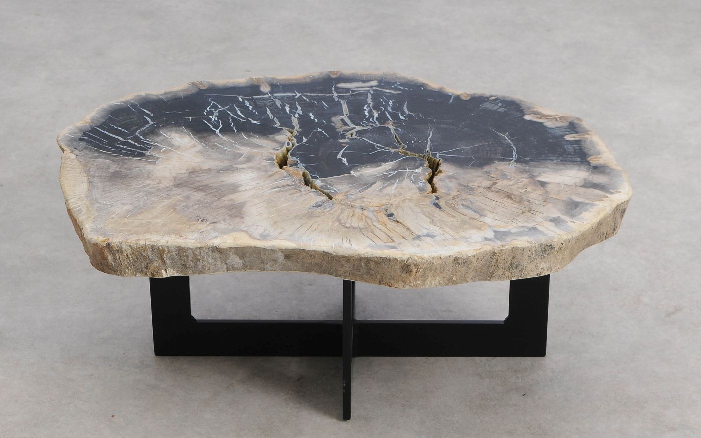 Deze unieke salontafel van versteend hout past in ieder interieur. Het tafelblad is gezaagd uit een grote versteende boom, die ongeveer 20 miljoen jaar geleden geleefd heeft. De kleuren zijn bepaald door de mineralen die het hout van deze boom vervangen hebben.