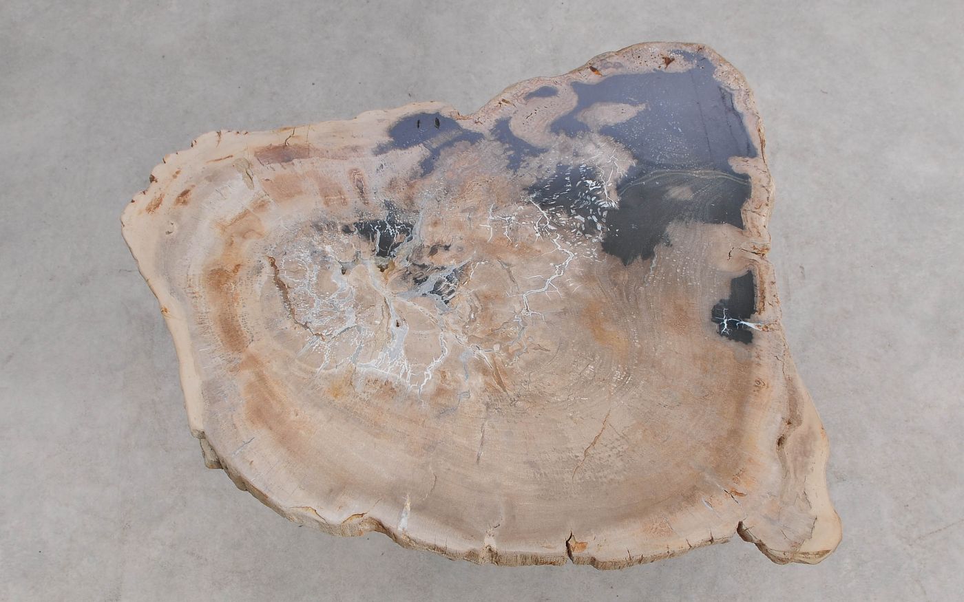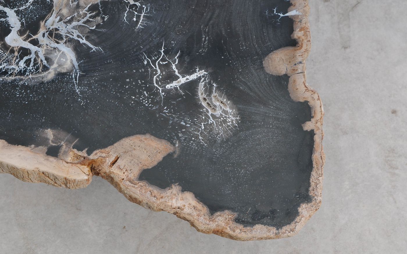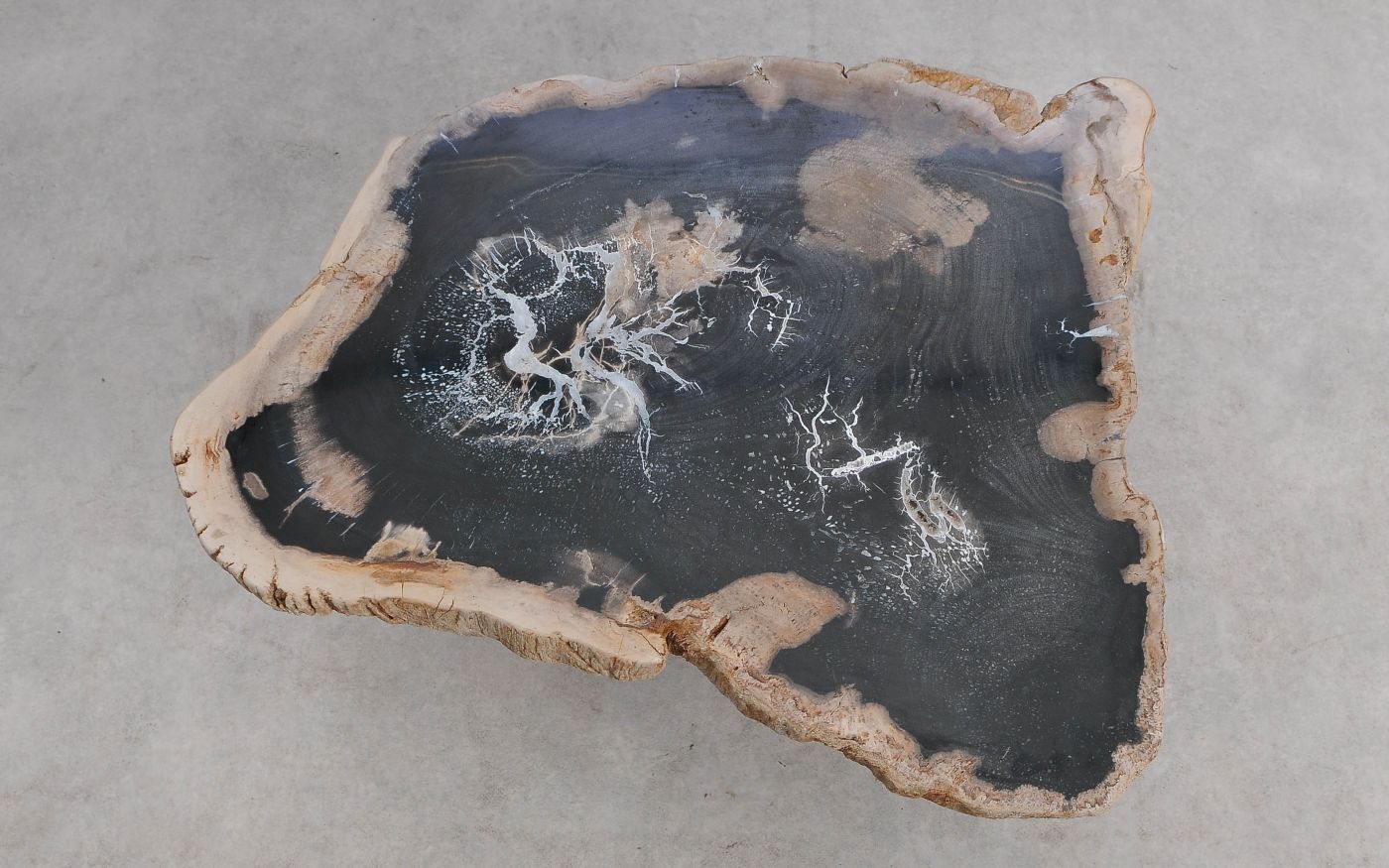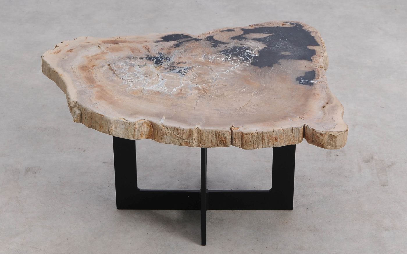 Deze unieke salontafel van versteend hout past in ieder interieur. Het tafelblad is gezaagd uit een grote versteende boom, die ongeveer 20 miljoen jaar geleden geleefd heeft. De kleuren zijn bepaald door de mineralen die het hout van deze boom vervangen hebben.