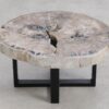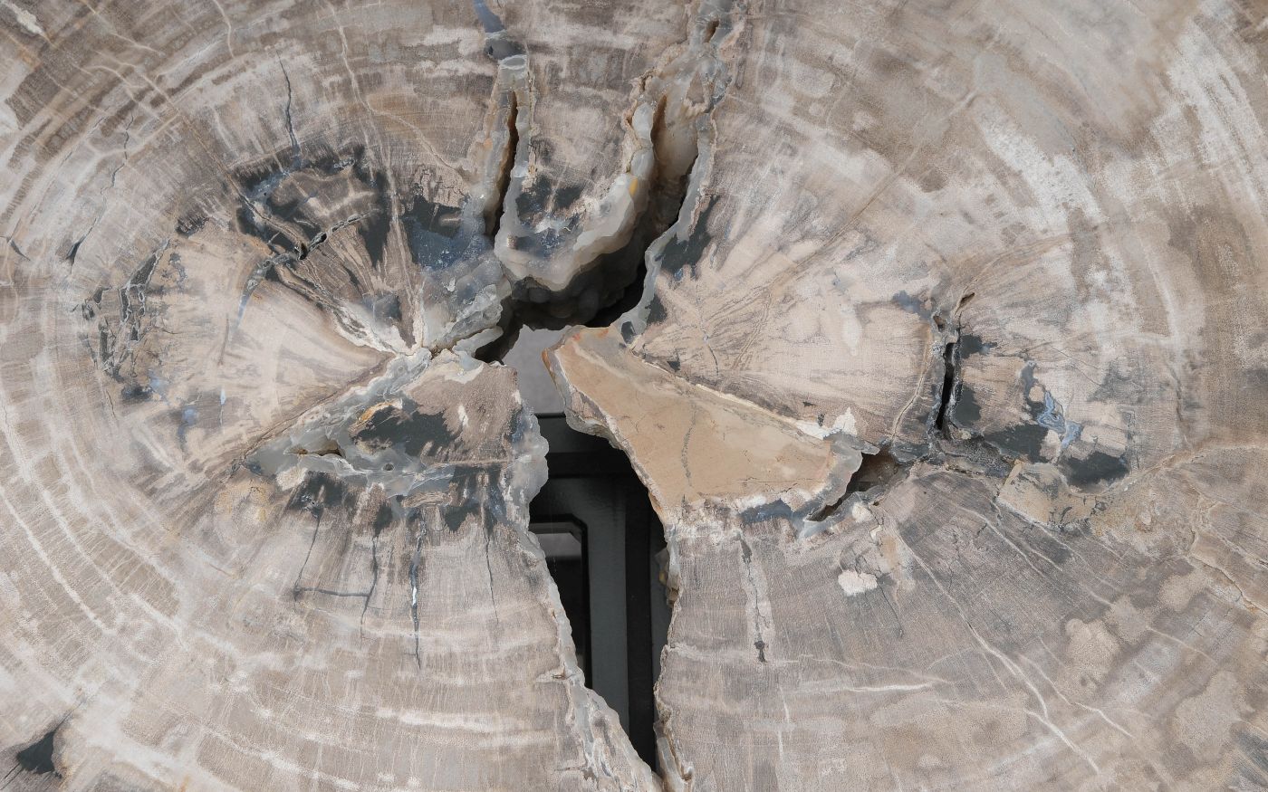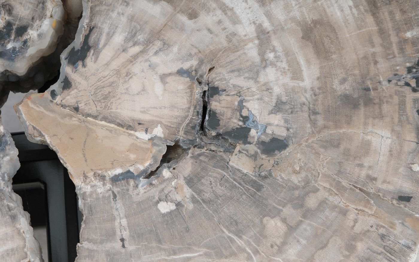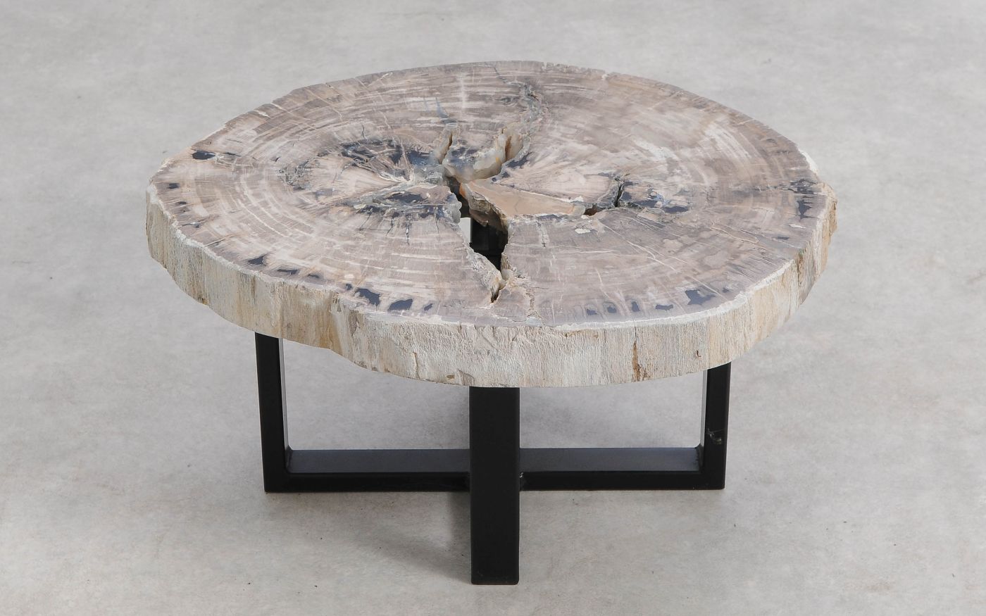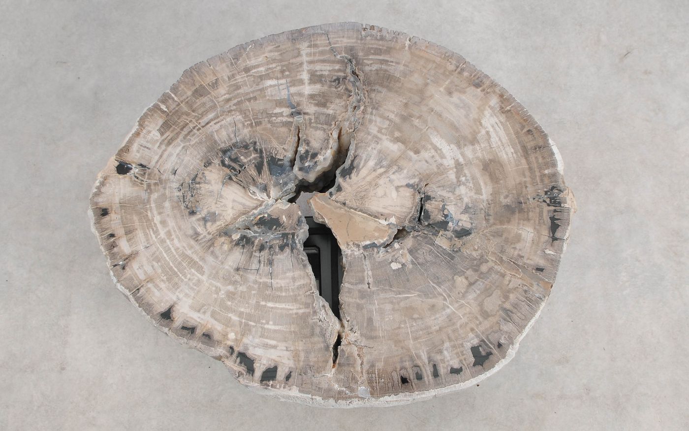 Deze unieke salontafel van versteend hout past in ieder interieur. Het tafelblad is gezaagd uit een grote versteende boom, die ongeveer 20 miljoen jaar geleden geleefd heeft. De kleuren zijn bepaald door de mineralen die het hout van deze boom vervangen hebben.