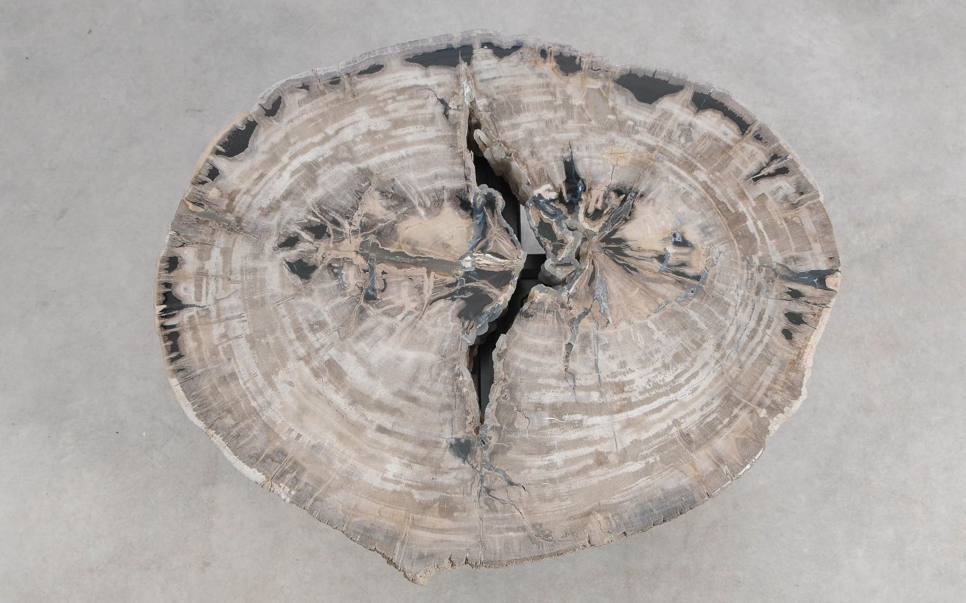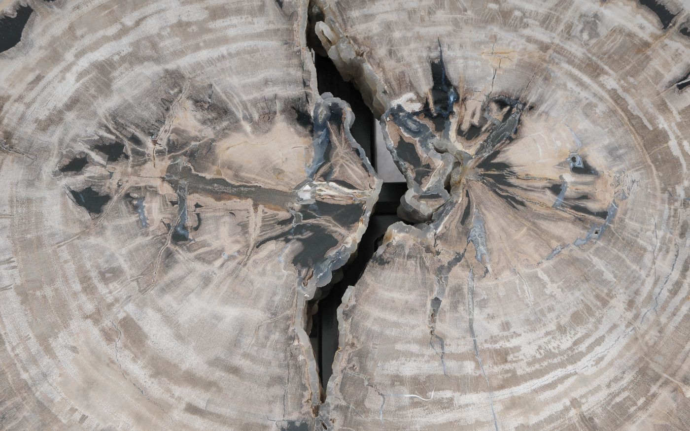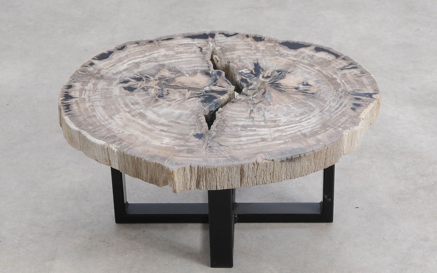 Deze unieke salontafel van versteend hout past in ieder interieur. Het tafelblad is gezaagd uit een grote versteende boom, die ongeveer 20 miljoen jaar geleden geleefd heeft. De kleuren zijn bepaald door de mineralen die het hout van deze boom vervangen hebben.