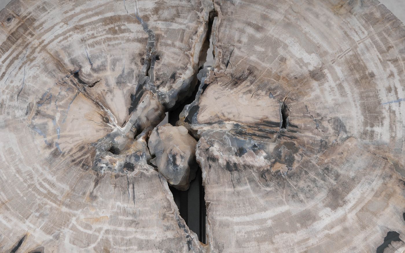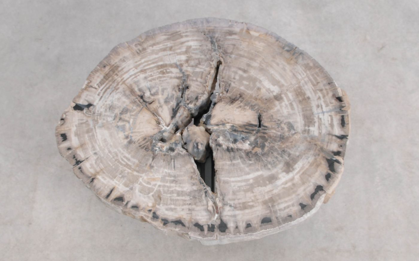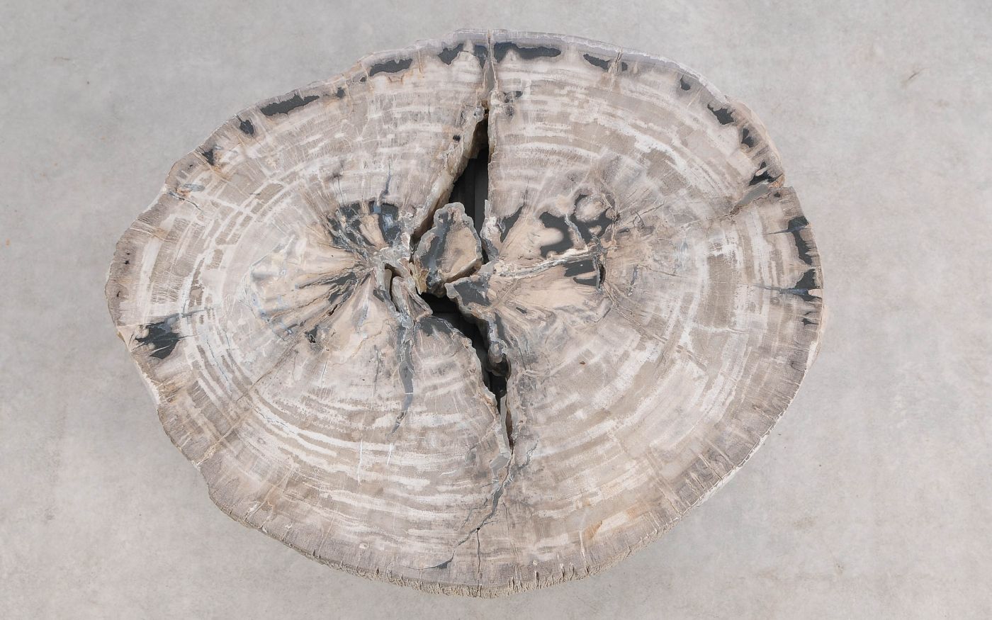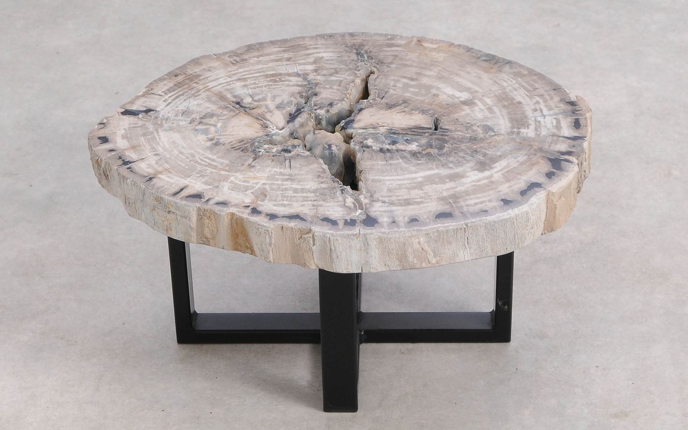 Deze unieke salontafel van versteend hout past in ieder interieur. Het tafelblad is gezaagd uit een grote versteende boom, die ongeveer 20 miljoen jaar geleden geleefd heeft. De kleuren zijn bepaald door de mineralen die het hout van deze boom vervangen hebben.