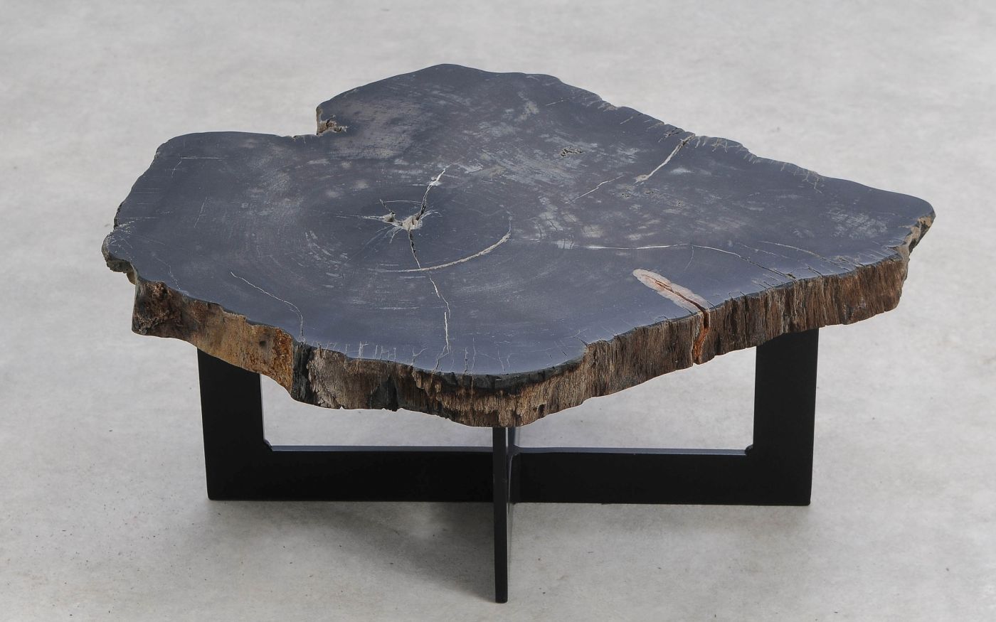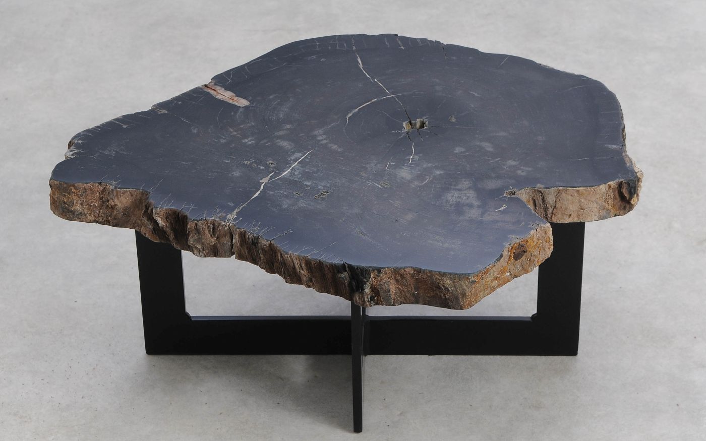 Deze unieke salontafel van versteend hout past in ieder interieur. Het tafelblad is gezaagd uit een grote versteende boom, die ongeveer 20 miljoen jaar geleden geleefd heeft. De kleuren zijn bepaald door de mineralen die het hout van deze boom vervangen hebben.