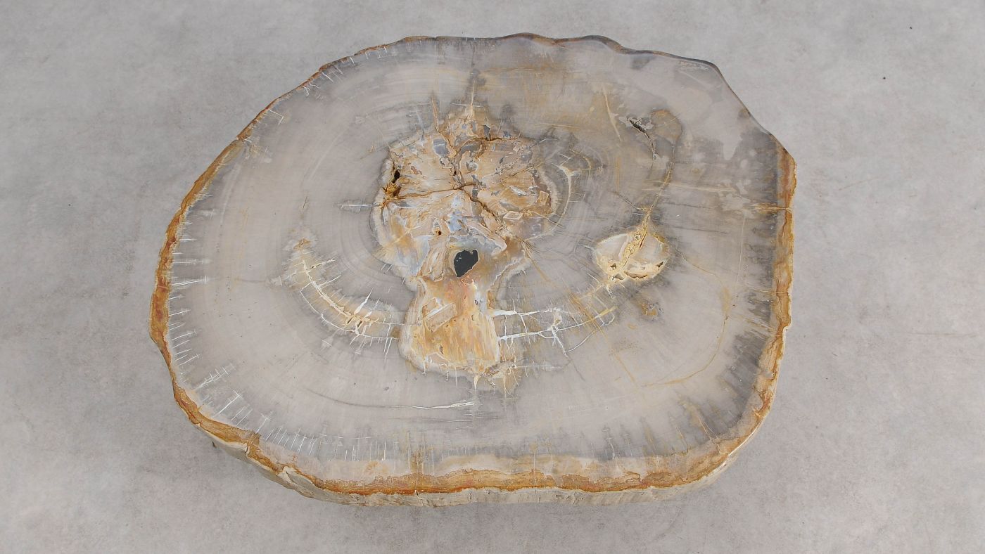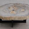 Deze unieke salontafel van versteend hout past in ieder interieur. Het tafelblad is gezaagd uit een grote versteende boom, die ongeveer 20 miljoen jaar geleden geleefd heeft. De kleuren zijn bepaald door de mineralen die het hout van deze boom vervangen hebben.