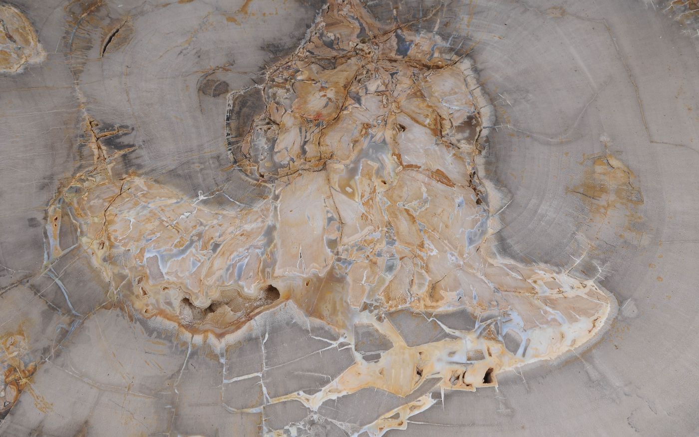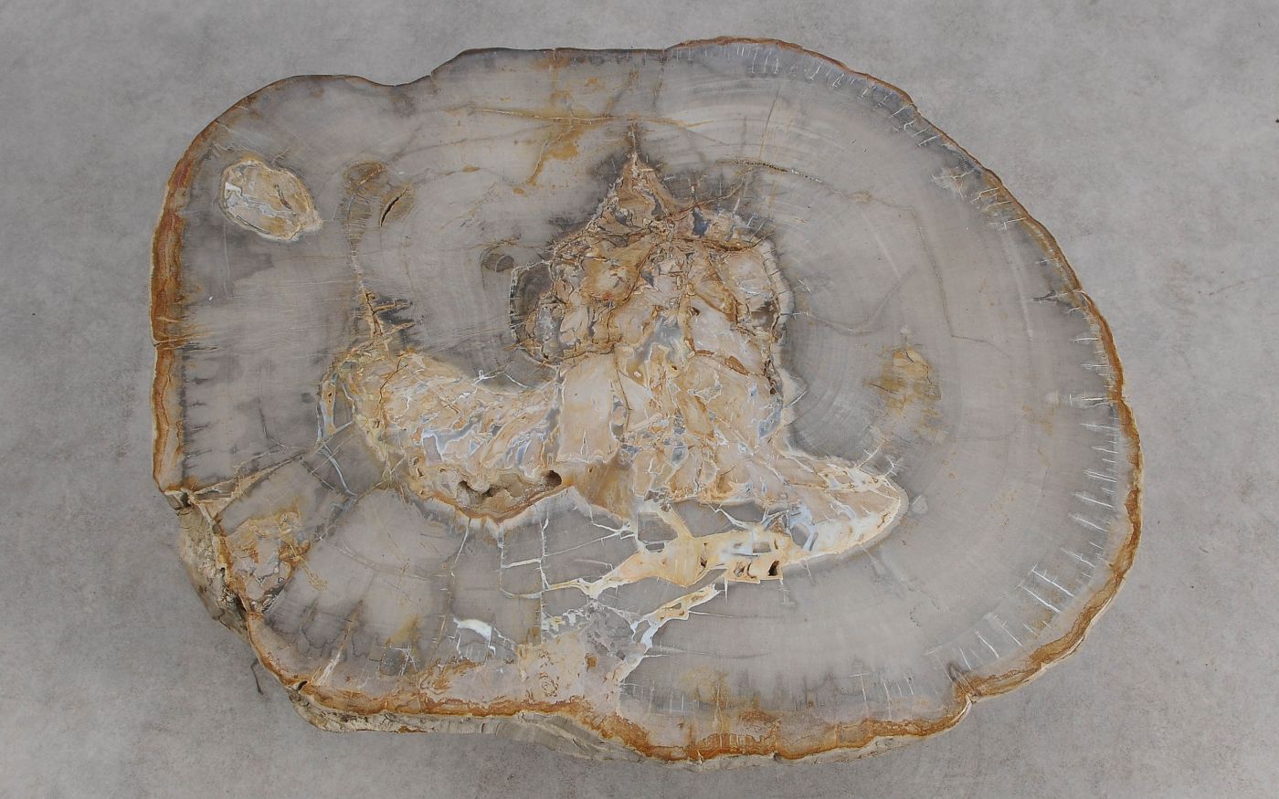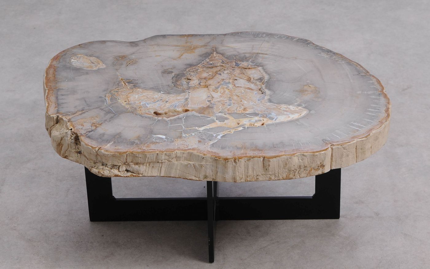 Deze unieke salontafel van versteend hout past in ieder interieur. Het tafelblad is gezaagd uit een grote versteende boom, die ongeveer 20 miljoen jaar geleden geleefd heeft. De kleuren zijn bepaald door de mineralen die het hout van deze boom vervangen hebben.