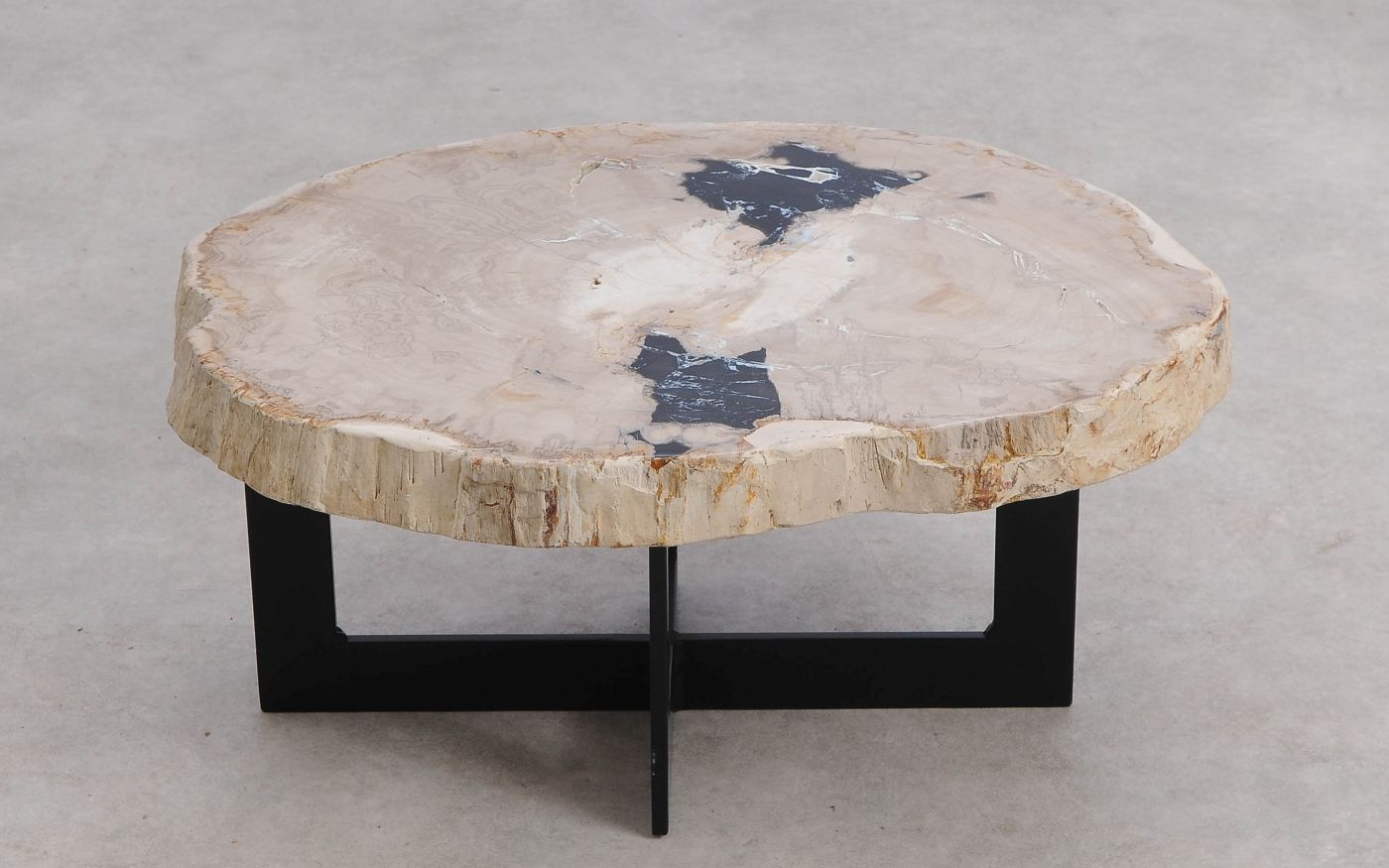 Deze unieke salontafel van versteend hout past in ieder interieur. Het tafelblad is gezaagd uit een grote versteende boom, die ongeveer 20 miljoen jaar geleden geleefd heeft. De kleuren zijn bepaald door de mineralen die het hout van deze boom vervangen hebben.