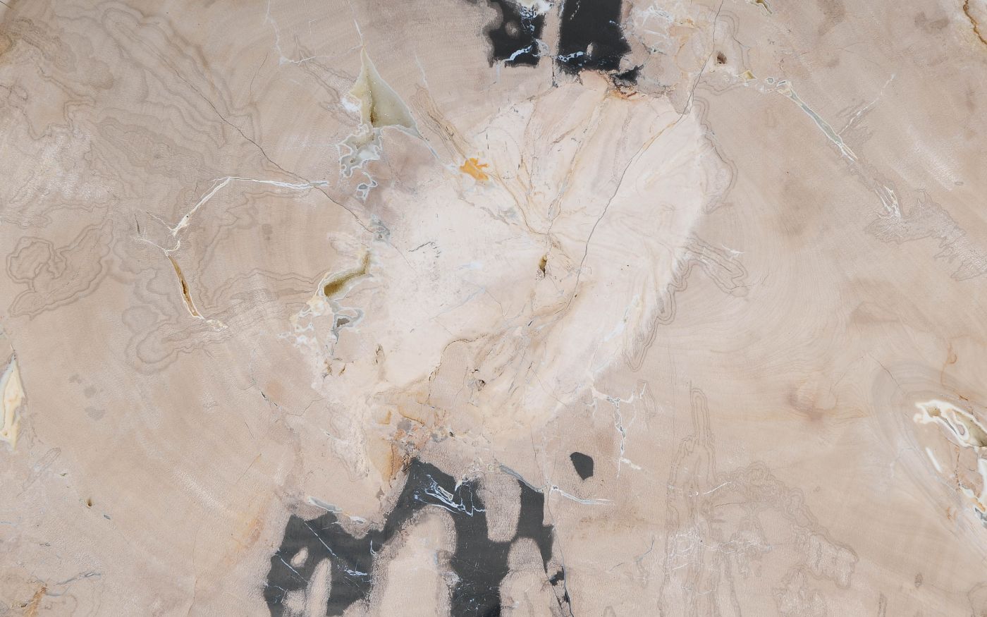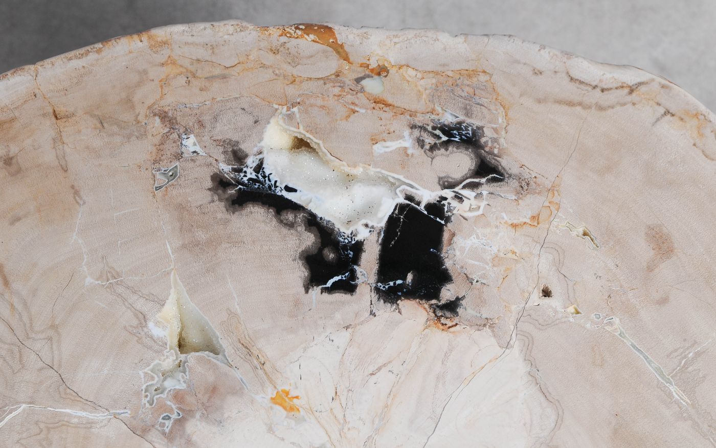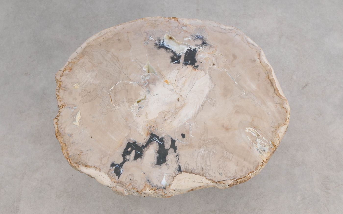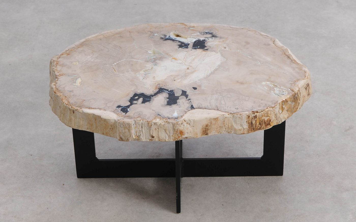 Deze unieke salontafel van versteend hout past in ieder interieur. Het tafelblad is gezaagd uit een grote versteende boom, die ongeveer 20 miljoen jaar geleden geleefd heeft. De kleuren zijn bepaald door de mineralen die het hout van deze boom vervangen hebben.