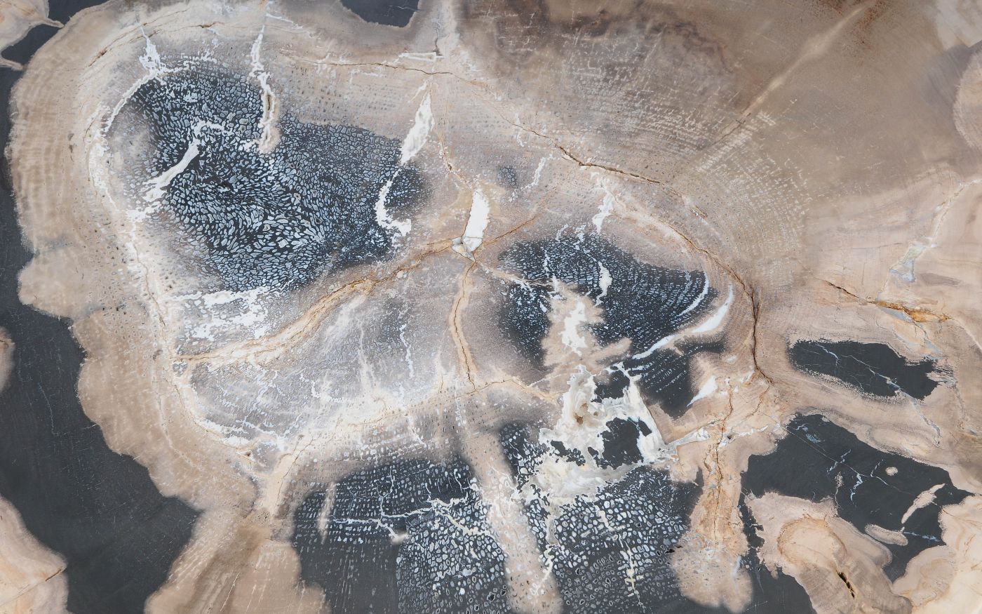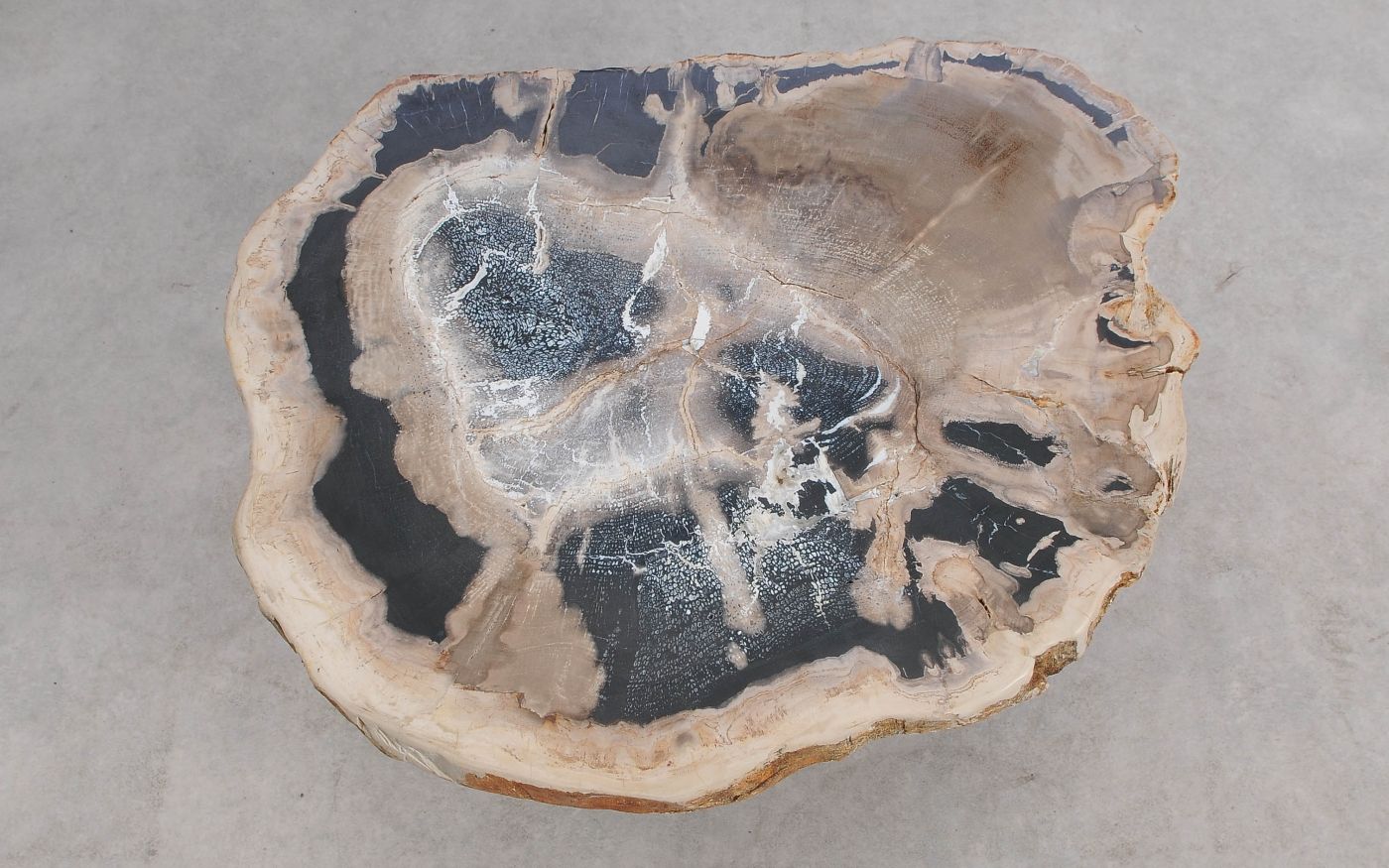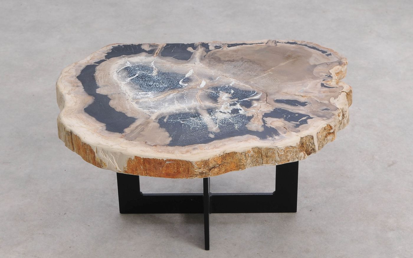 Deze unieke salontafel van versteend hout past in ieder interieur. Het tafelblad is gezaagd uit een grote versteende boom, die ongeveer 20 miljoen jaar geleden geleefd heeft. De kleuren zijn bepaald door de mineralen die het hout van deze boom vervangen hebben.