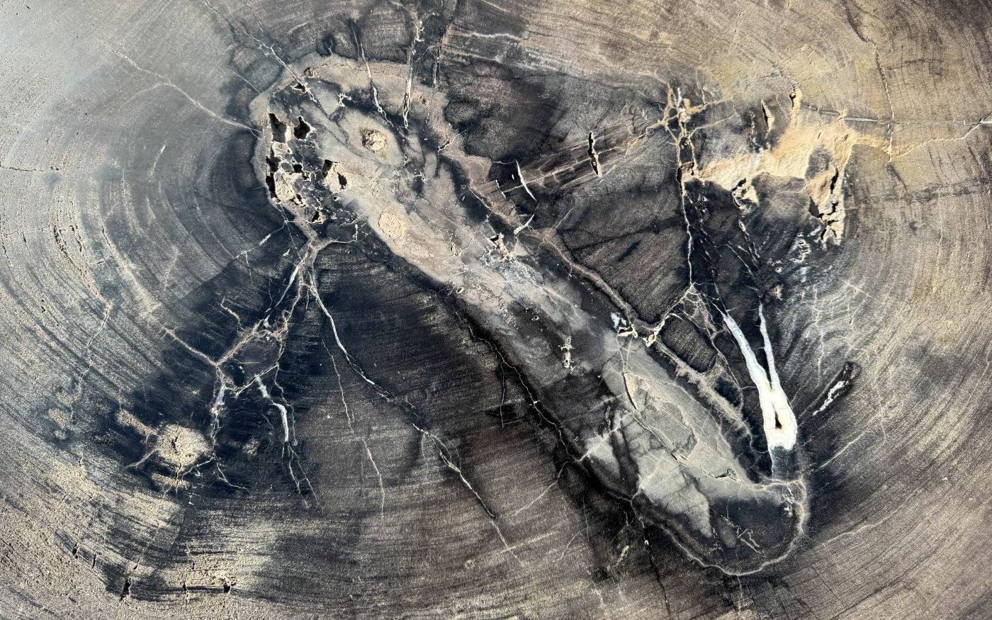 Deze unieke salontafel van versteend hout past in ieder interieur. Het tafelblad is gezaagd uit een grote versteende boom, die ongeveer 20 miljoen jaar geleden geleefd heeft. De kleuren zijn bepaald door de mineralen die het hout van deze boom vervangen hebben.