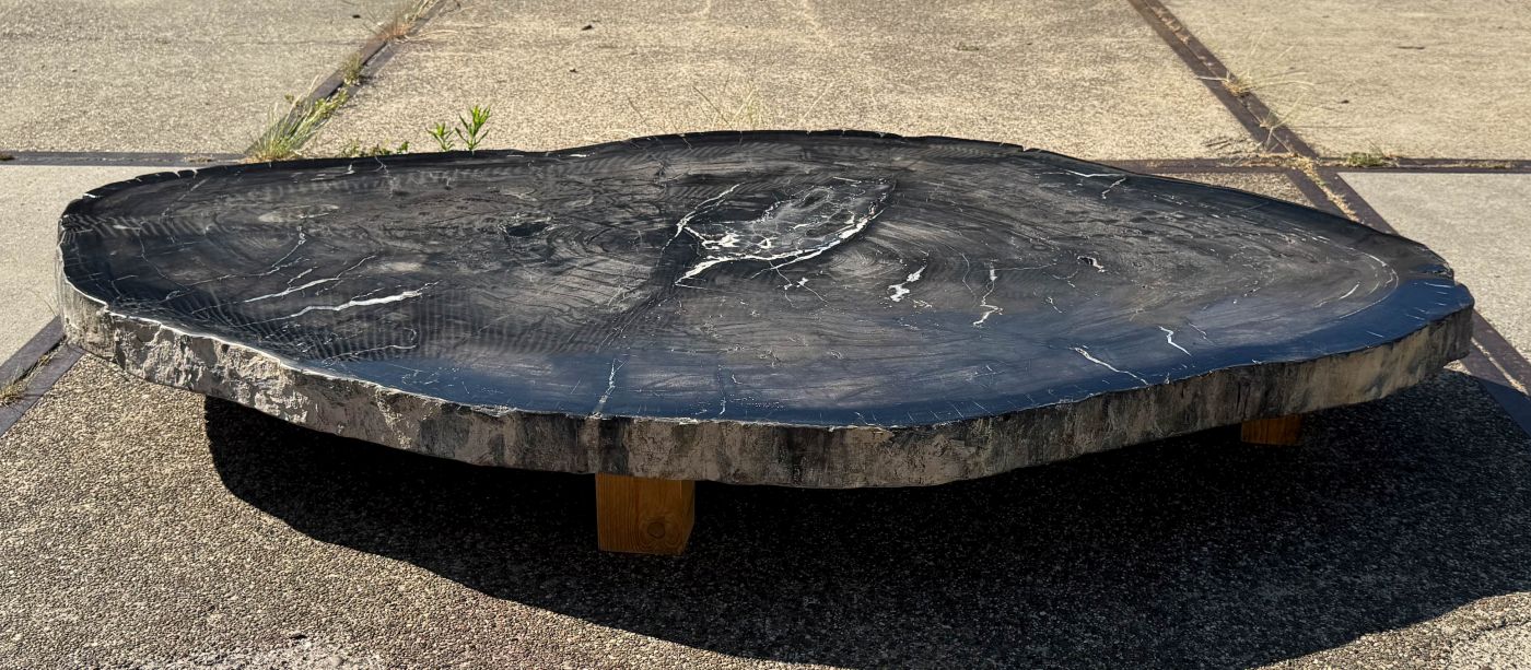 Deze unieke salontafel van versteend hout past in ieder interieur. Het tafelblad is gezaagd uit een grote versteende boom, die ongeveer 20 miljoen jaar geleden geleefd heeft. De kleuren zijn bepaald door de mineralen die het hout van deze boom vervangen hebben.