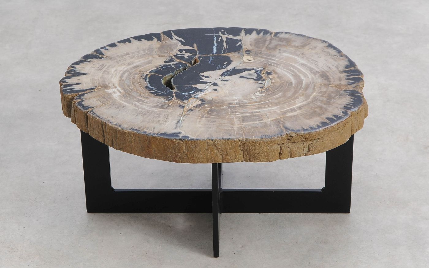 Deze unieke salontafel van versteend hout past in ieder interieur. Het tafelblad is gezaagd uit een grote versteende boom, die ongeveer 20 miljoen jaar geleden geleefd heeft. De kleuren zijn bepaald door de mineralen die het hout van deze boom vervangen hebben.