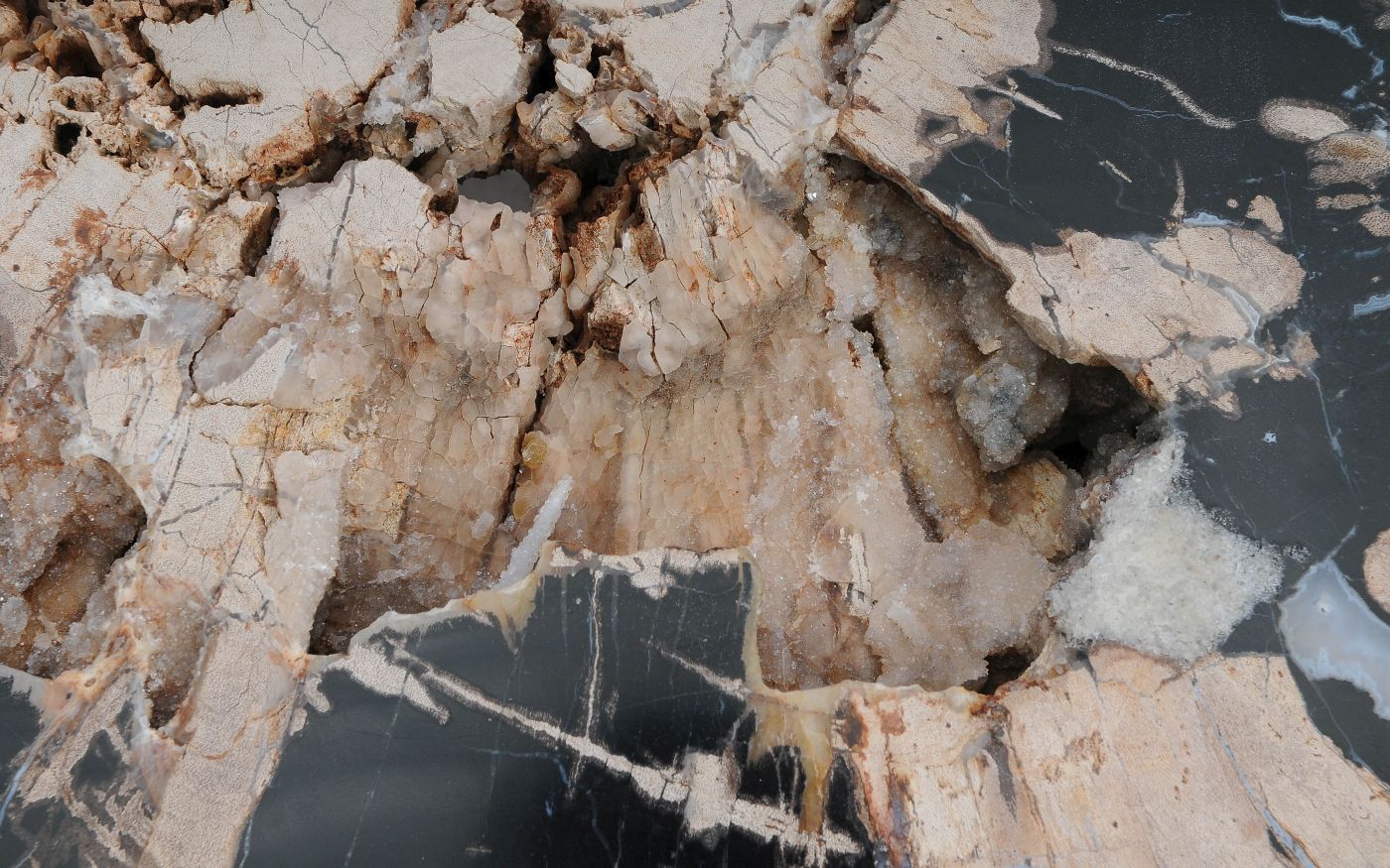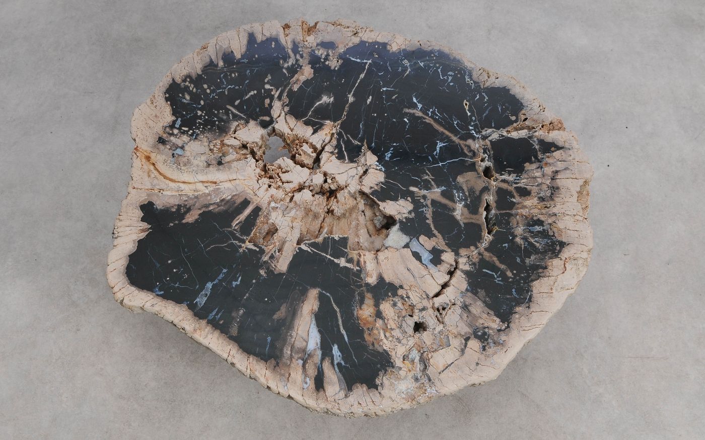 Deze unieke salontafel van versteend hout past in ieder interieur. Het tafelblad is gezaagd uit een grote versteende boom, die ongeveer 20 miljoen jaar geleden geleefd heeft. De kleuren zijn bepaald door de mineralen die het hout van deze boom vervangen hebben.