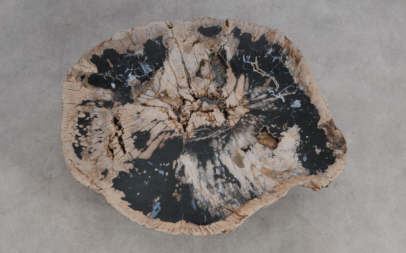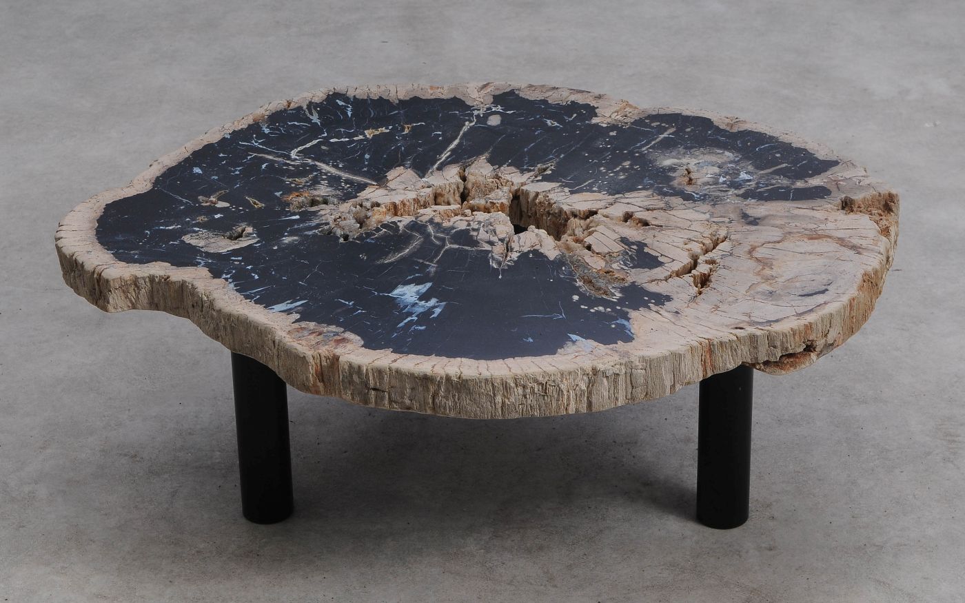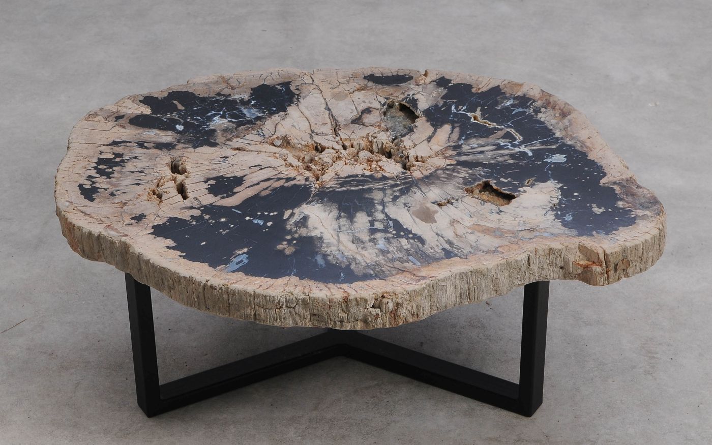 Deze unieke salontafel van versteend hout past in ieder interieur. Het tafelblad is gezaagd uit een grote versteende boom, die ongeveer 20 miljoen jaar geleden geleefd heeft. De kleuren zijn bepaald door de mineralen die het hout van deze boom vervangen hebben.